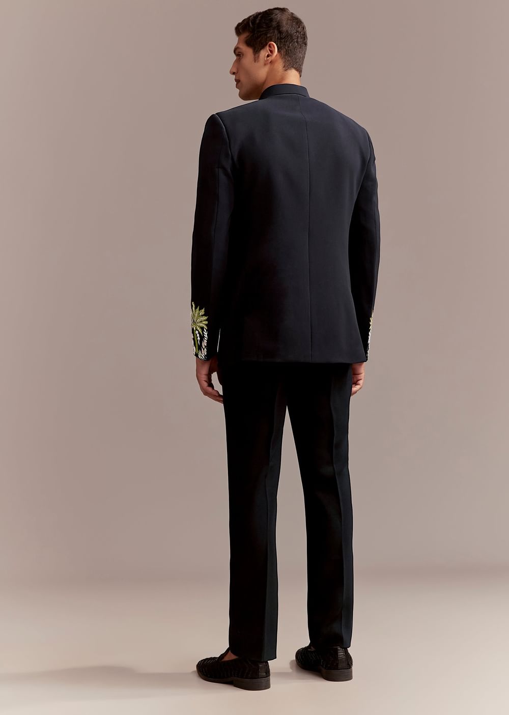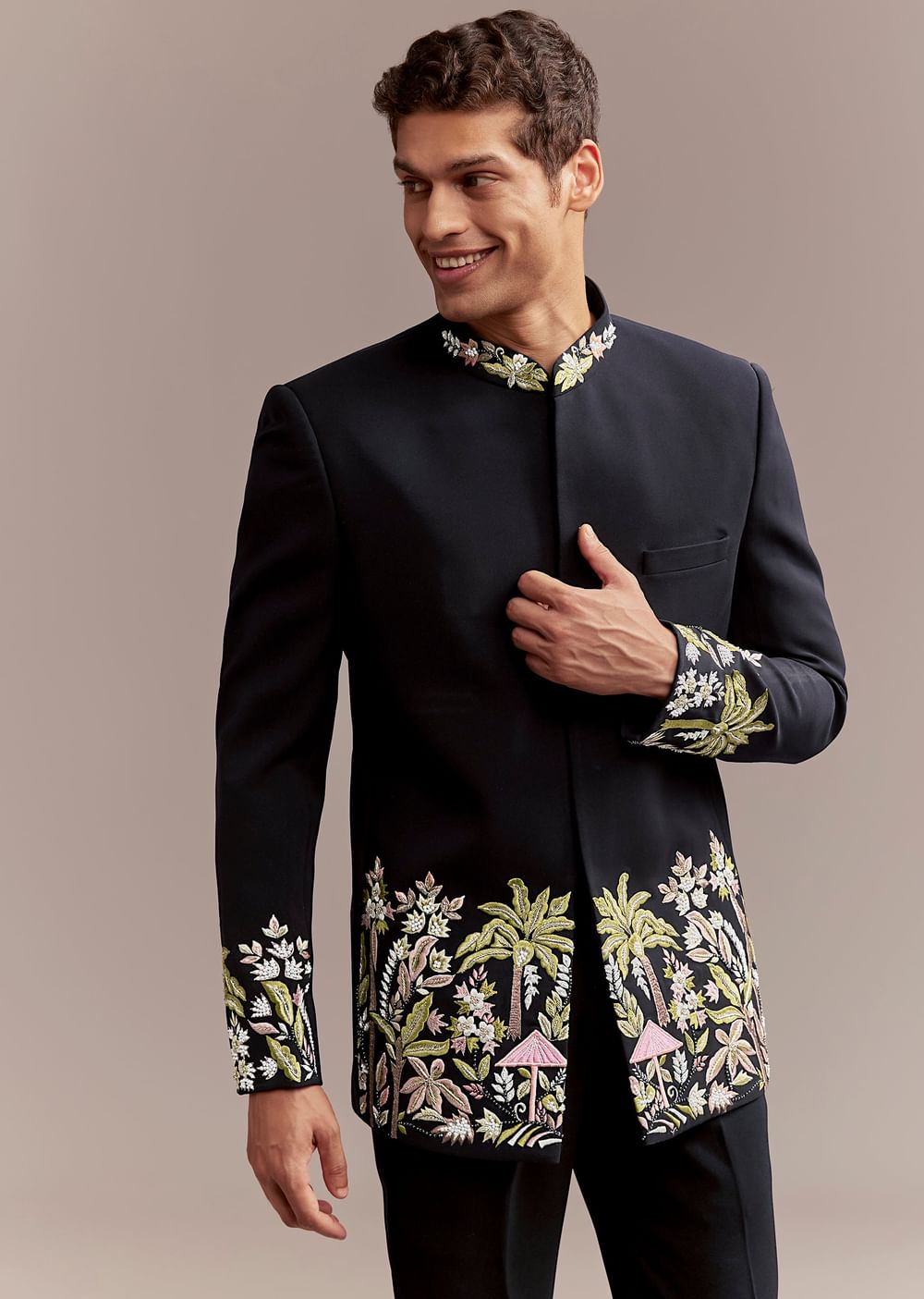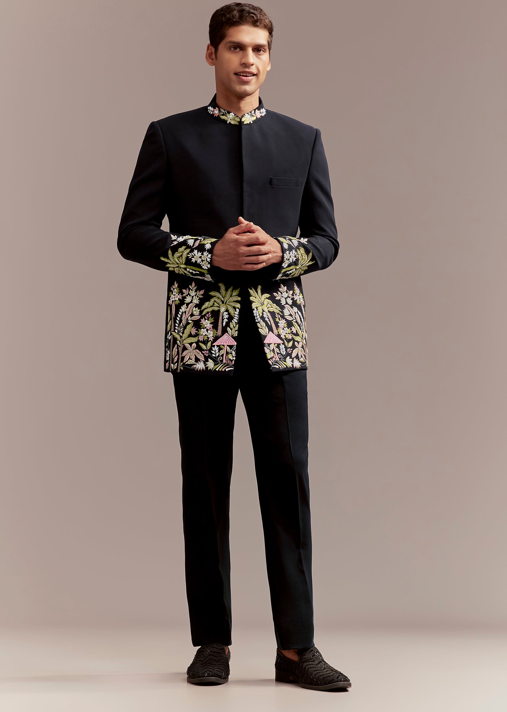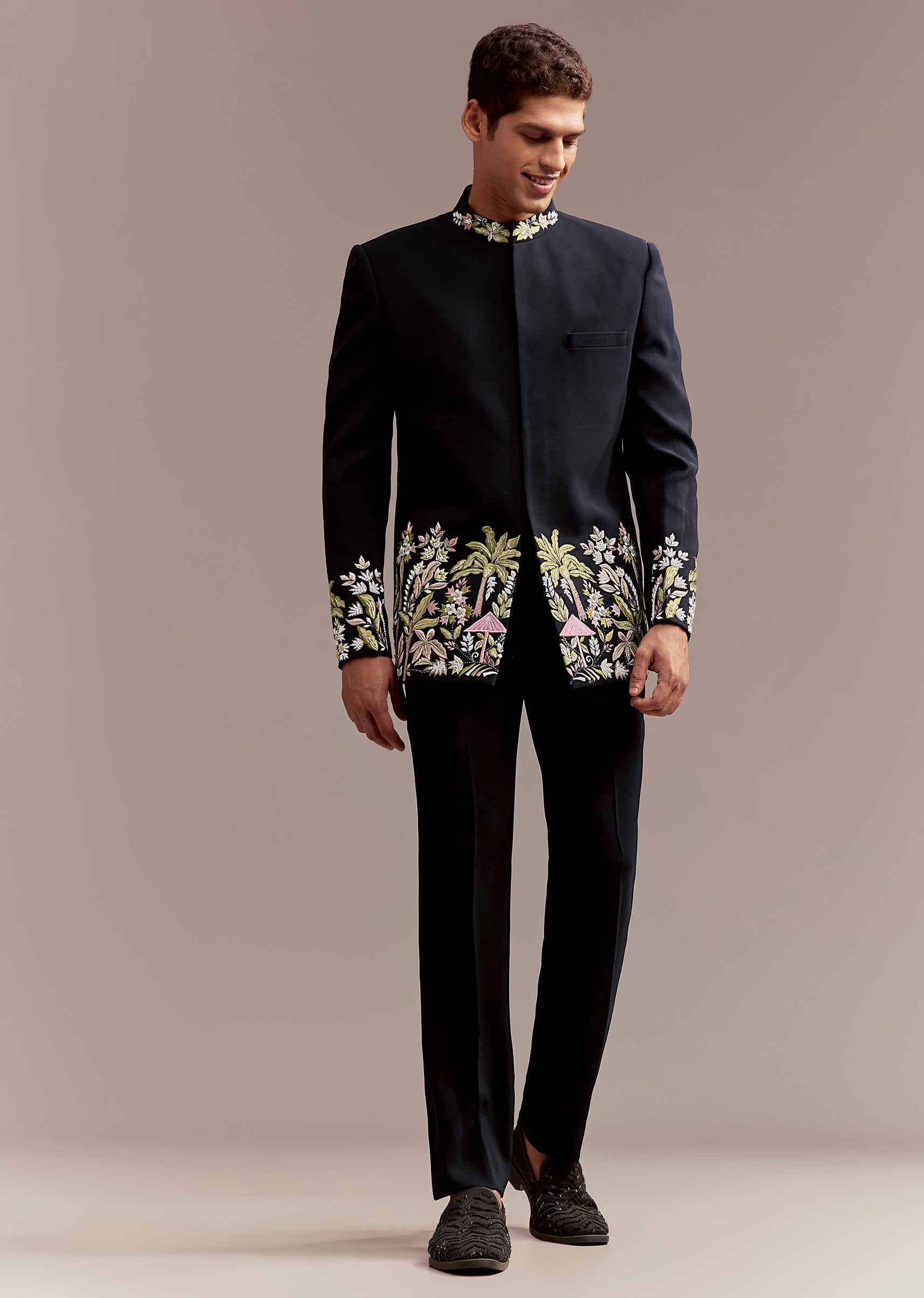 A vivid yet composed energy arrives as this navy blue men’s Jodhpuri suit in suiting fabric frames the silhouette. Intricate tropical themed florals and palm motifs worked in vibrant resham and zardosi with defined cut work deliver heritage craft in a modern palette. Ideal for sangeet or engagement, it leaves a groomsman or the groom’s father looking refined without overwhelming the moment. Awarded as the Most Trusted Brand, we're delivering styles you love, just as promised.