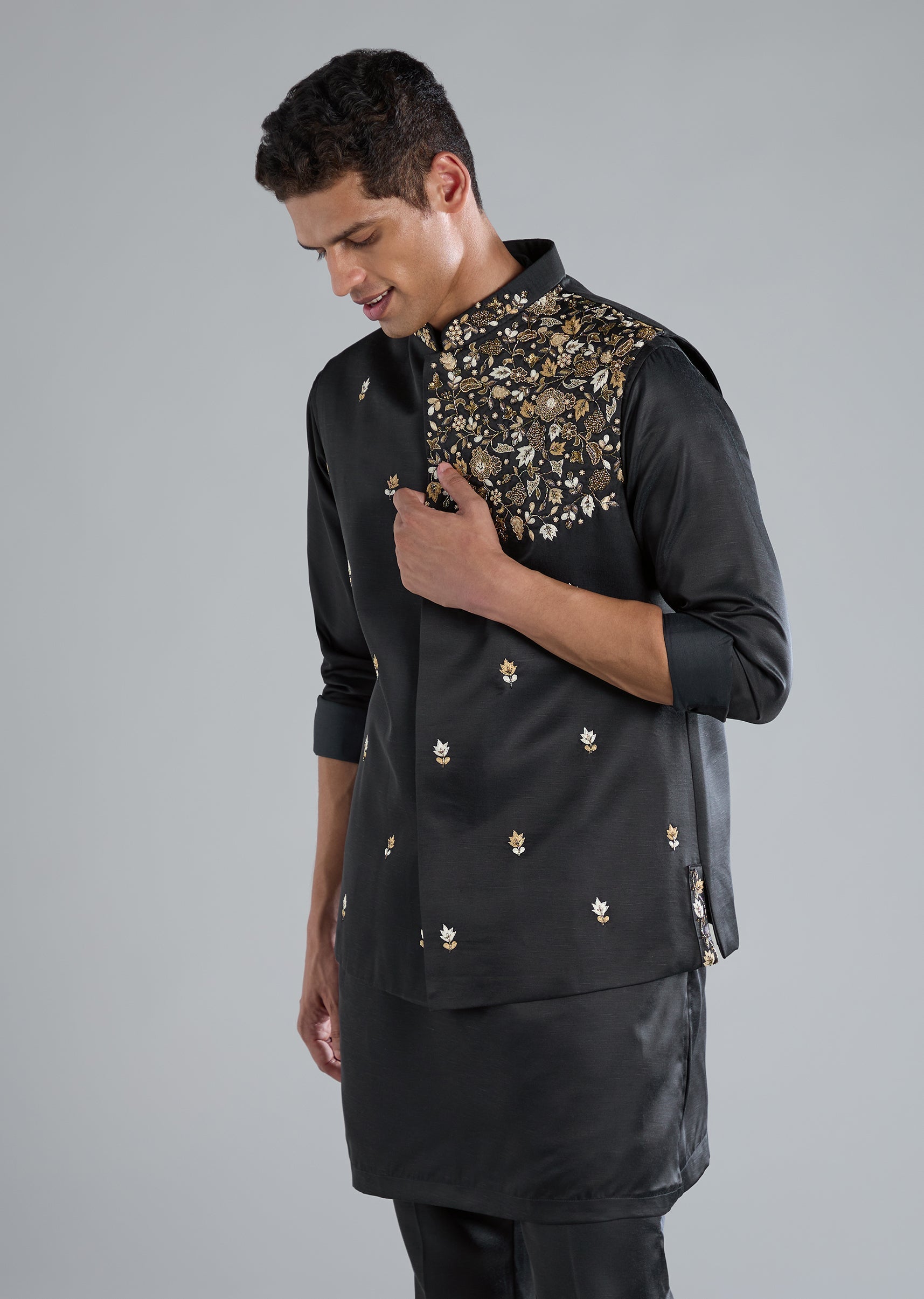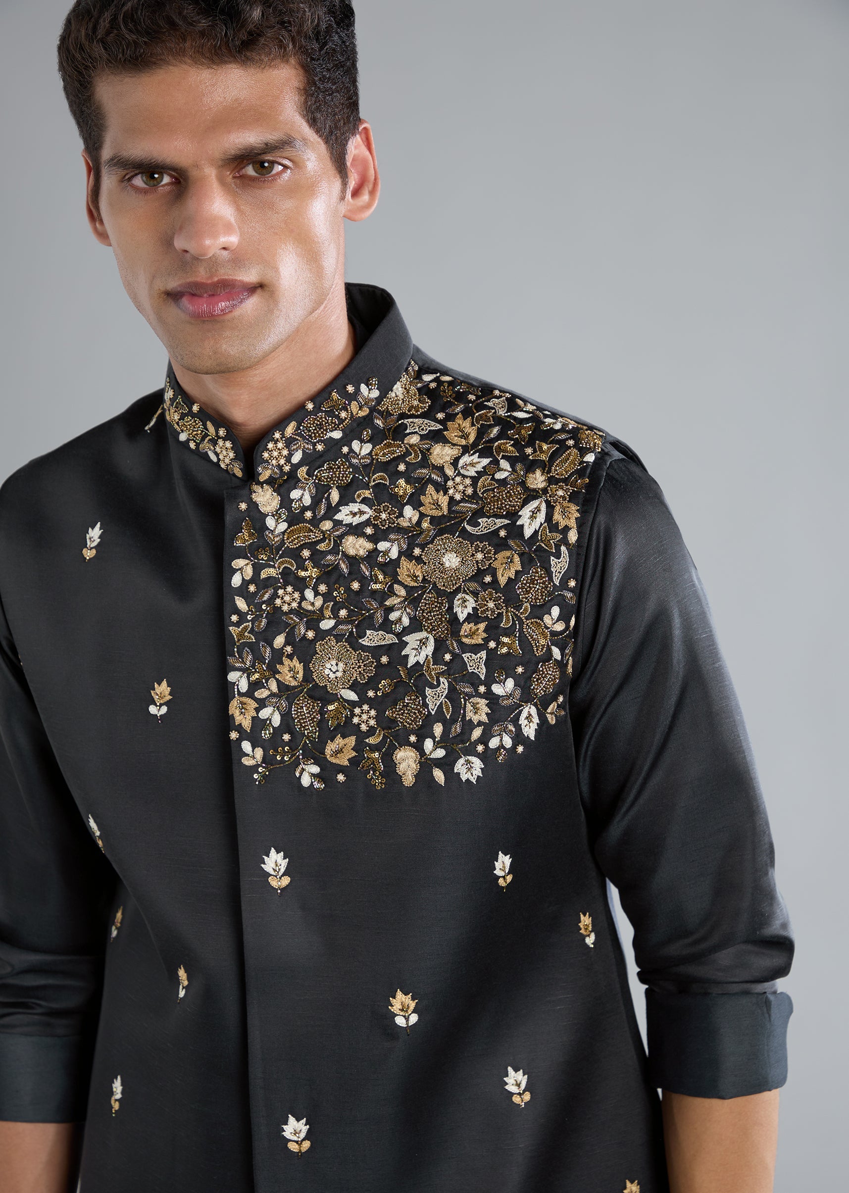 Navy Blue Kurta Jacket Set With Zardosi Resham And Cut Dana Detailing