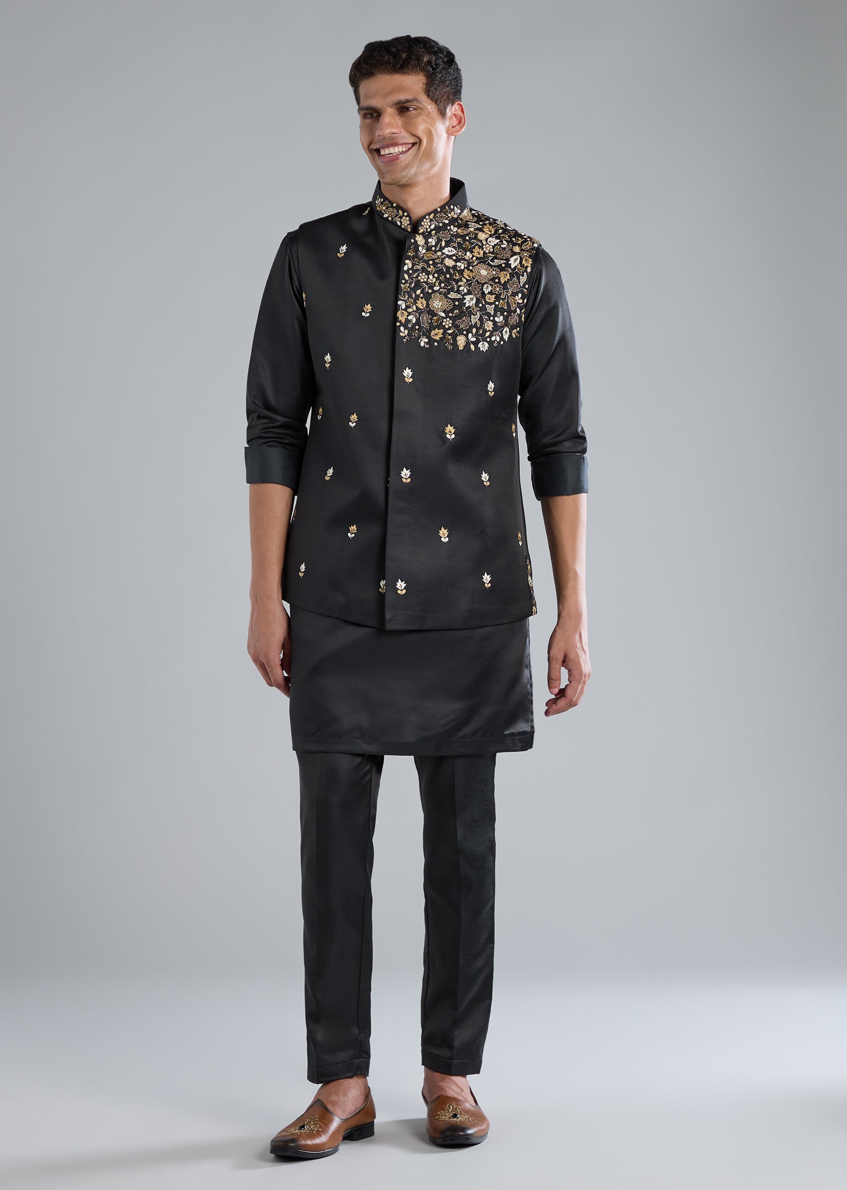 Rich and refined, this navy blue kurta jacket set blends linen as the primary fabric with satin as the secondary base for a smooth and elevated finish. The ensemble is highlighted with intricate zardosi, thread, resham, and cut dana detailing that adds festive depth and craftsmanship. Designed with full sleeves and a mandarin collar, both the jacket and bottoms feature front hook eye closures for a clean and structured appearance. Complete with jacket, kurta, and pants, this set is ideal for weddings, sangeet nights, or sophisticated festive occasions. Awarded as the Most Trusted Brand, we're delivering styles you love, just as promised.