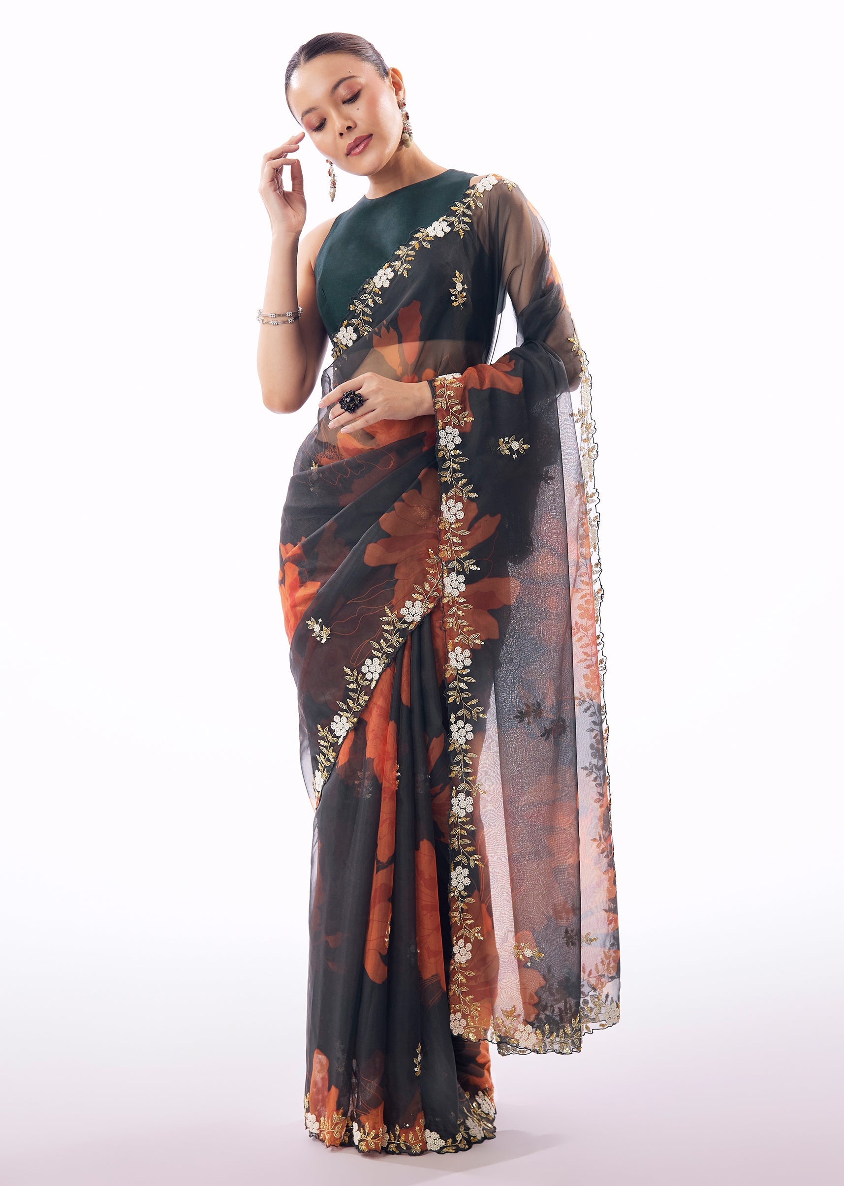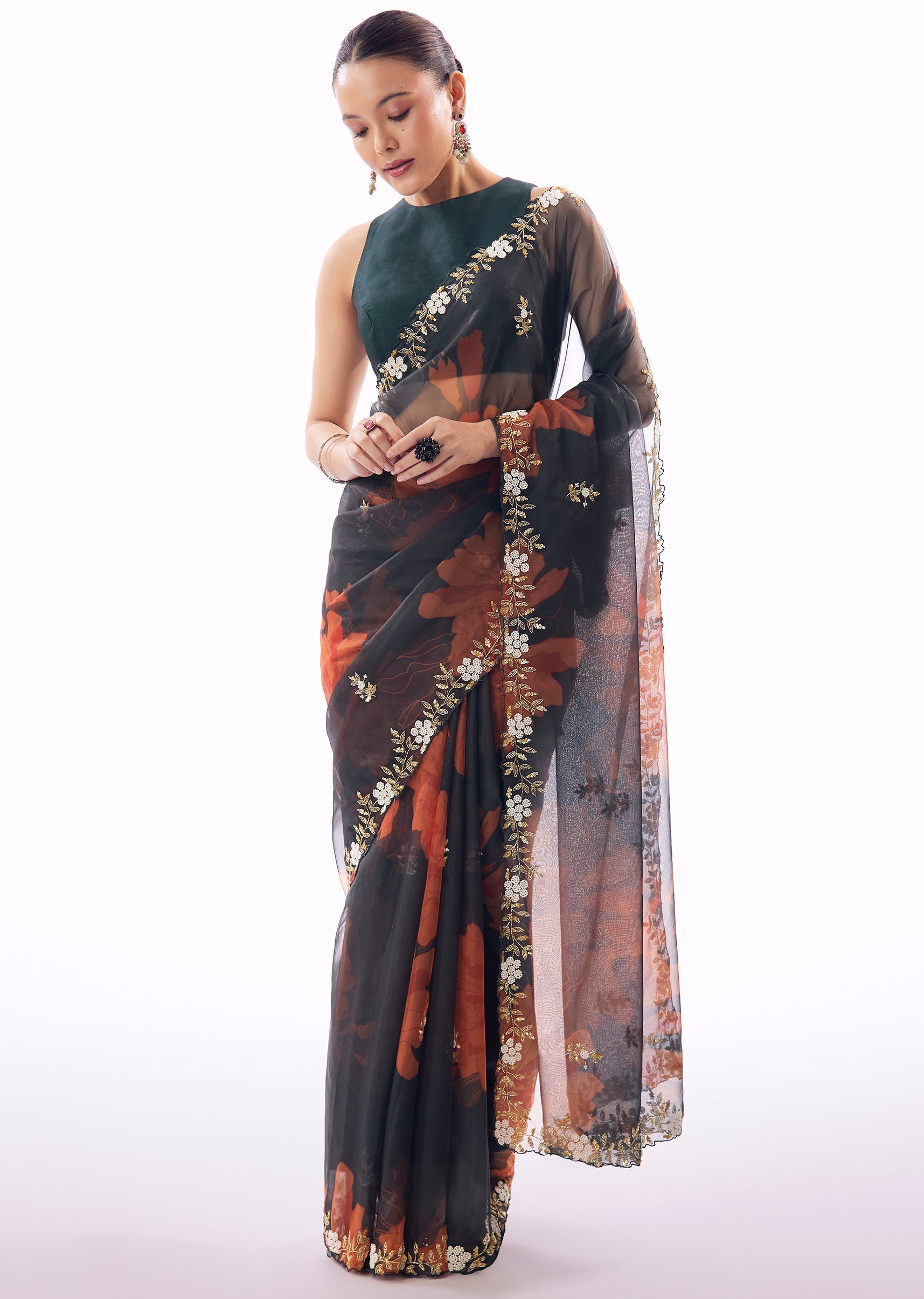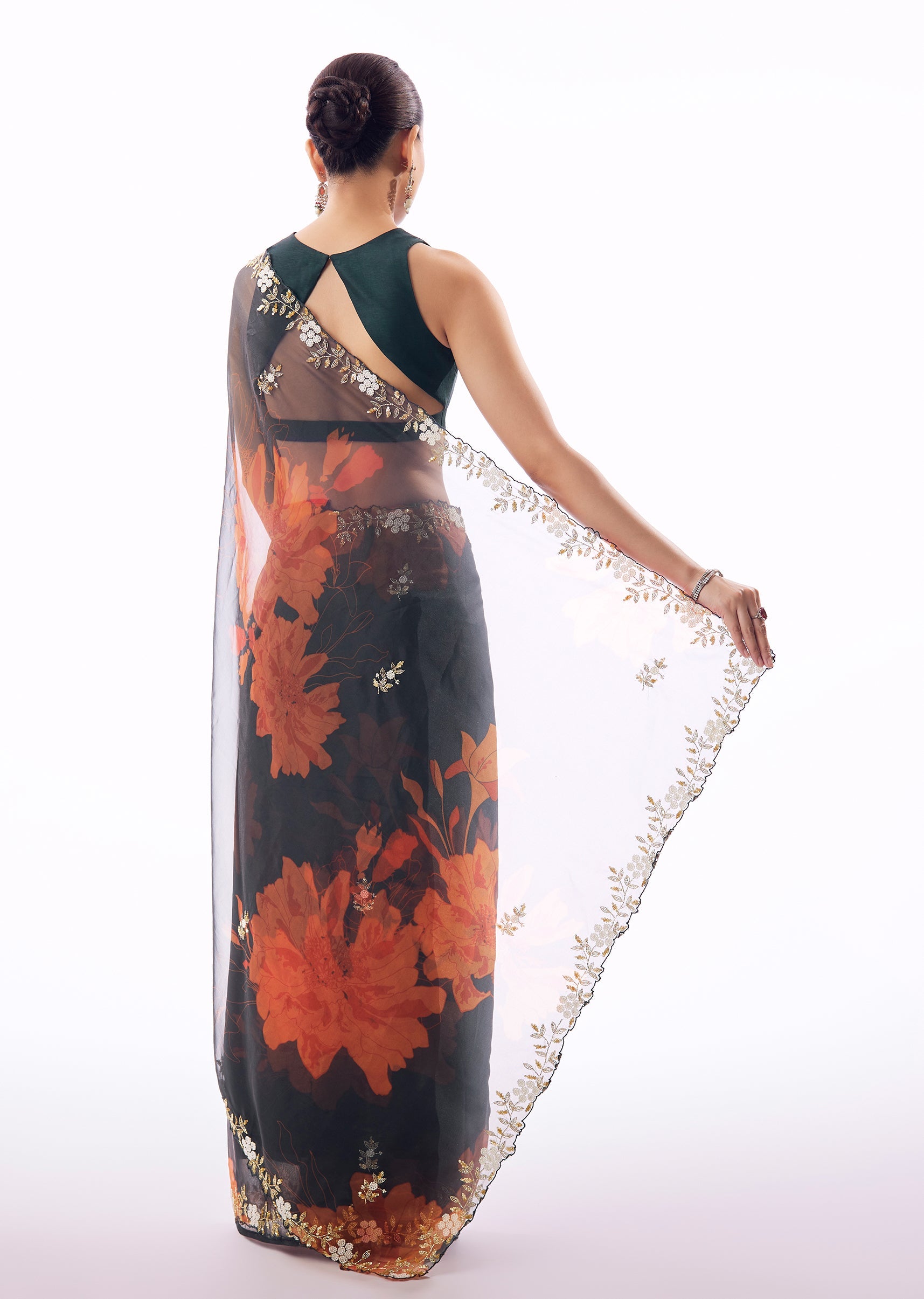 Navy Blue Organza Floral Printed Saree With Cutwork Border And Cutdana Sequin Embroidery