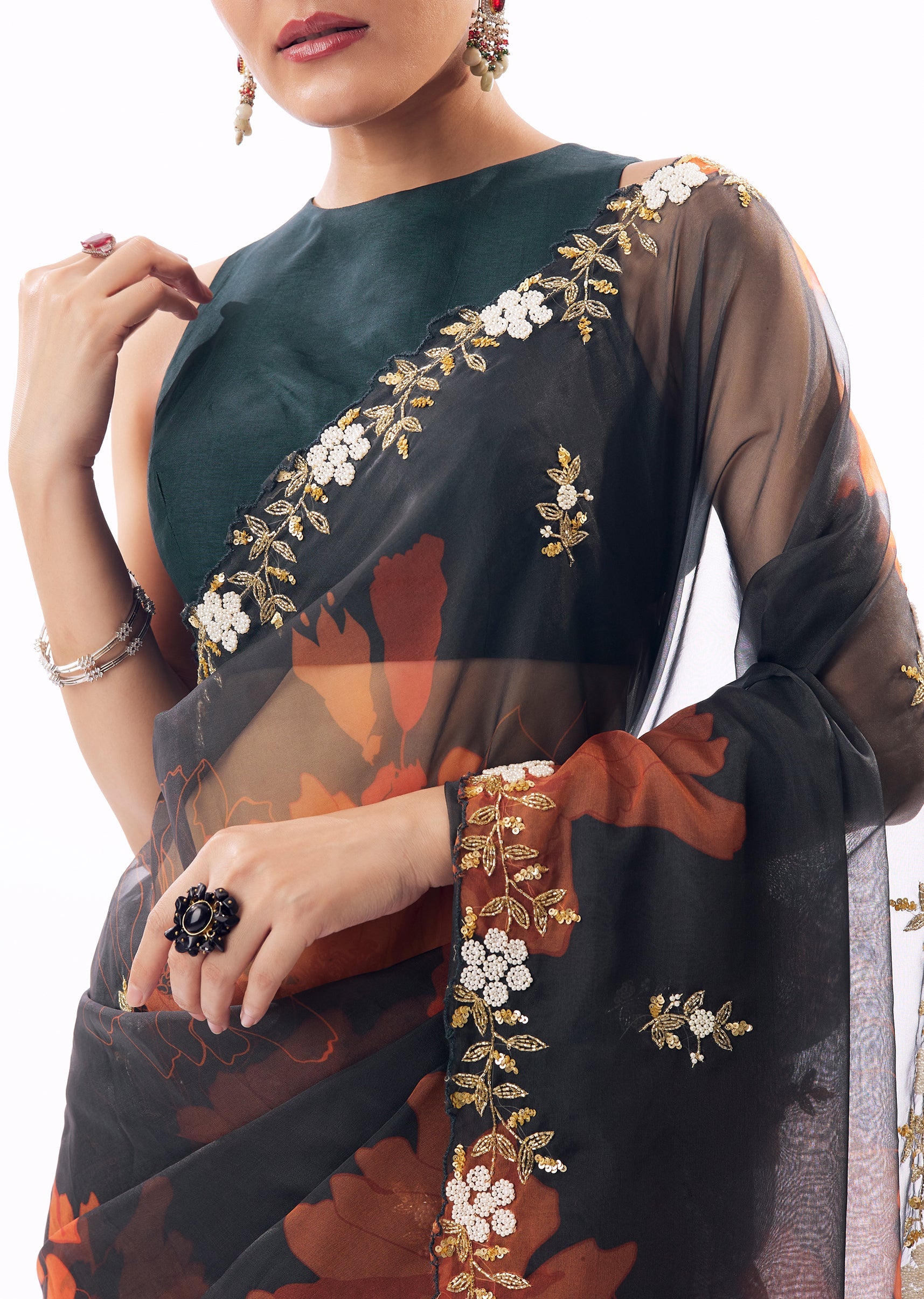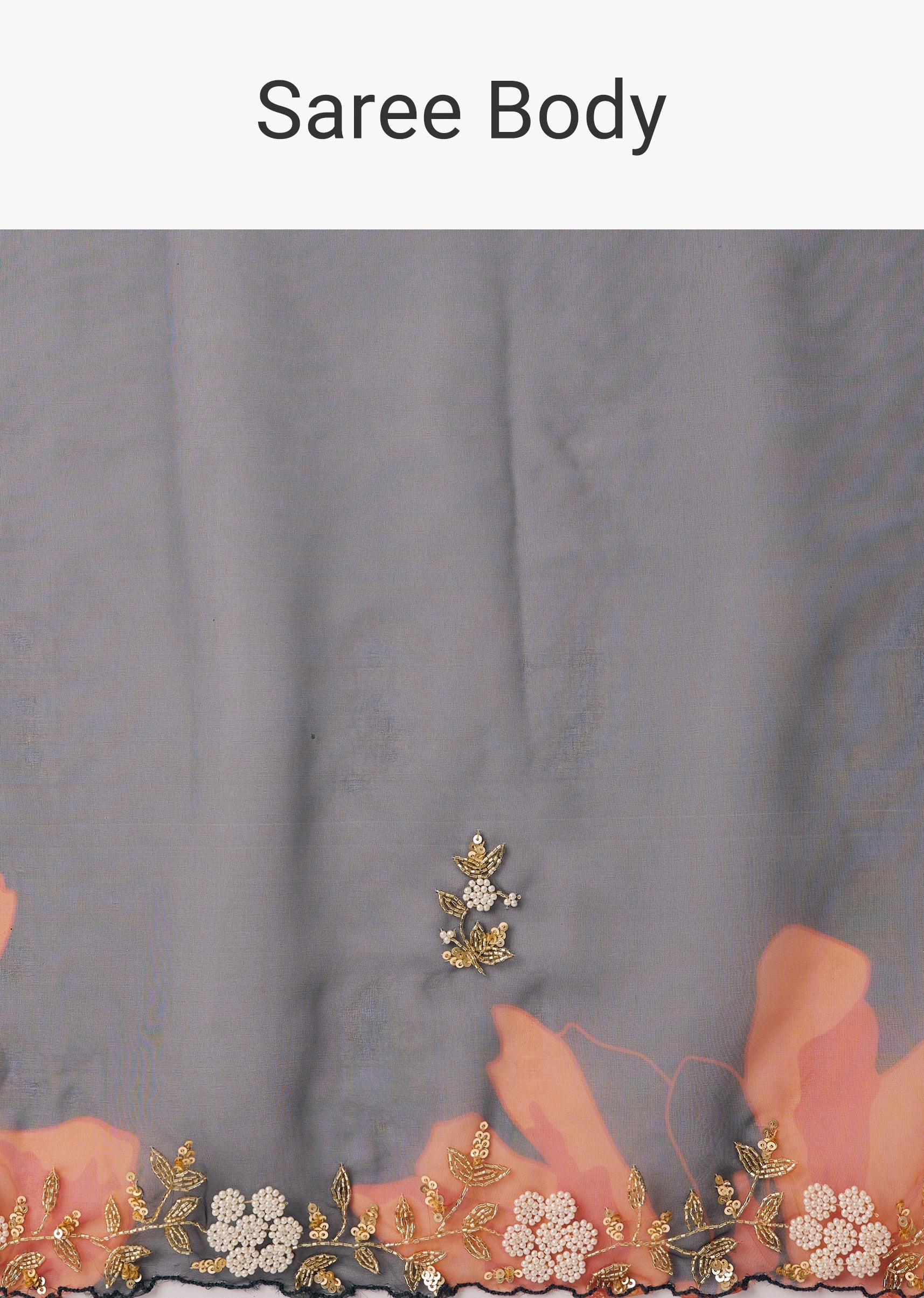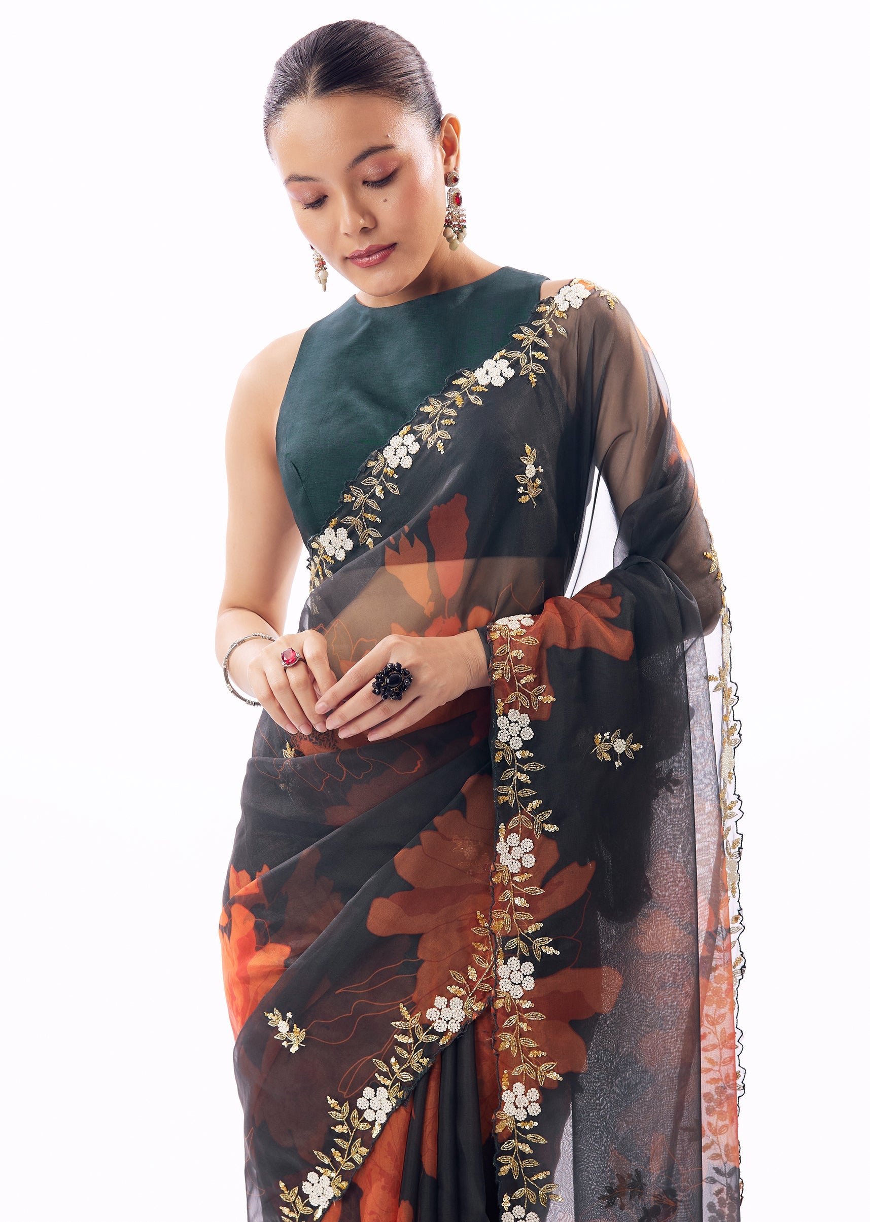 Navy Blue Organza Floral Printed Saree With Cutwork Border And Cutdana Sequin Embroidery