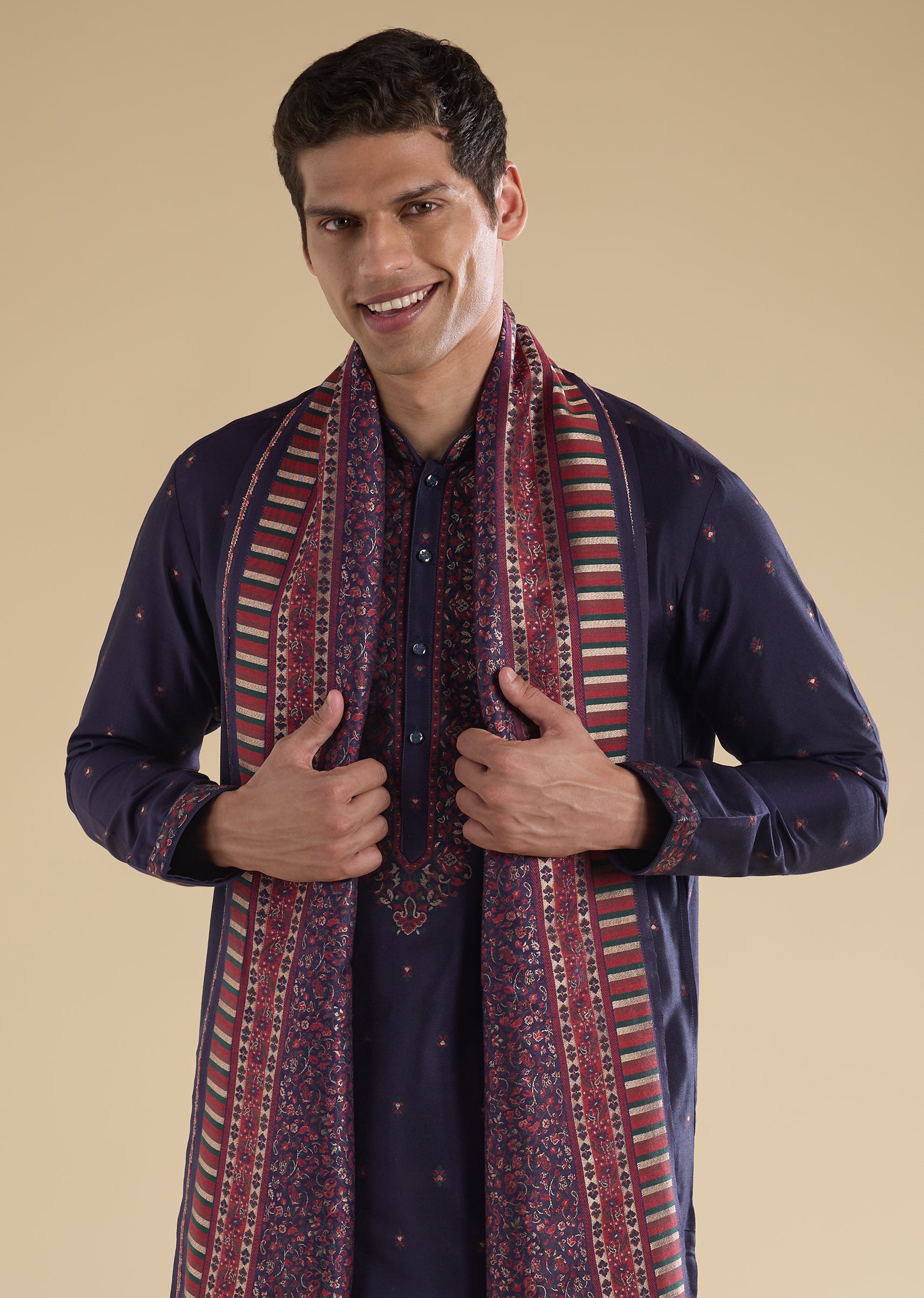 A classic navy blue kurta set crafted in art silk, featuring subtle booti-inspired prints for an understated festive appeal. Designed with a mandarin collar, full sleeves, and front button closure, the set is paired with straight-fit mid-waist pants and a matching dupatta—perfect for mehendi and festive wedding gatherings.