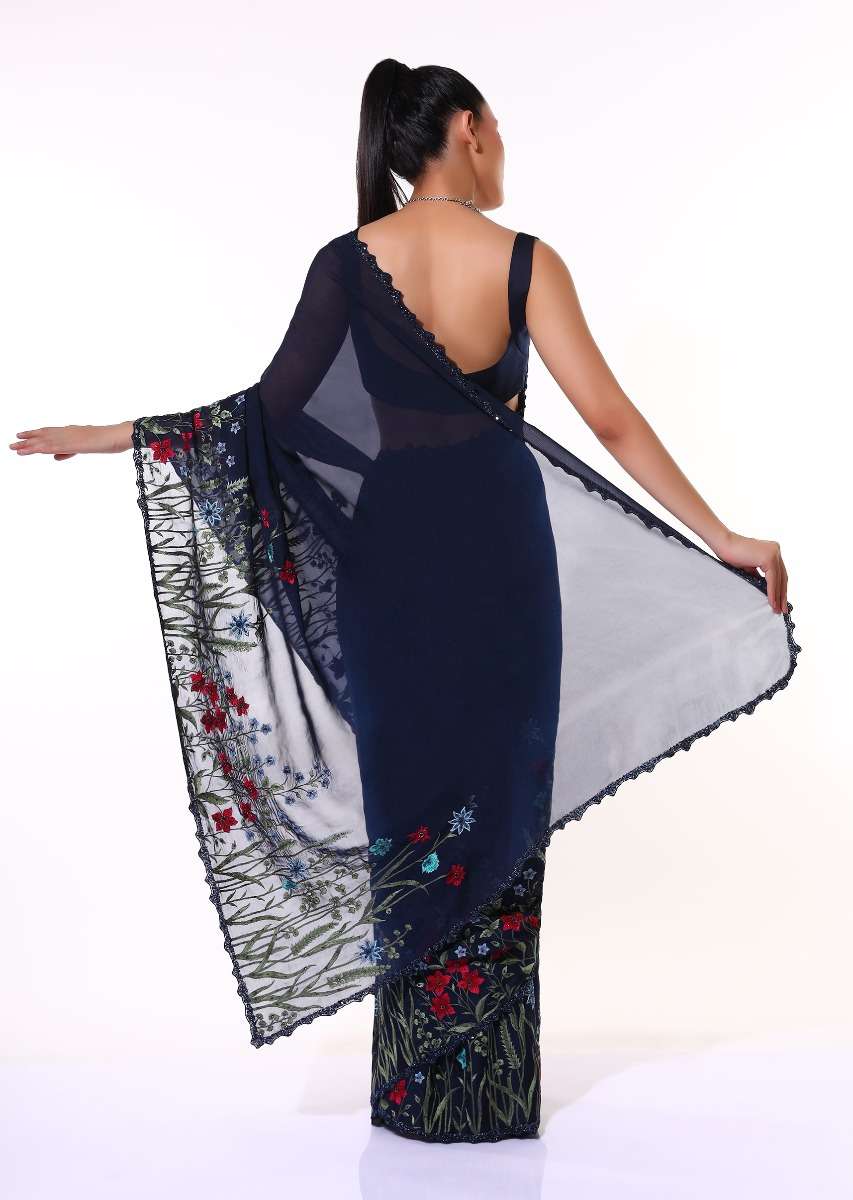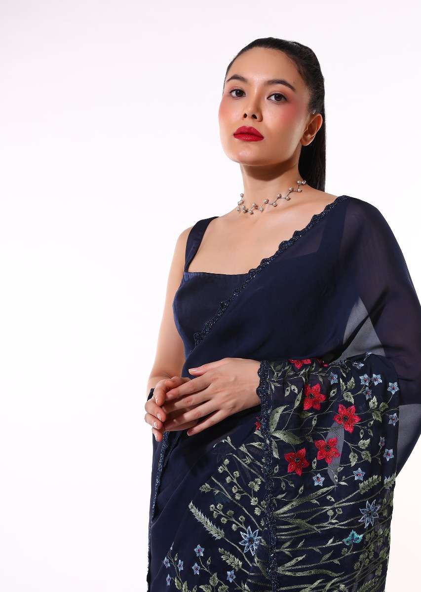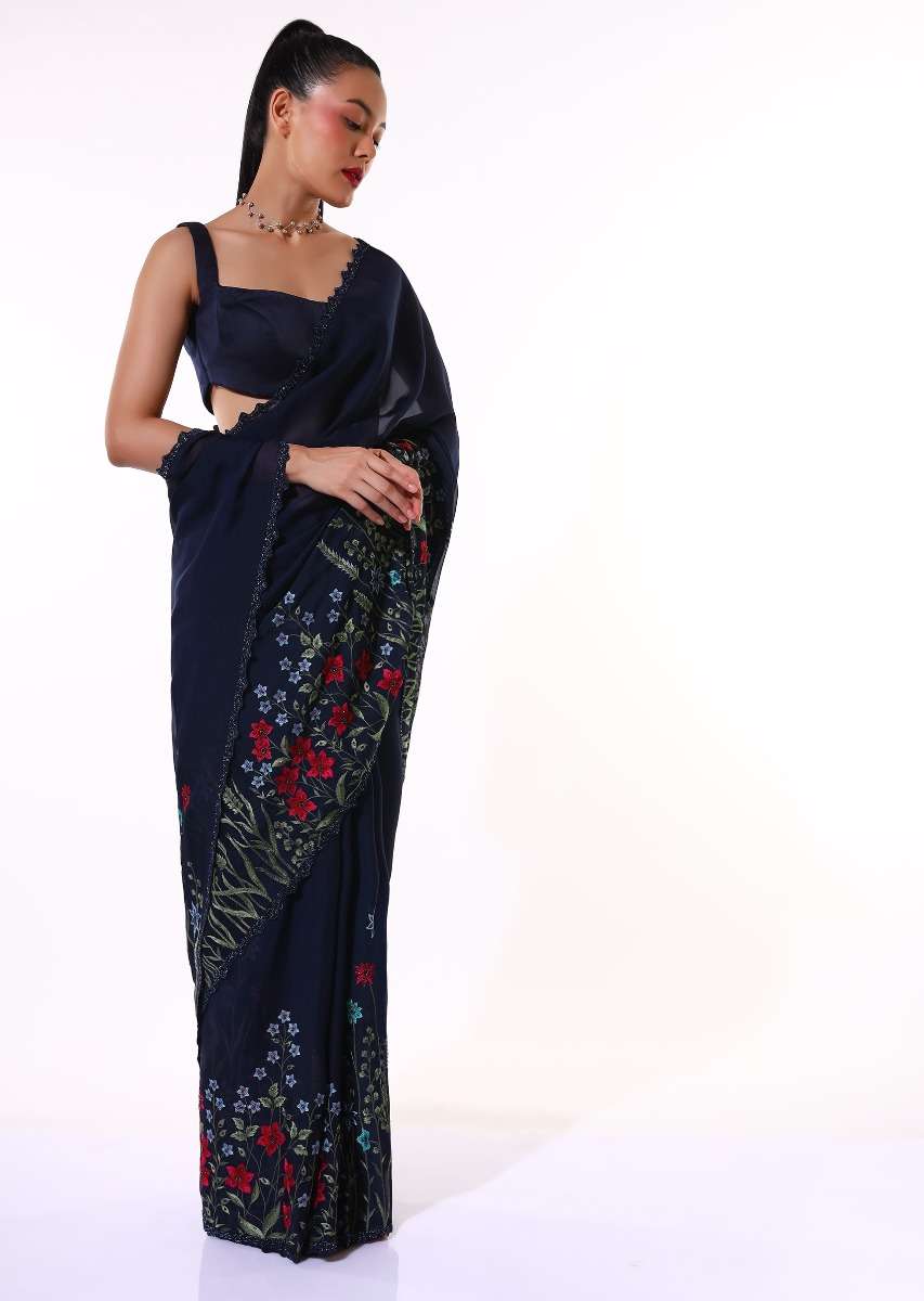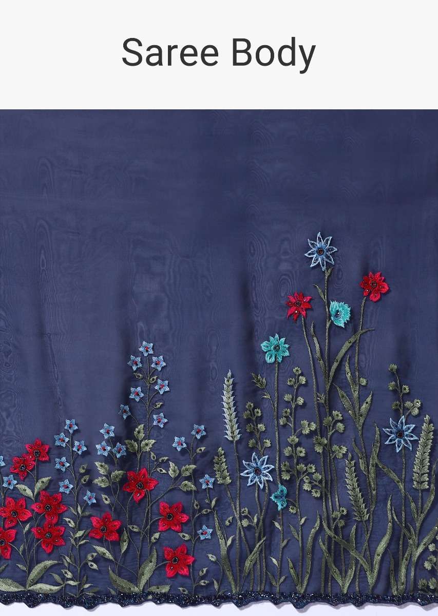 Navy Blue Saree In Organza Featuring Colorful Resham Embroidered Floral Design On The Border Paired With Unstitched Blouse Online - Kalki Fashion