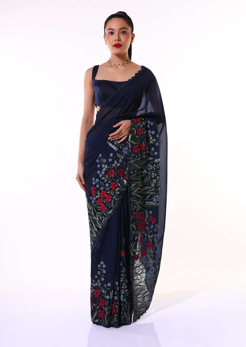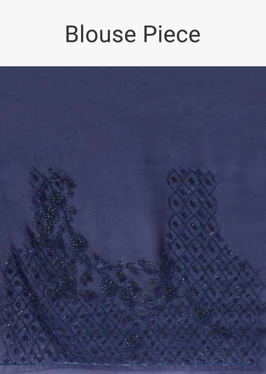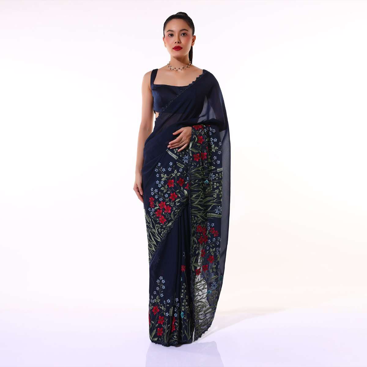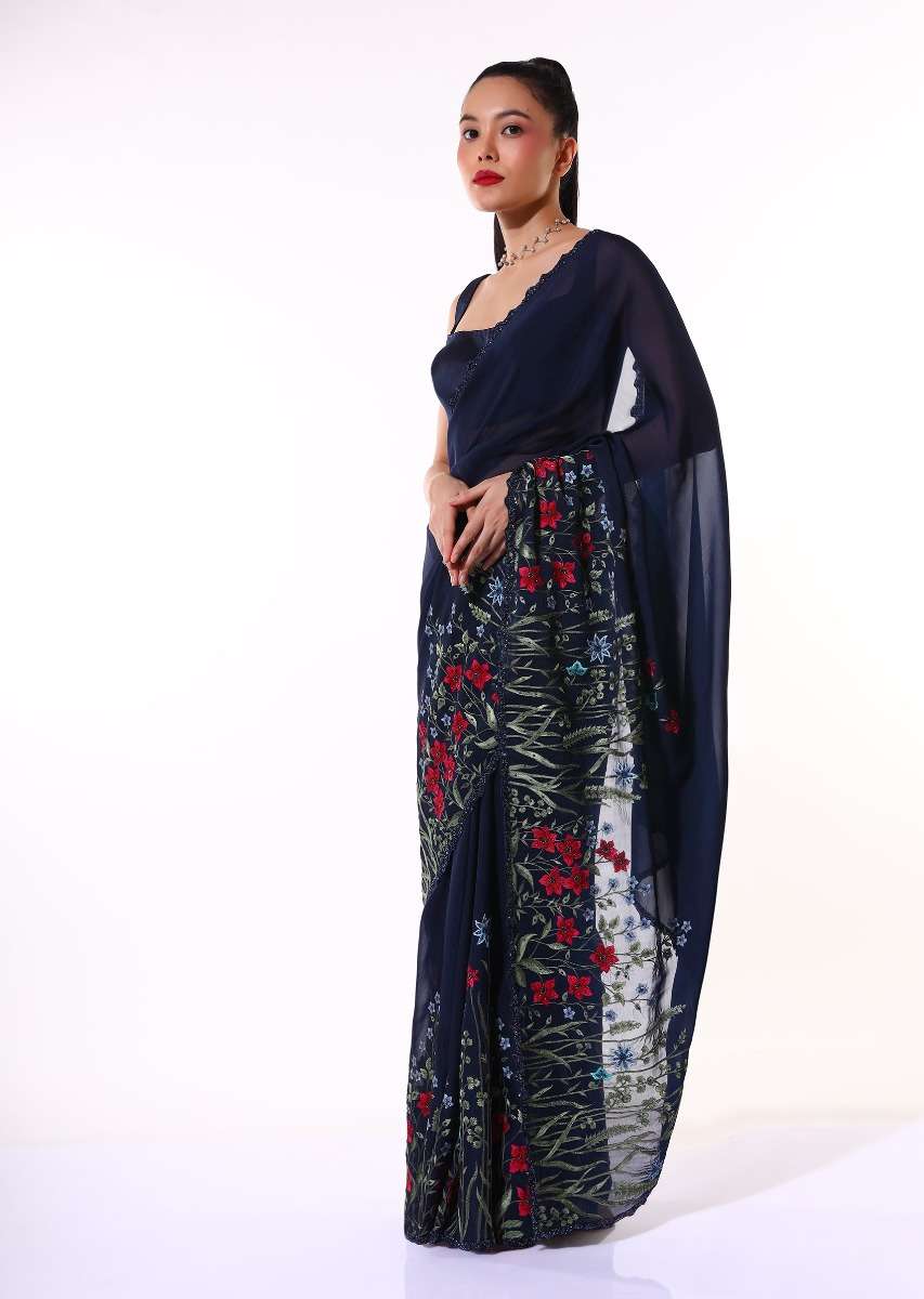 Navy Blue Saree In Organza Featuring Colorful Resham Embroidered Floral Design On The Border Paired With Unstitched Blouse Online - Kalki Fashion