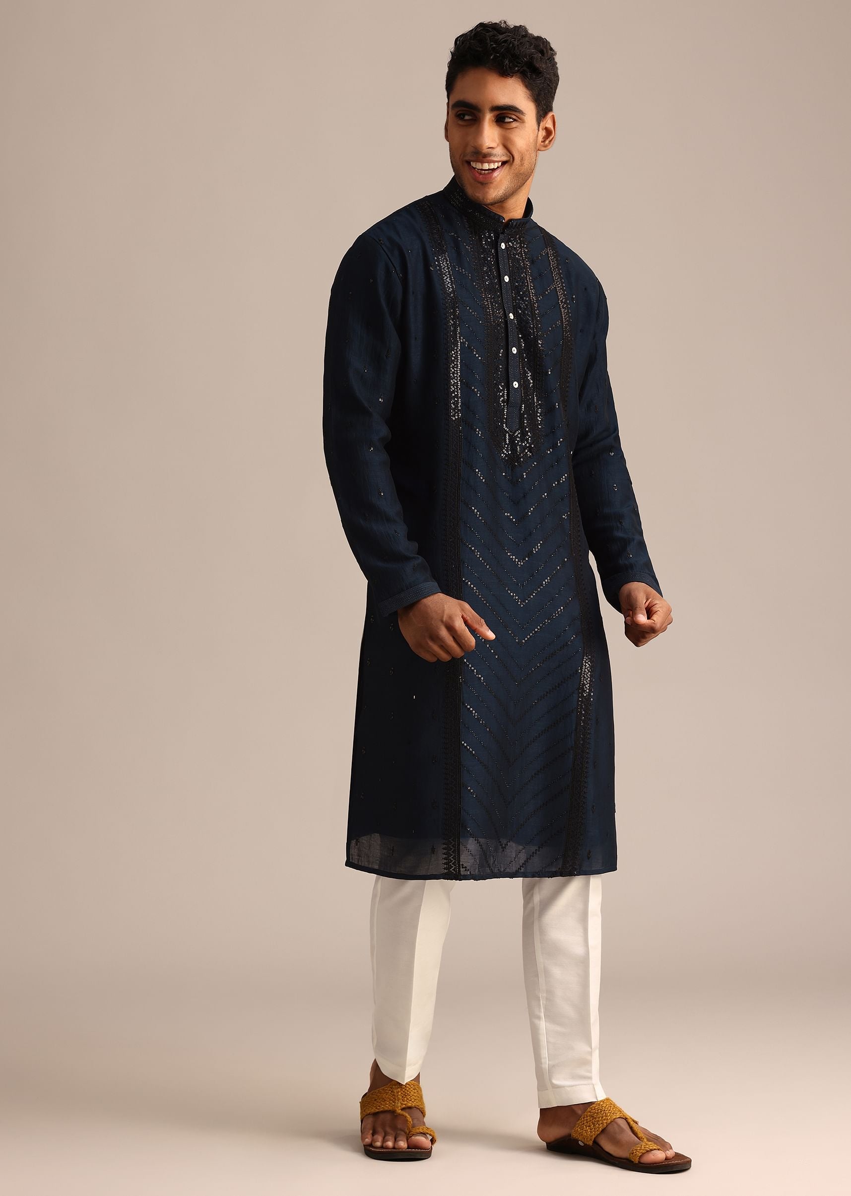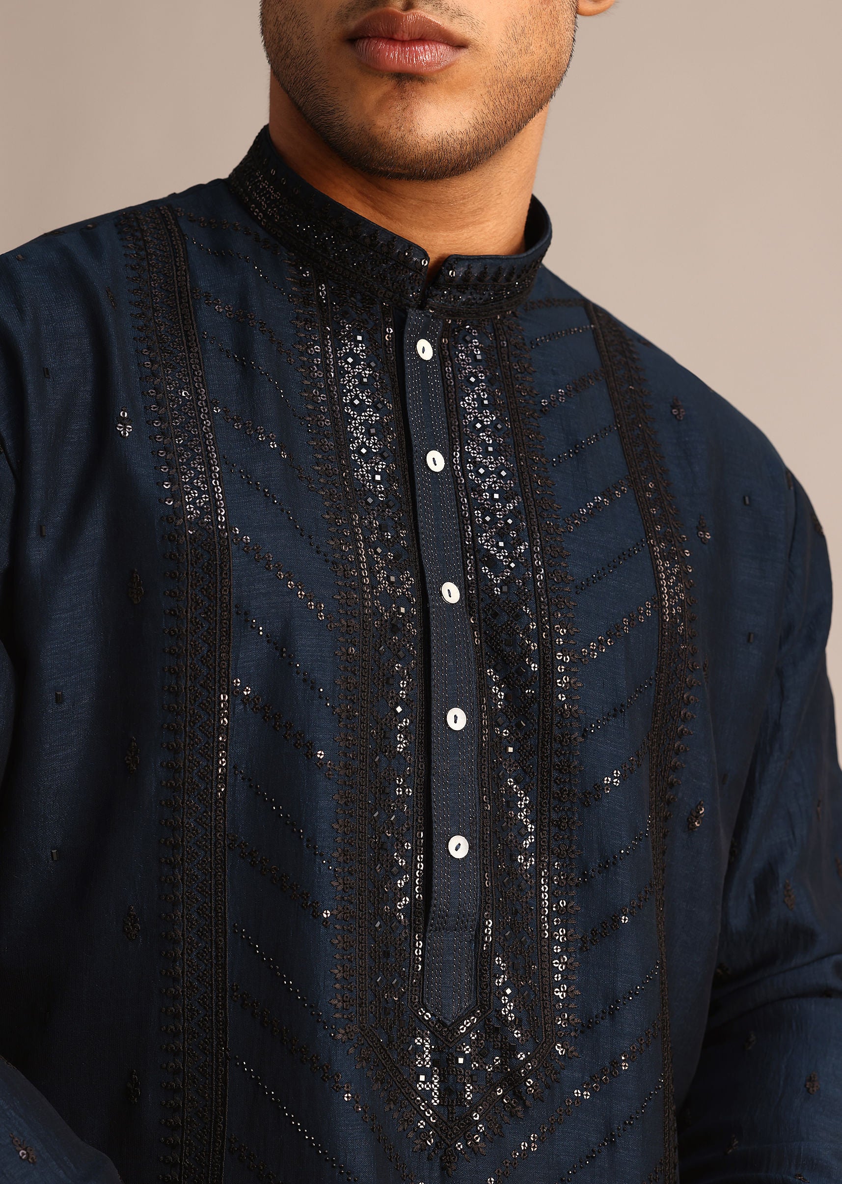 Introducing our stunning design, this silk kurta and pant set constructed of opulent silk is enhanced on a navy blue base. The kurta is embellished with gleaming sequin embroidery, a mandarin collar, long sleeves, and a front button placket. Perfect to showcase your effortless and easy-going style, don this silhouette to leave a lasting impression at family get-togethers, and festive celebrations. Awarded as the Most Trusted Brand, we're delivering styles you love, just as promised.