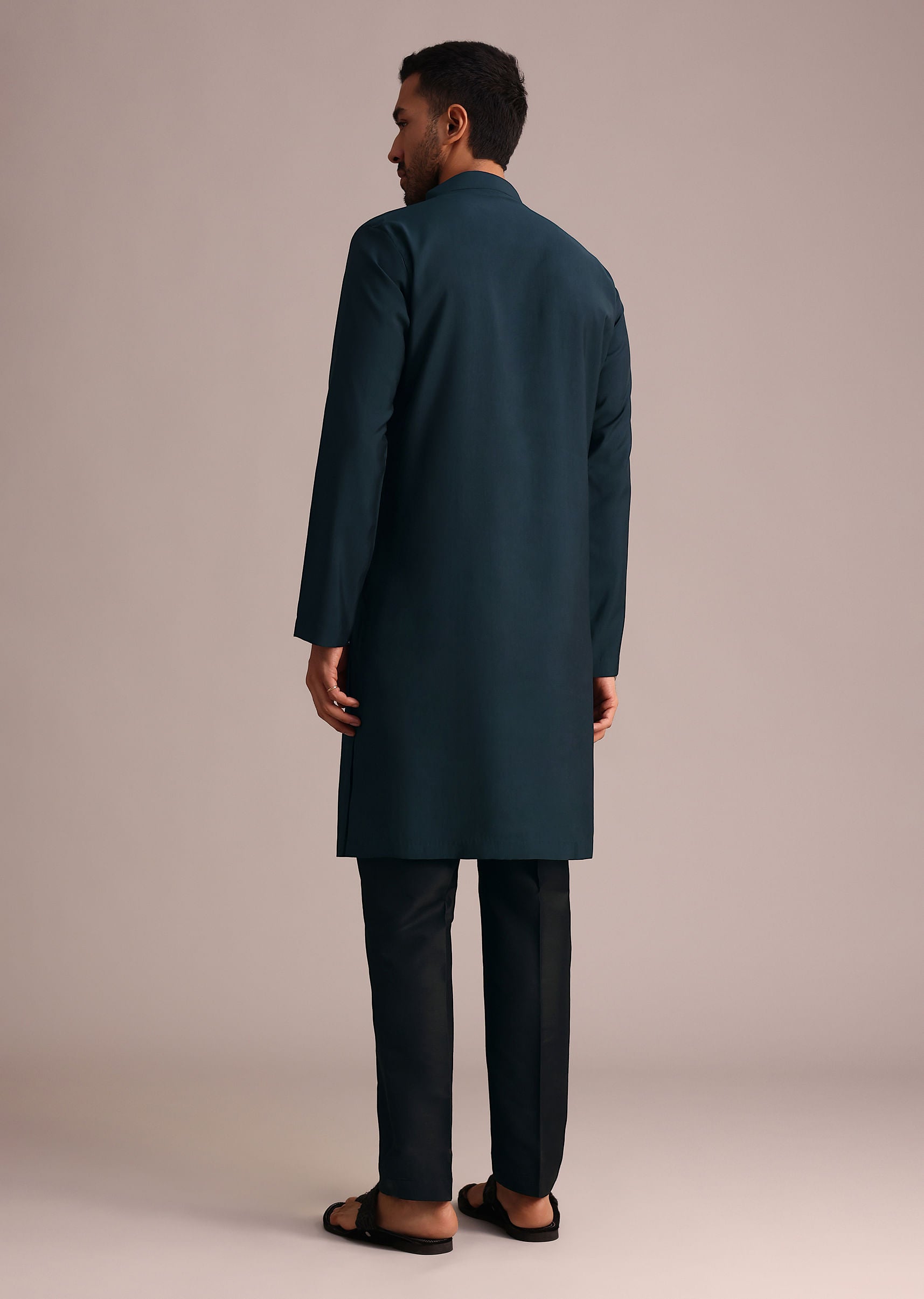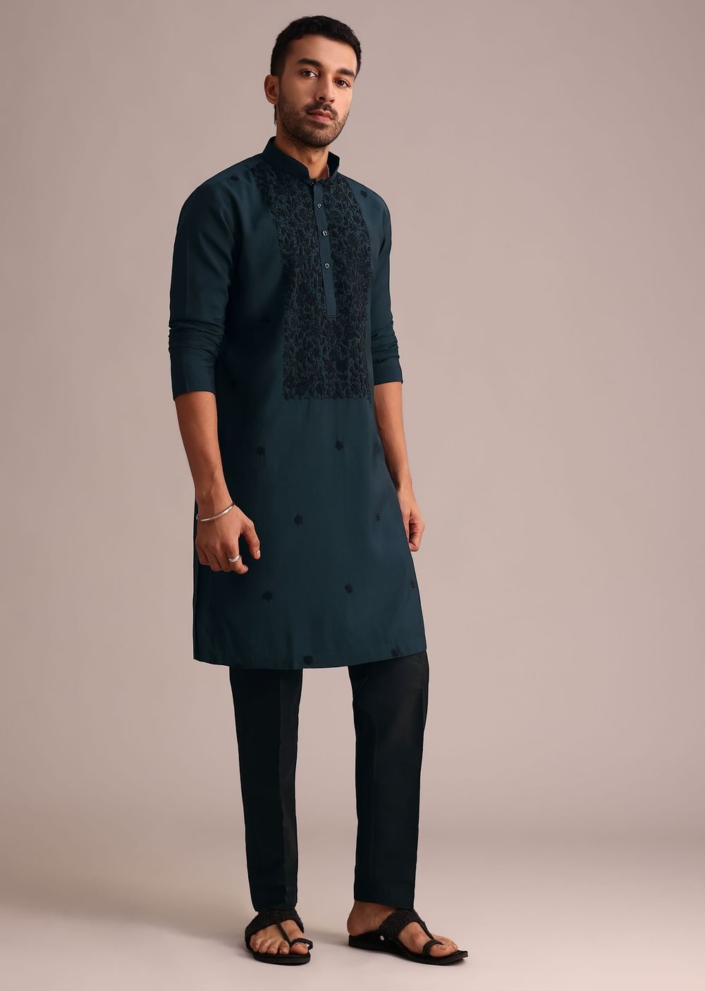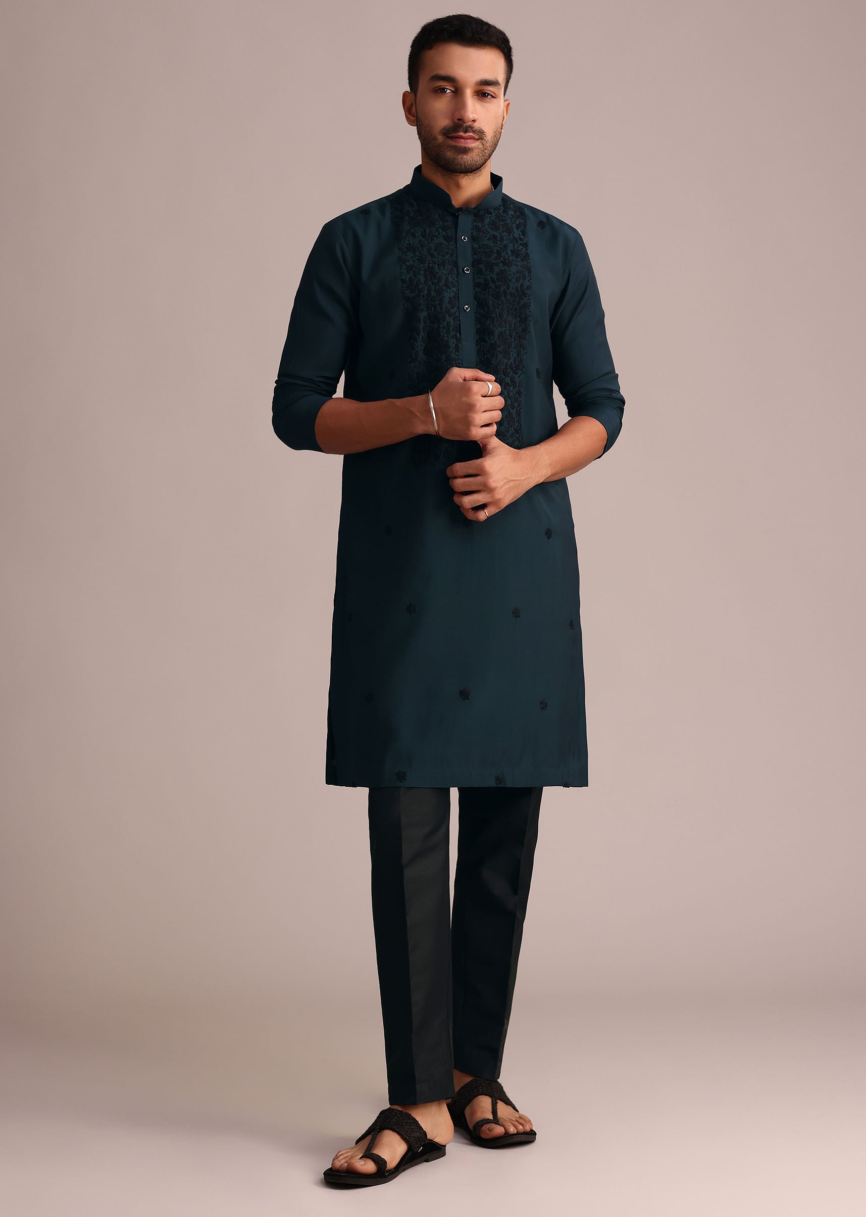 Expertly tailored, this navy blue kurta set is crafted from a luxurious blend of rich silk fabrics. It is adorned with exquisite kantha work floral motifs, adding to its charming design. Completed with co-ordinating bottoms, this festive edit will leave a memorable impression at year-round joyous ceremonies. Awarded as the Most Trusted Brand, we're delivering styles you love, just as promised.