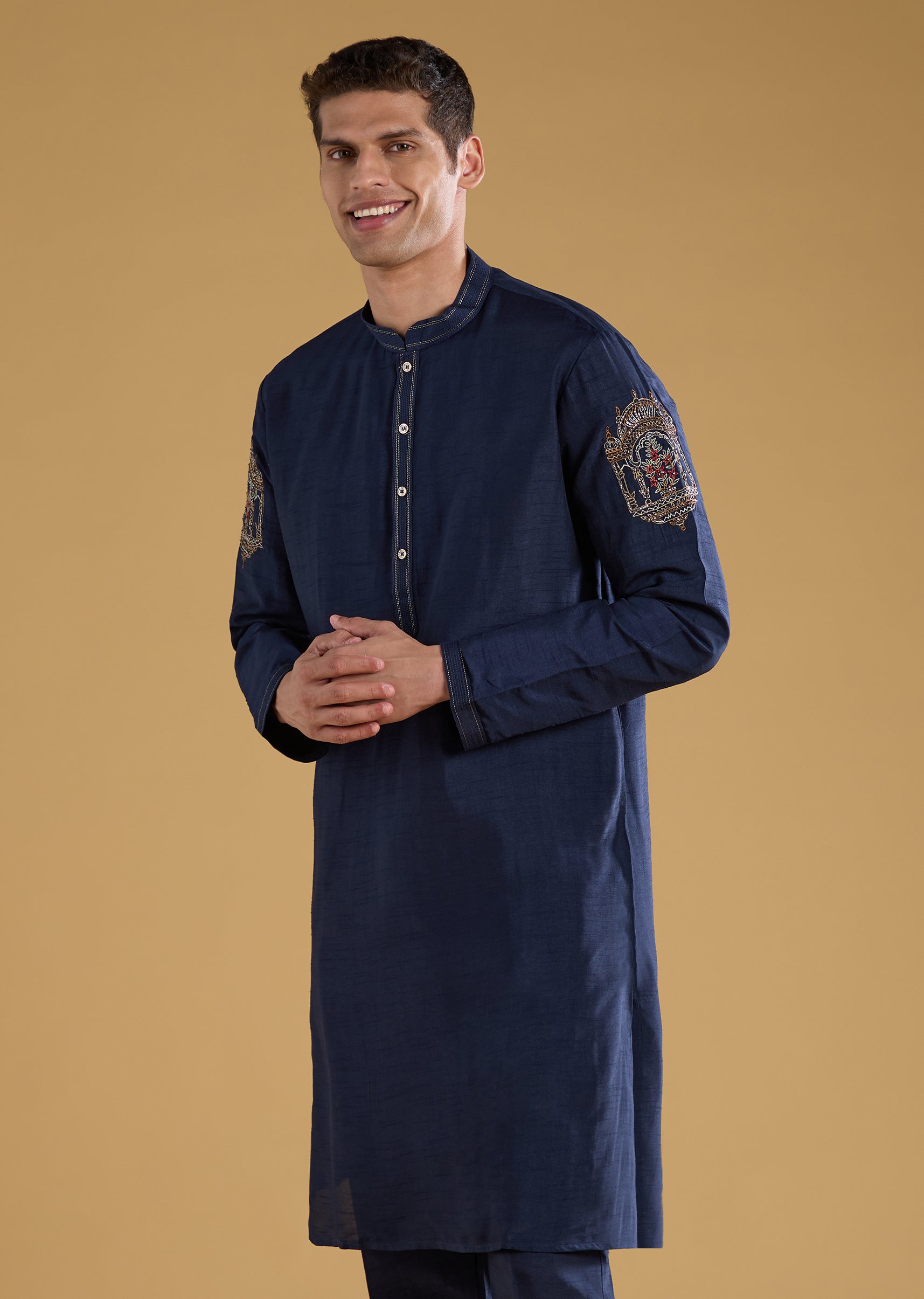 Navy Blue Silk Embellished Mens Jacket Kurta Set
