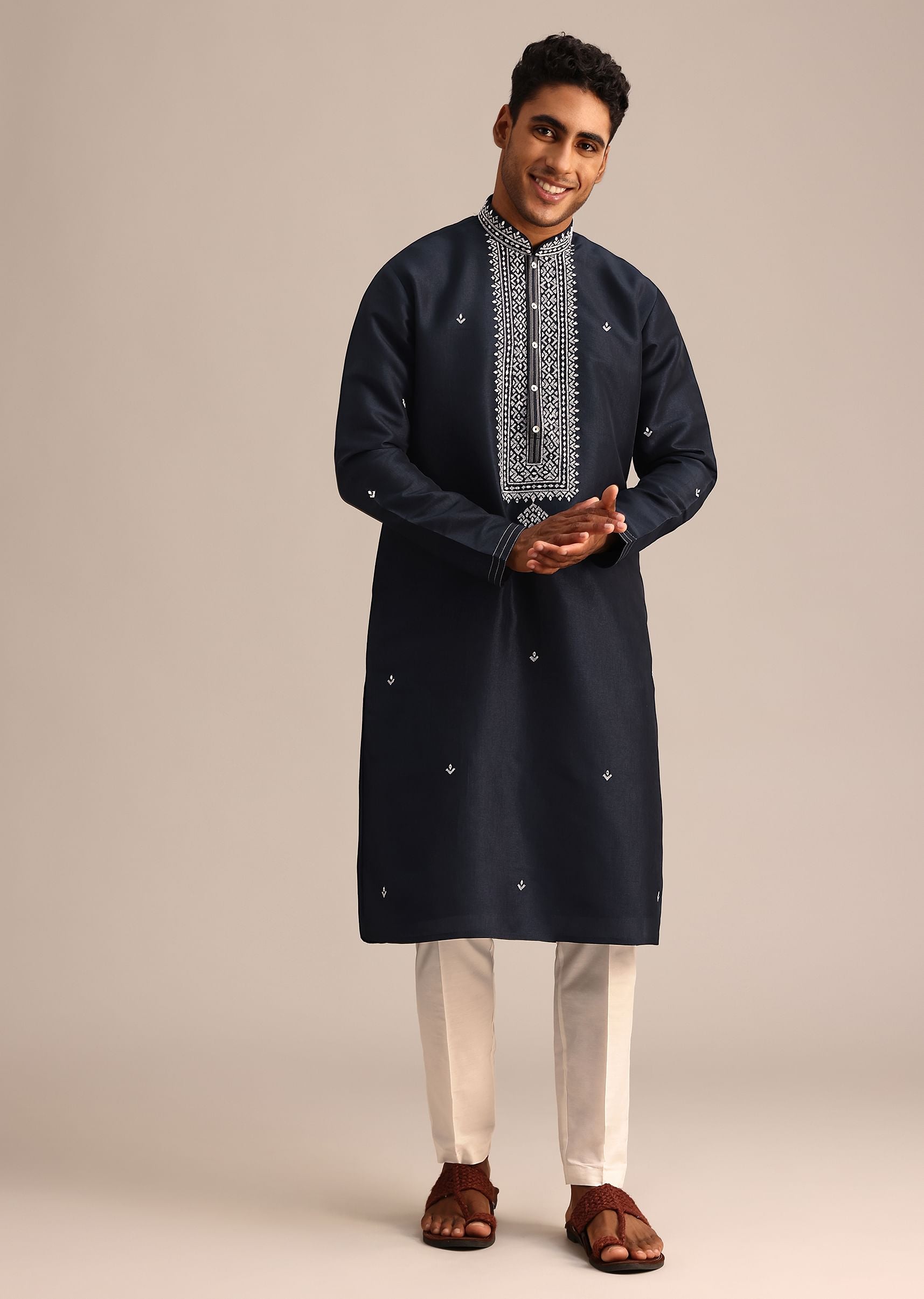 Navy Blue Silk Kurta Set With Resham Embroidered Work