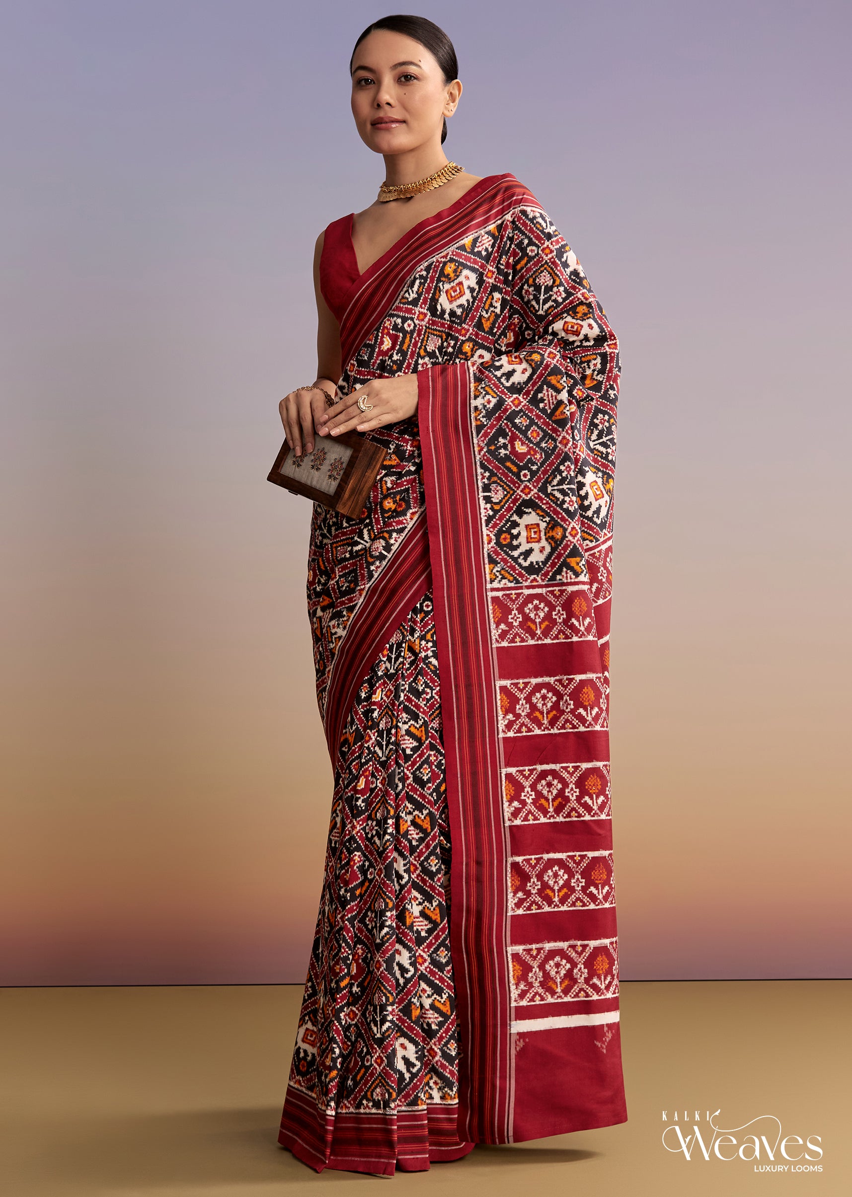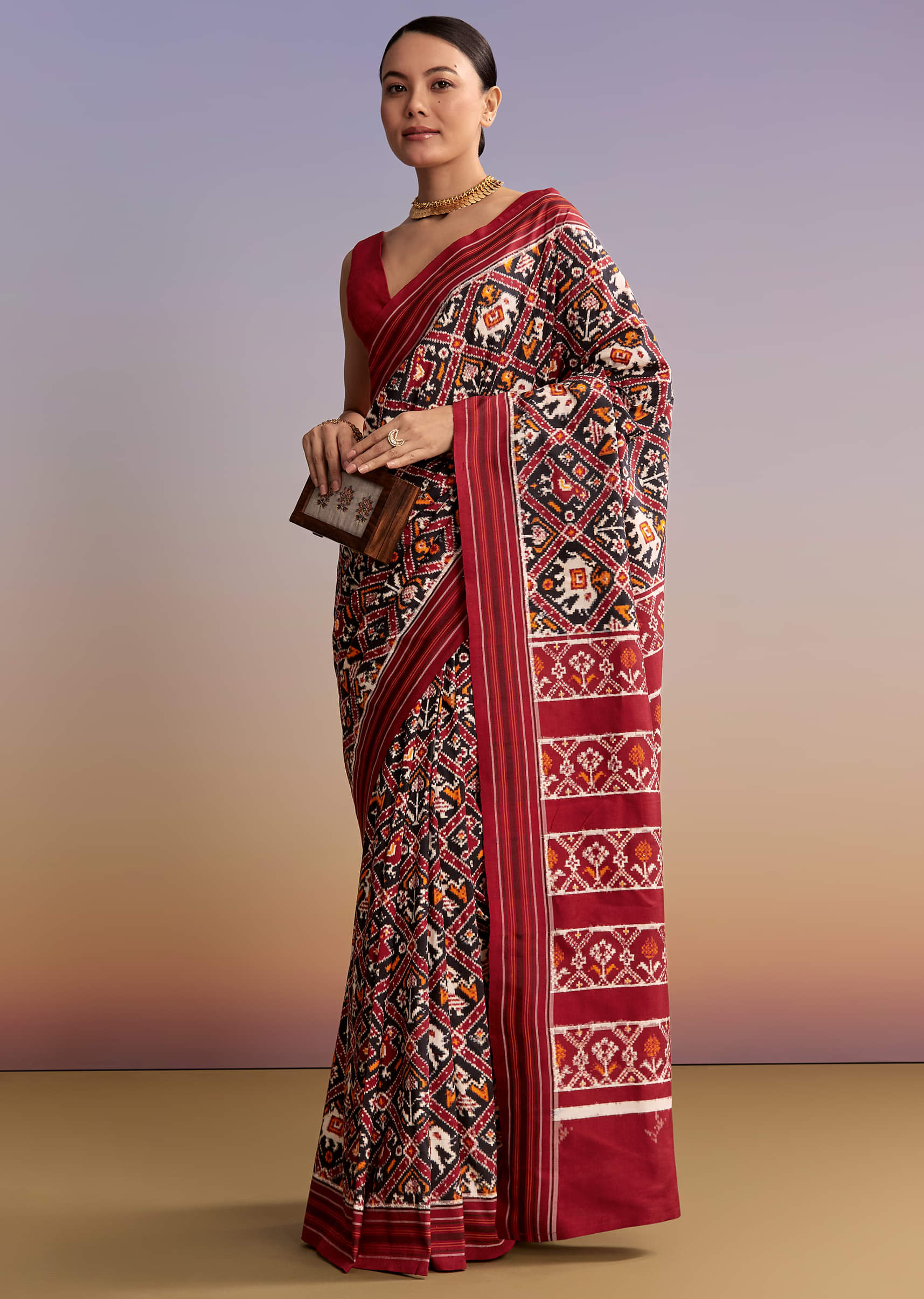 Traditional artistry takes center stage in this maroon and navy blue silk handwoven Patola saree. Single Ikkat patterns blend geometric and animal motifs inspired by Pochampally and Sambalpuri styles. It is the statement piece for ceremonies when you want heritage to do the talking. Awarded as the Most Trusted Brand, we're delivering styles you love, just as promised.