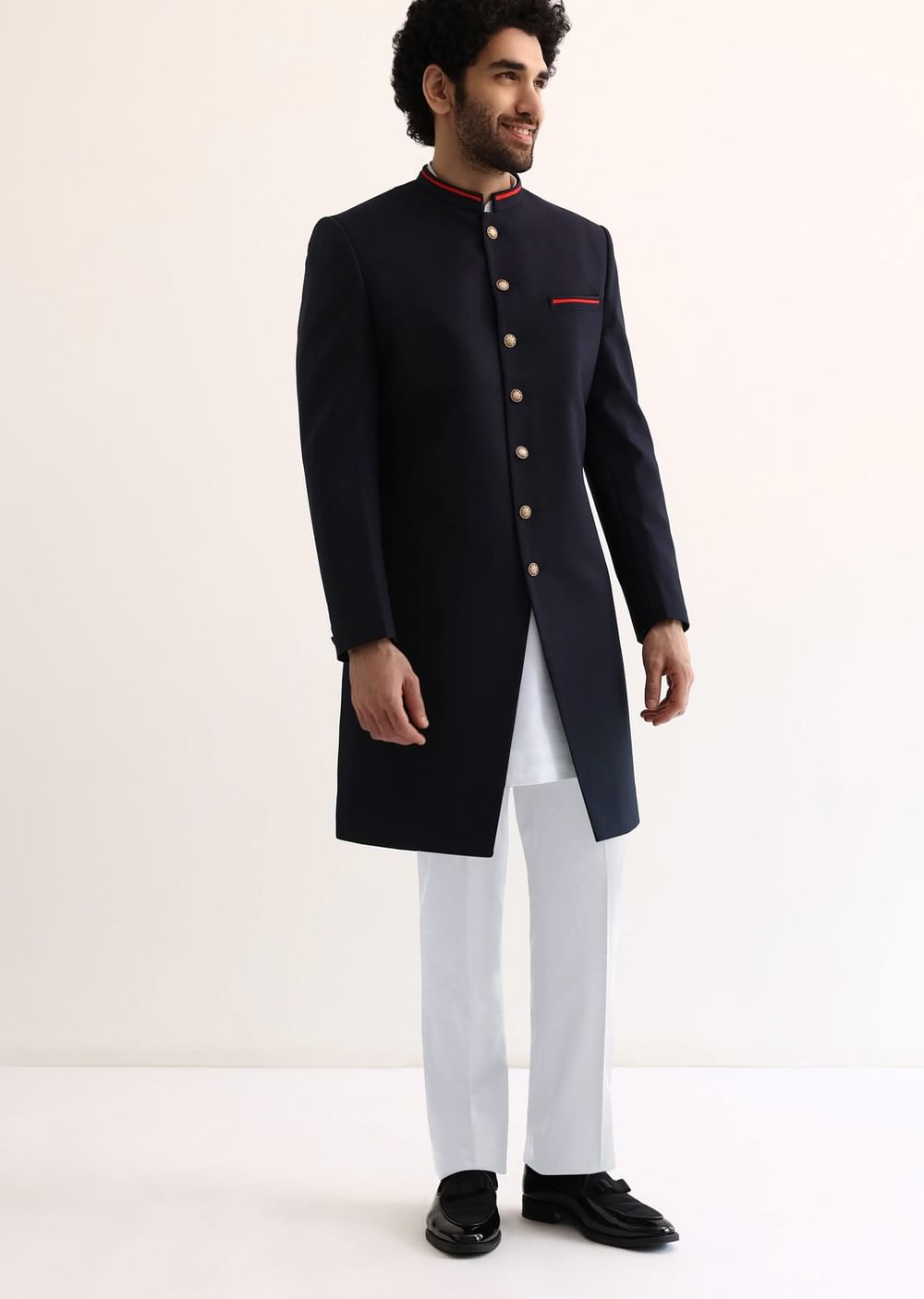 Enhance your formal attire with a navy blue indowestern suit. This suit is fabricated from suiting fabric. The indowestern set is perfect for weddings and receptions. The set includes indowestern, a kurta, and bottom. button may very. Awarded as the Most Trusted Brand, we're delivering styles you love, just as promised.