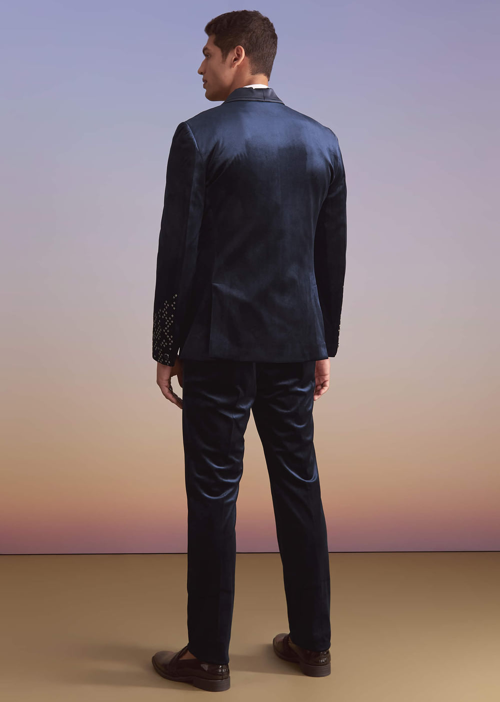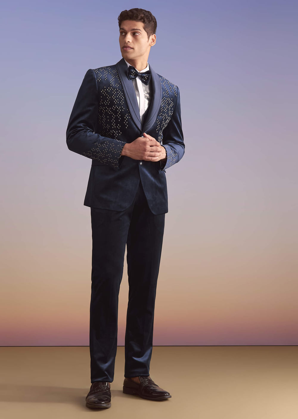Navy Blue Velvet Tuxedo For Men With Hand Embroidery