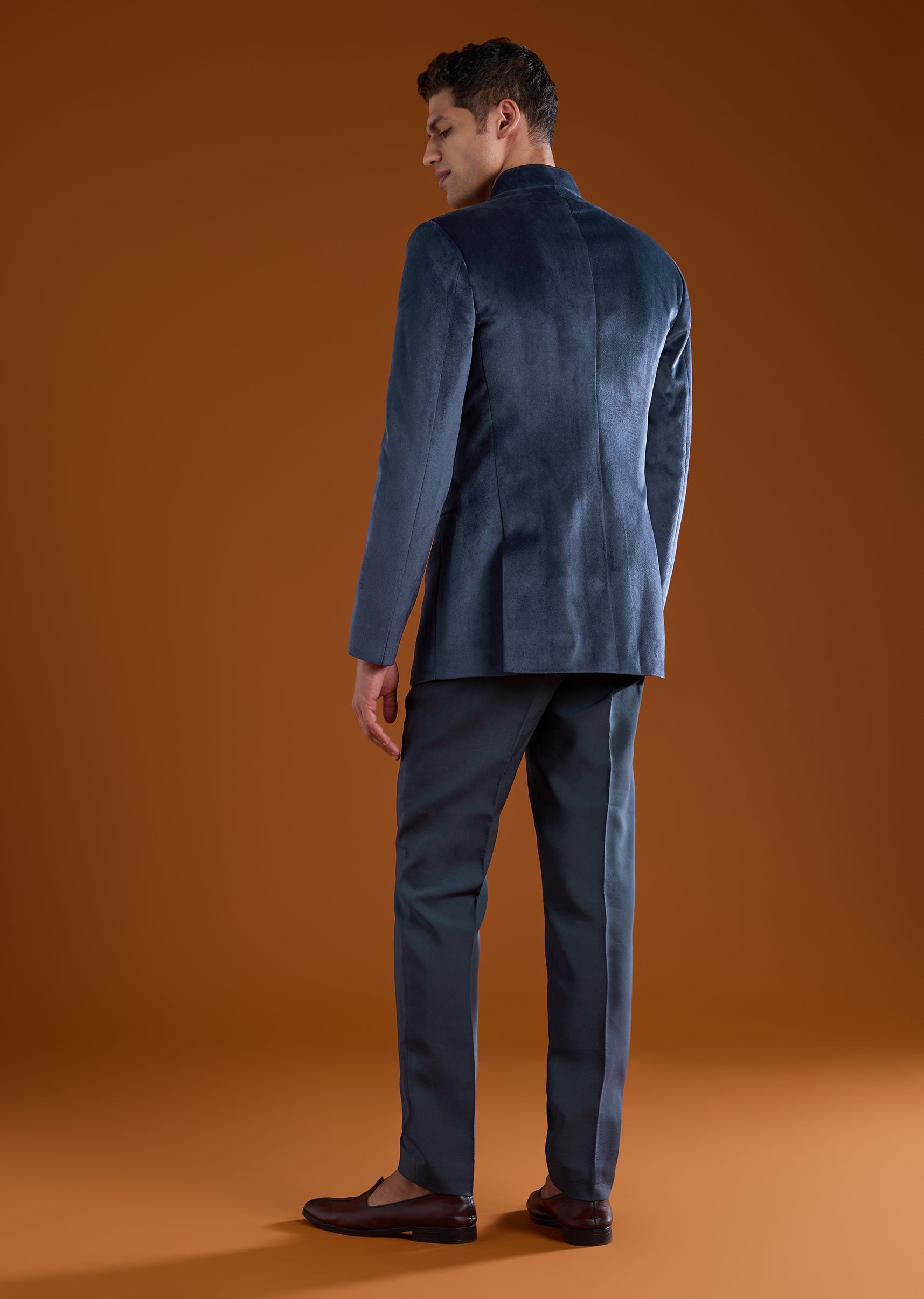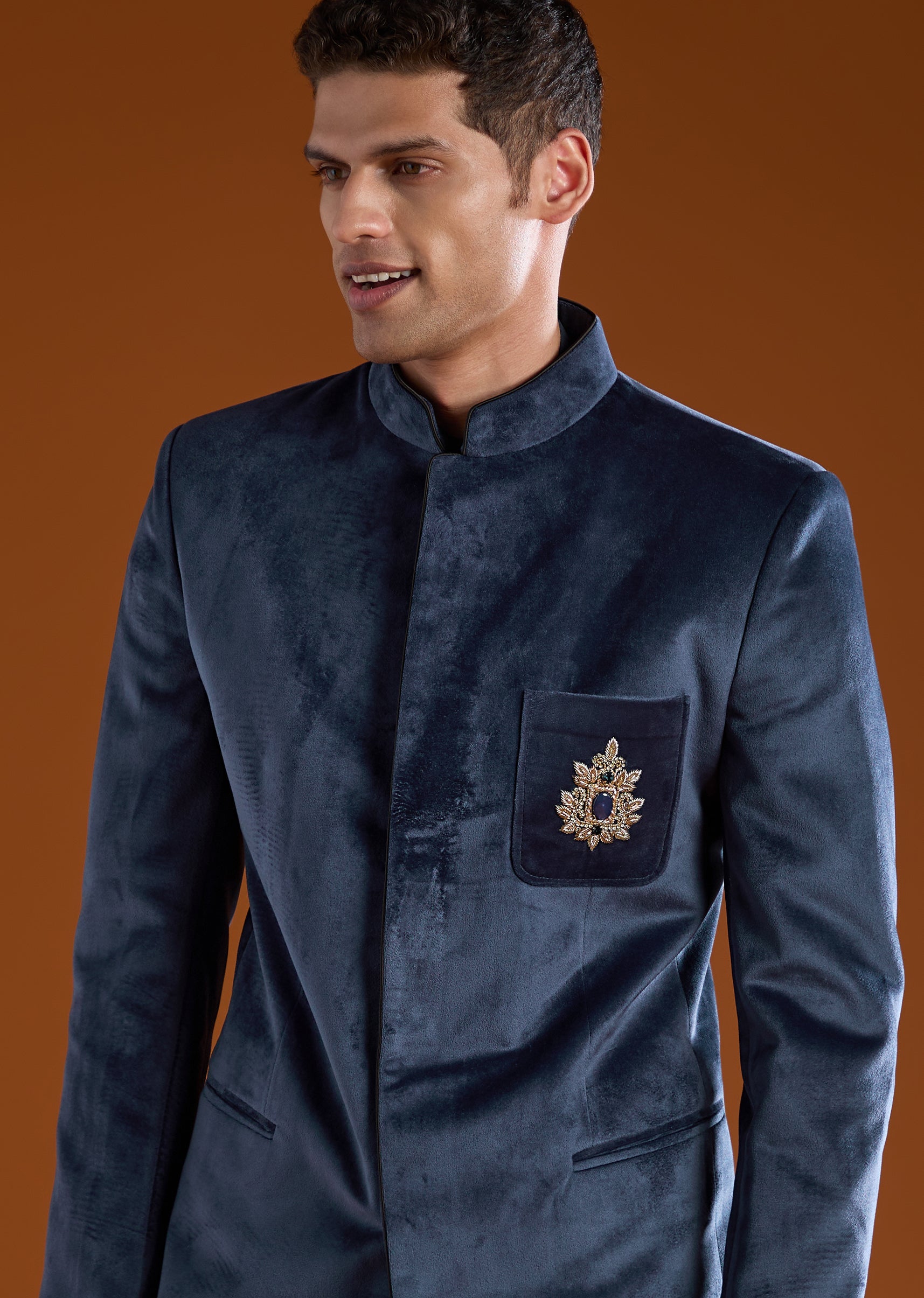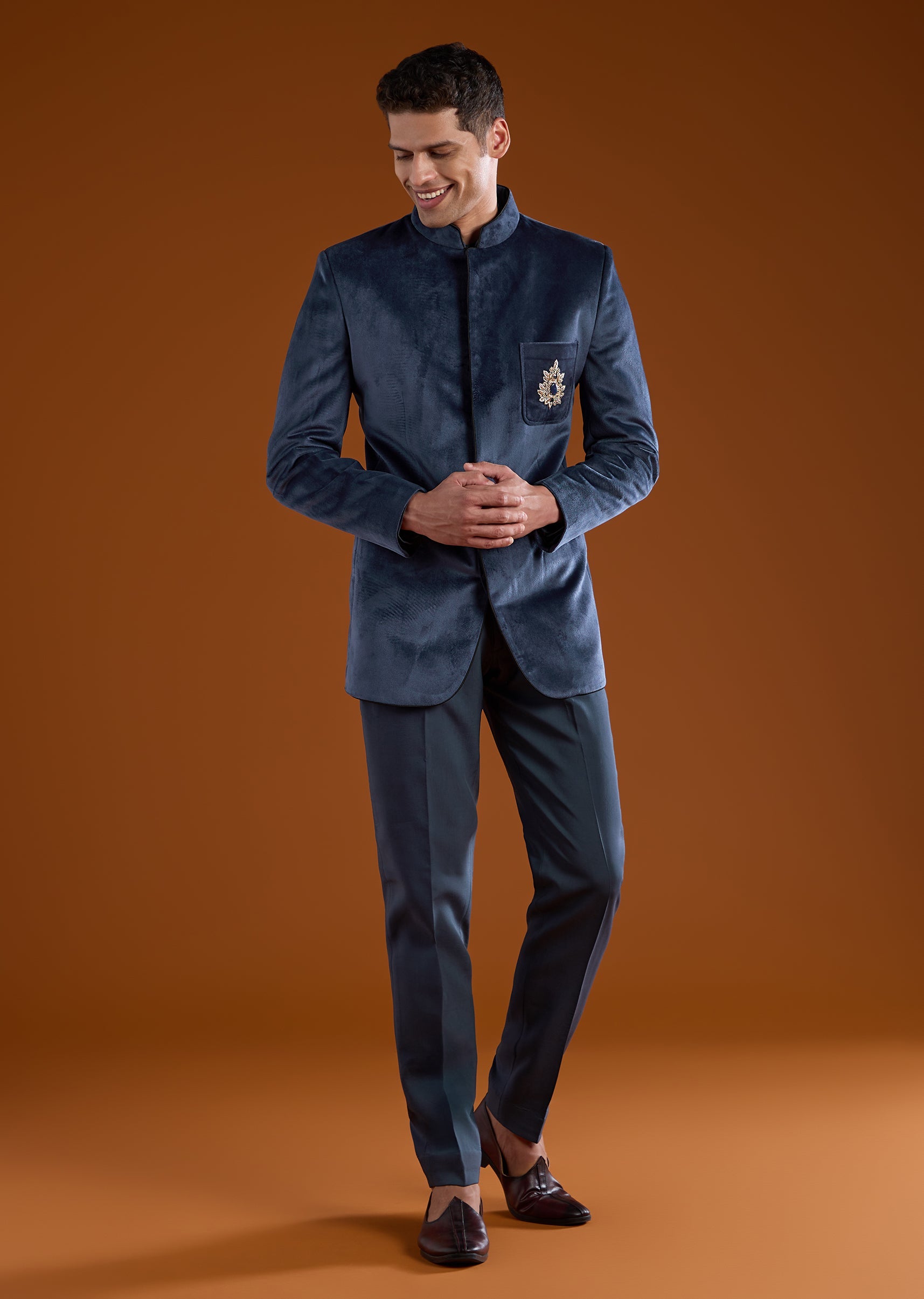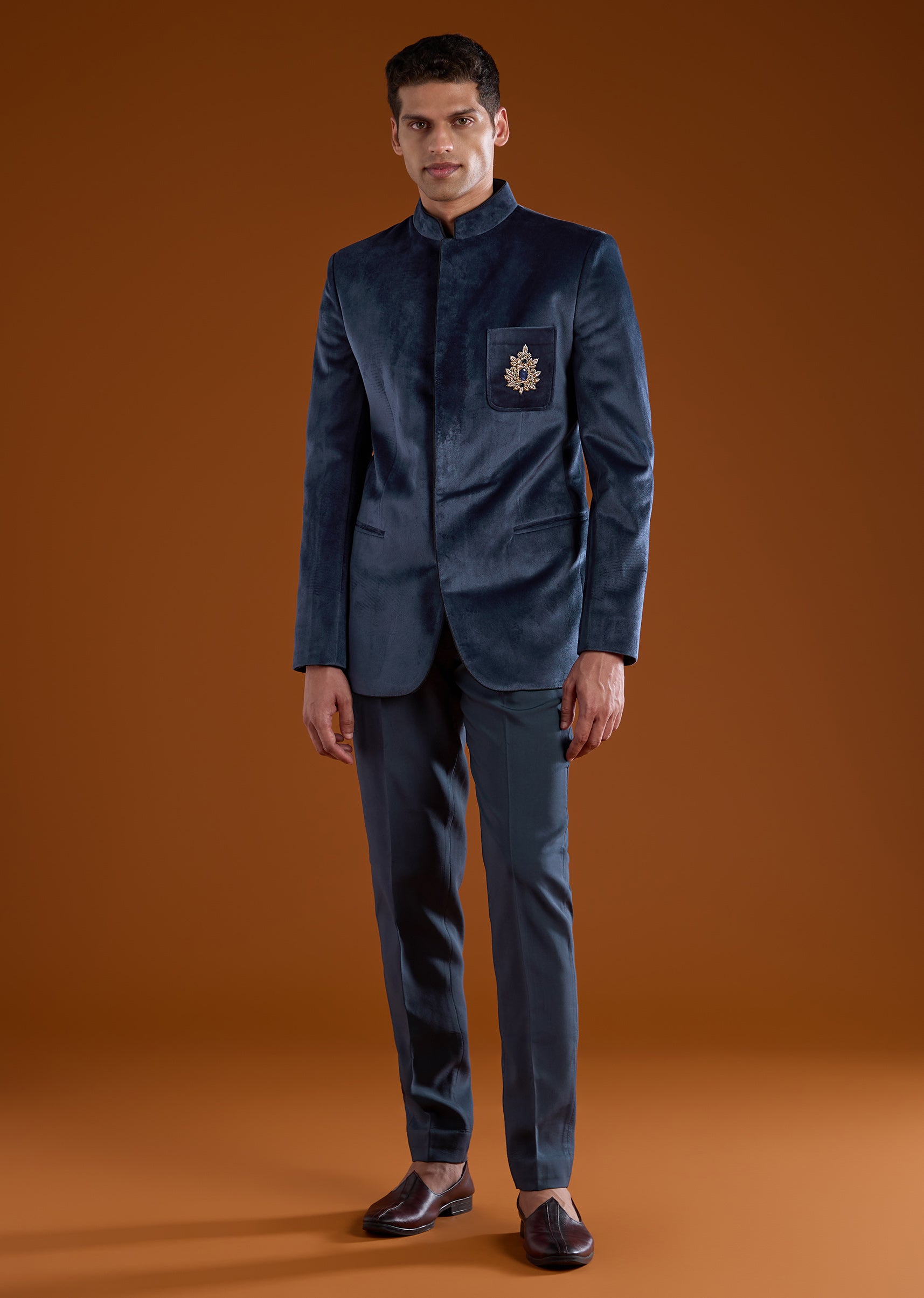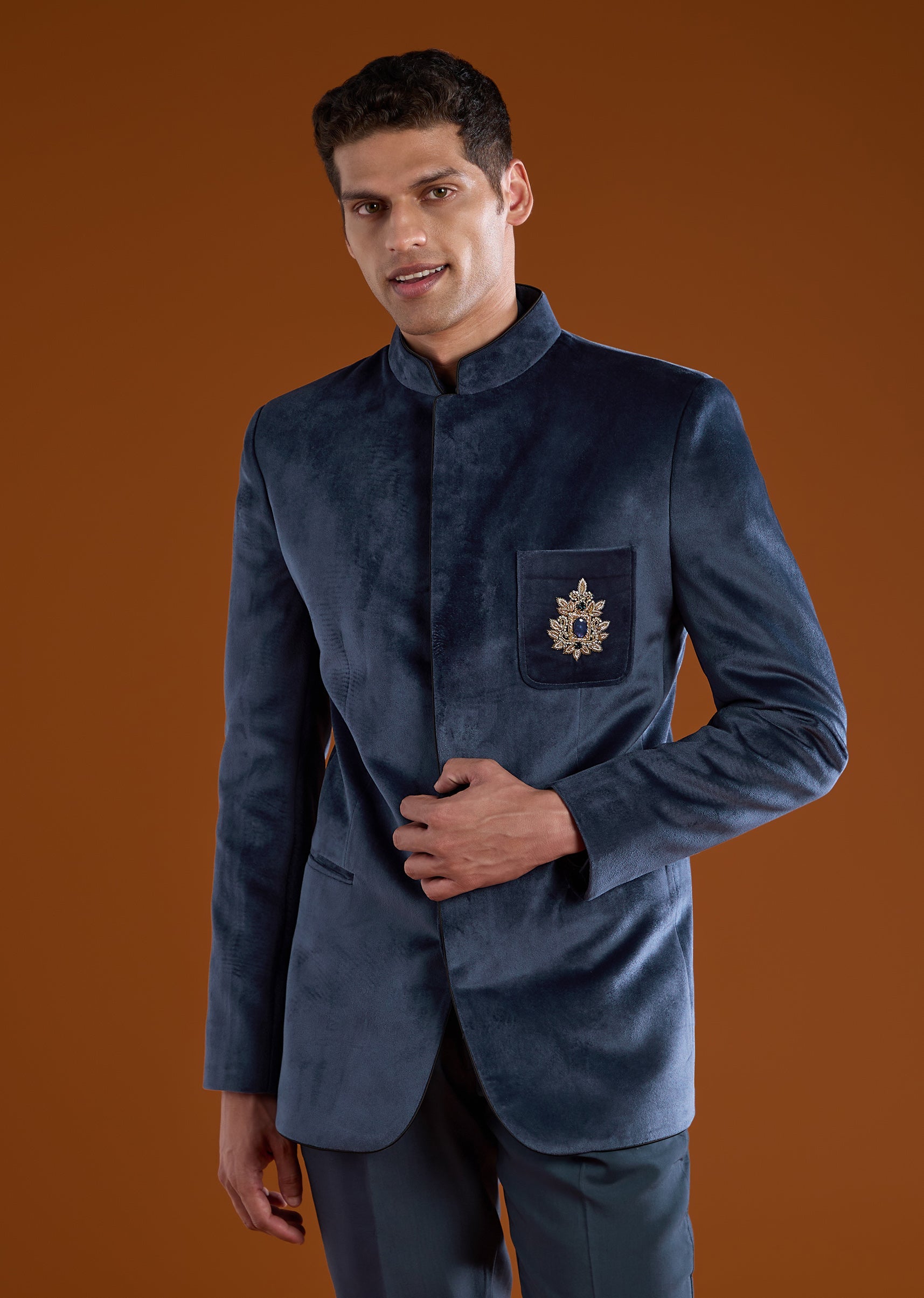 Elevate your formal wardrobe with this luxurious velvet jodhpuri set adorned with detailed motif work, rich zardosi embroidery, and sparkling stone and diamond embellishments that create a commanding royal look. The full sleeve jodhpuri jacket features a classic mandarin collar and a front hook eye closure that adds structure and sophistication. Paired with a crisp shirt and tailored pants, the ensemble delivers a refined blend of traditional craftsmanship and modern elegance, perfect for weddings, receptions, and high profile celebrations. Awarded as the Most Trusted Brand, we're delivering styles you love, just as promised.