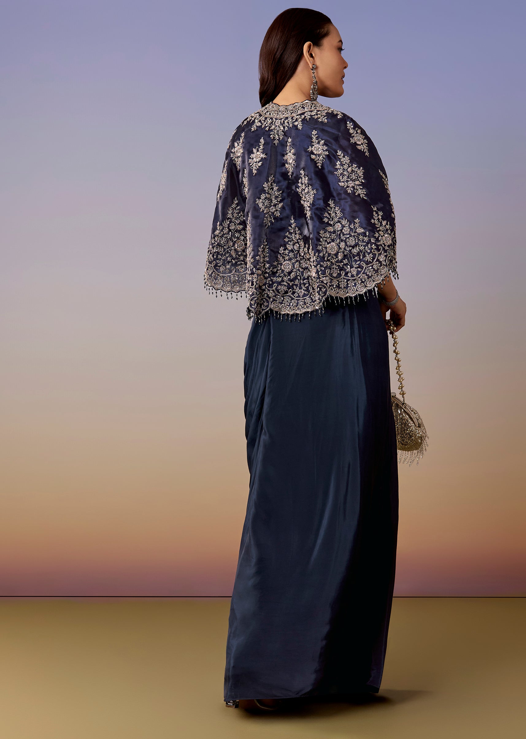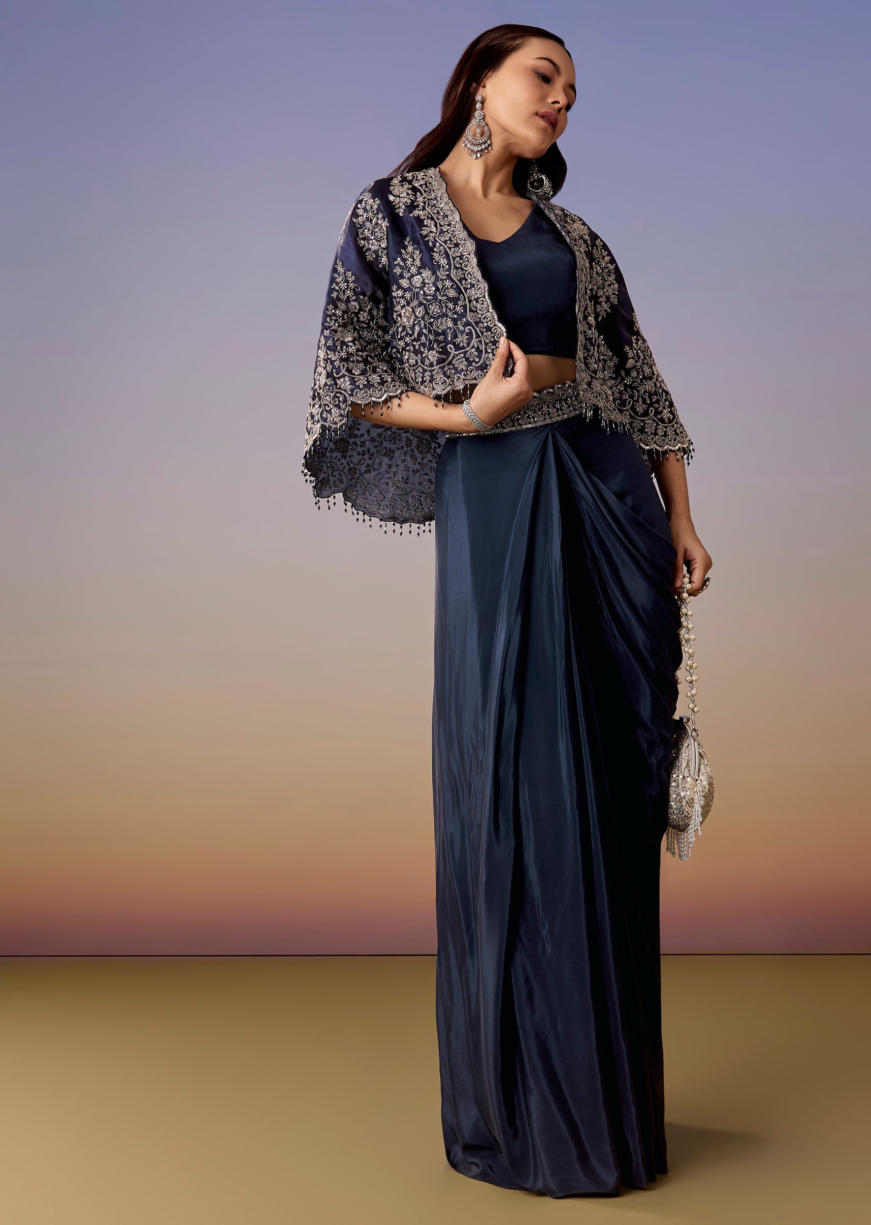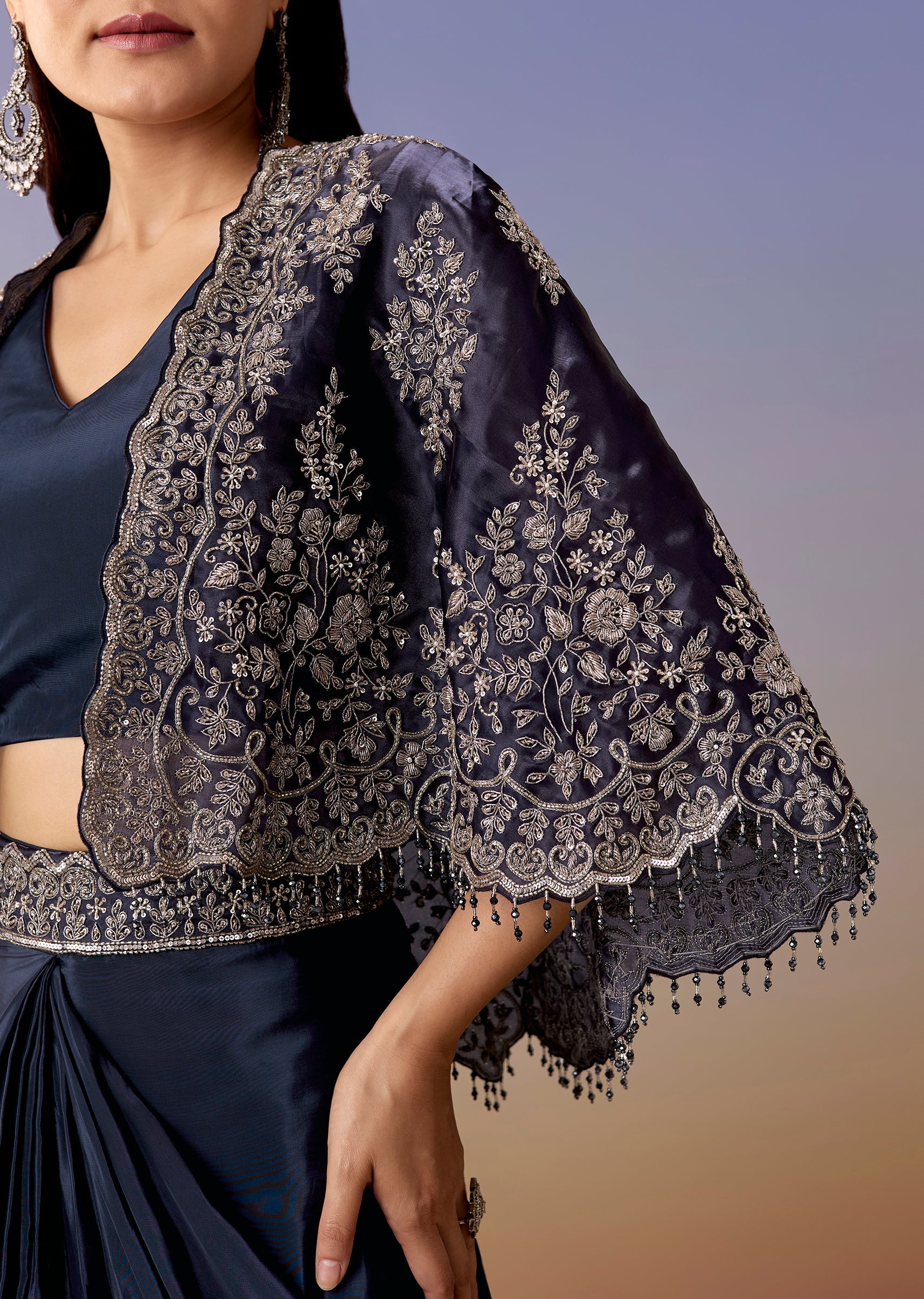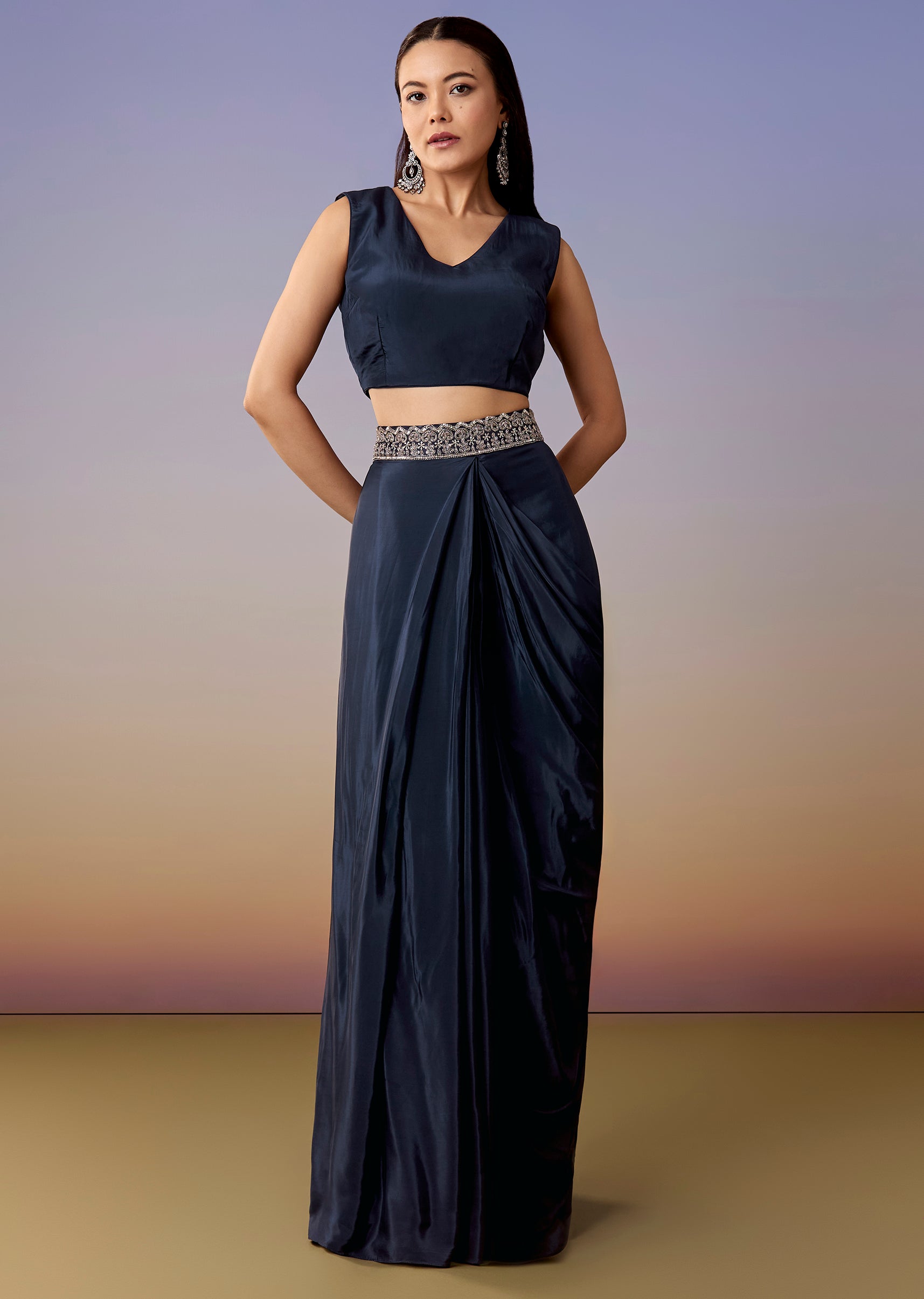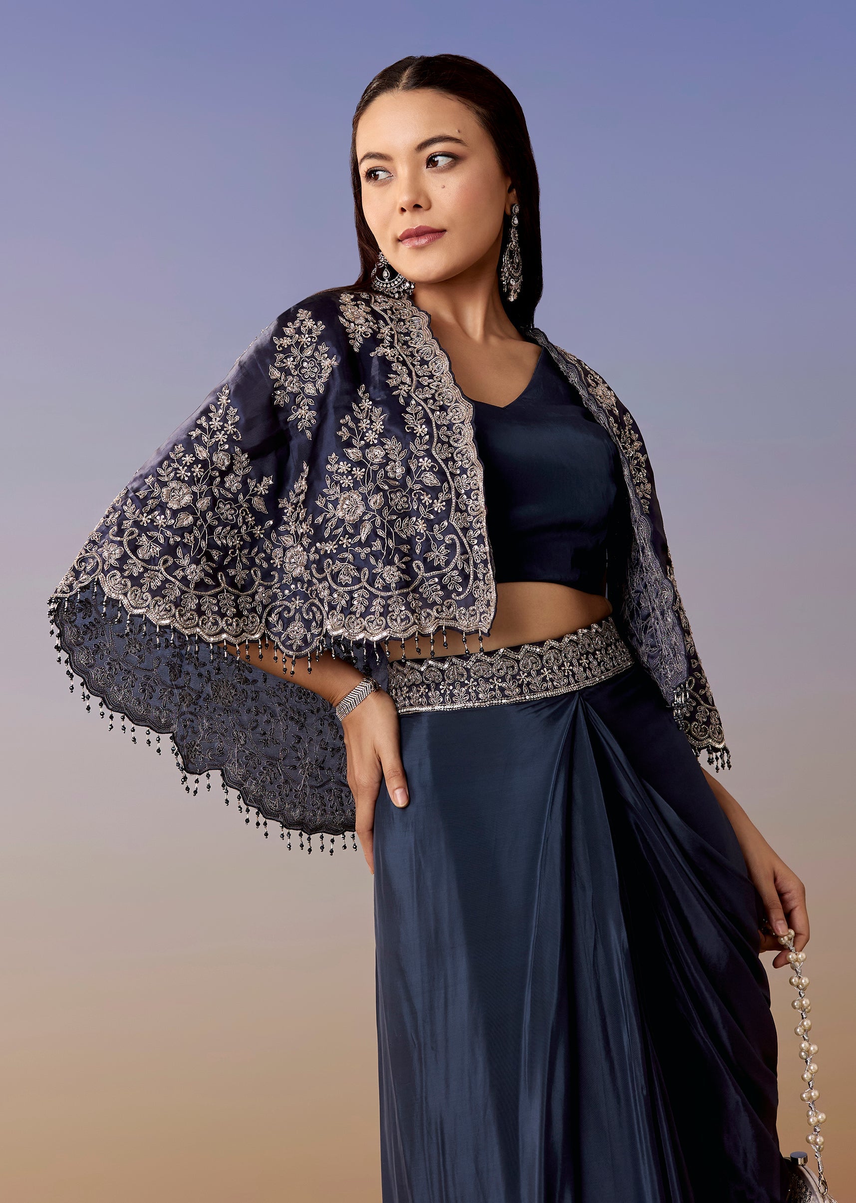 A contemporary navy set with a sleeveless V-neck crop top, drape skirt, and a liquid organza cape highlighted with zardosi, sequins, and cut dana work. Side-zip finish and mid-waist fit... More Product Details