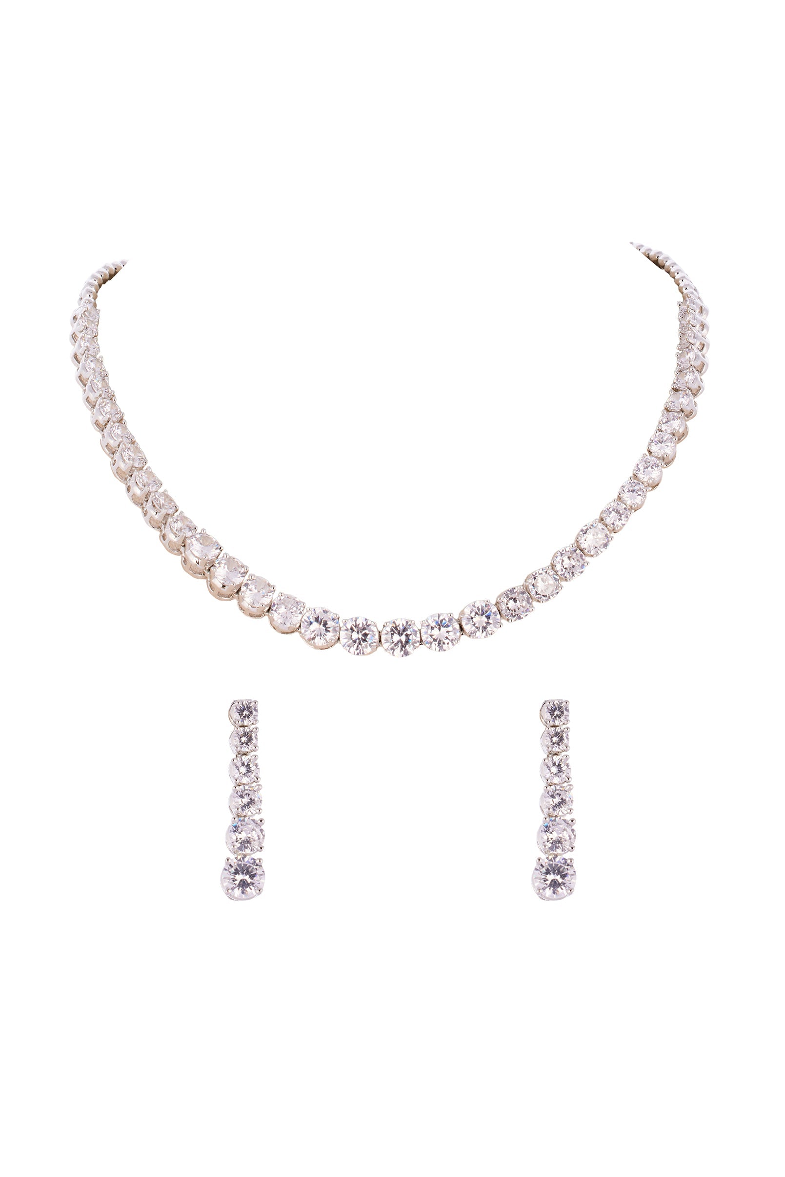 A refined silver and white necklace set embellished with shimmering zircons set using a contemporary technique. Handcrafted with precision, this piece brings a modern sparkle to traditional Indian jewelry, making it perfect for festive gatherings and party occasions where a touch of polished elegance is desired.