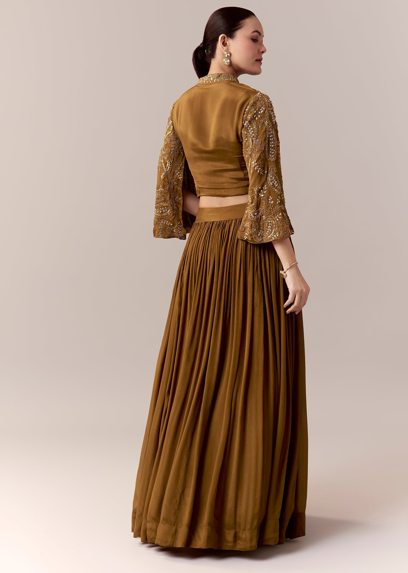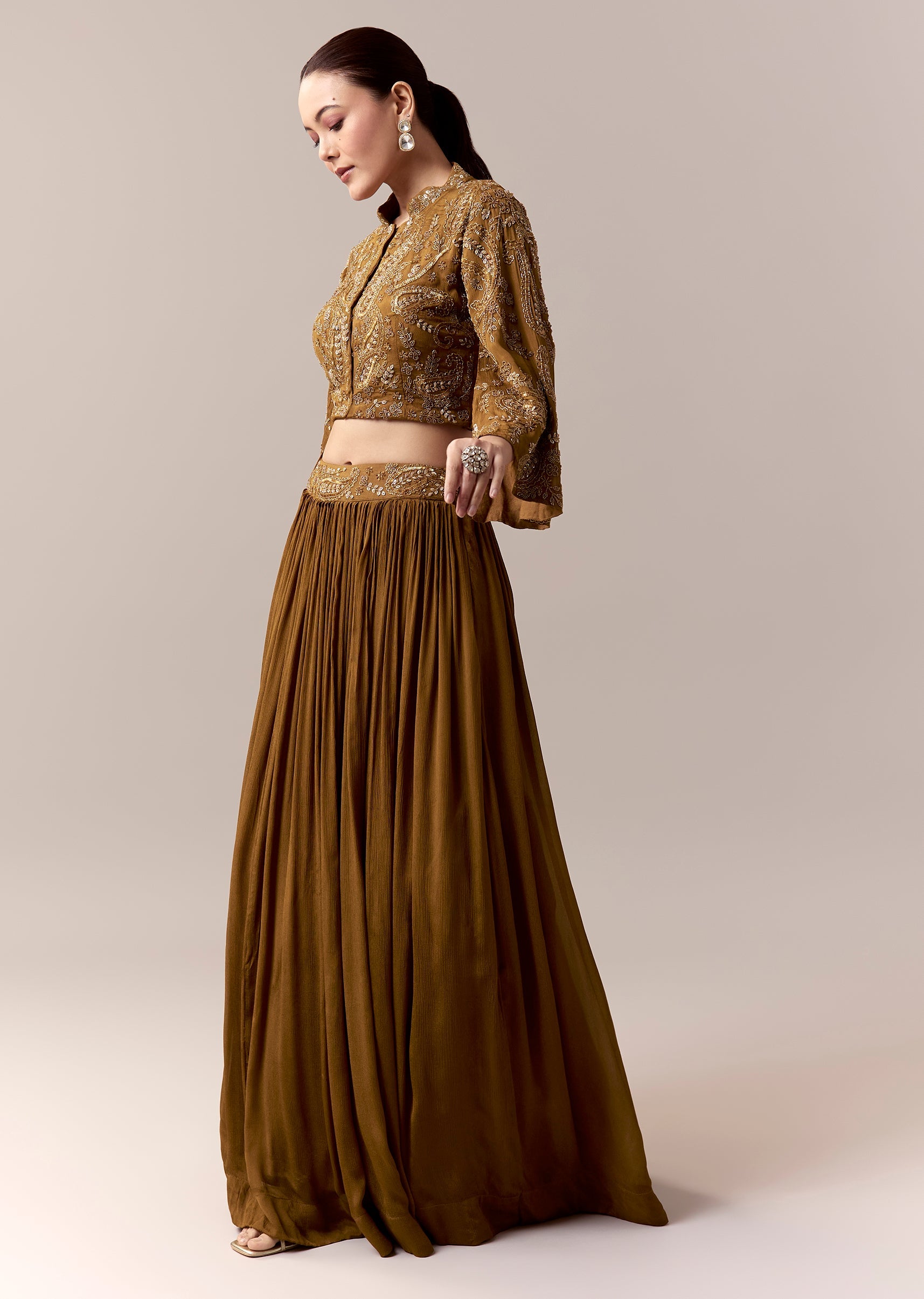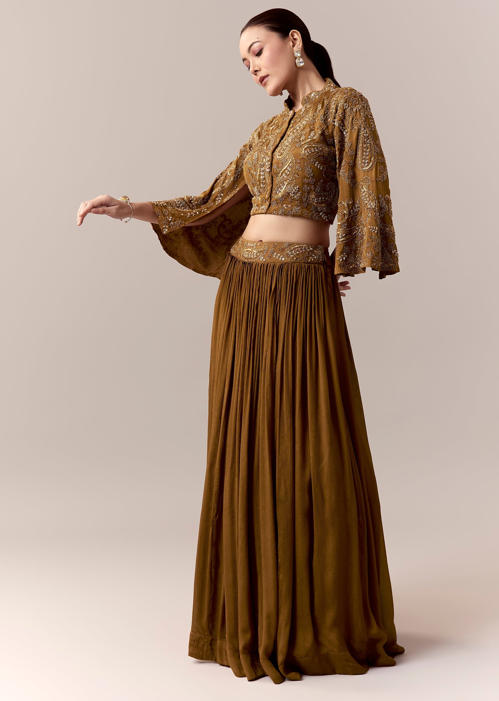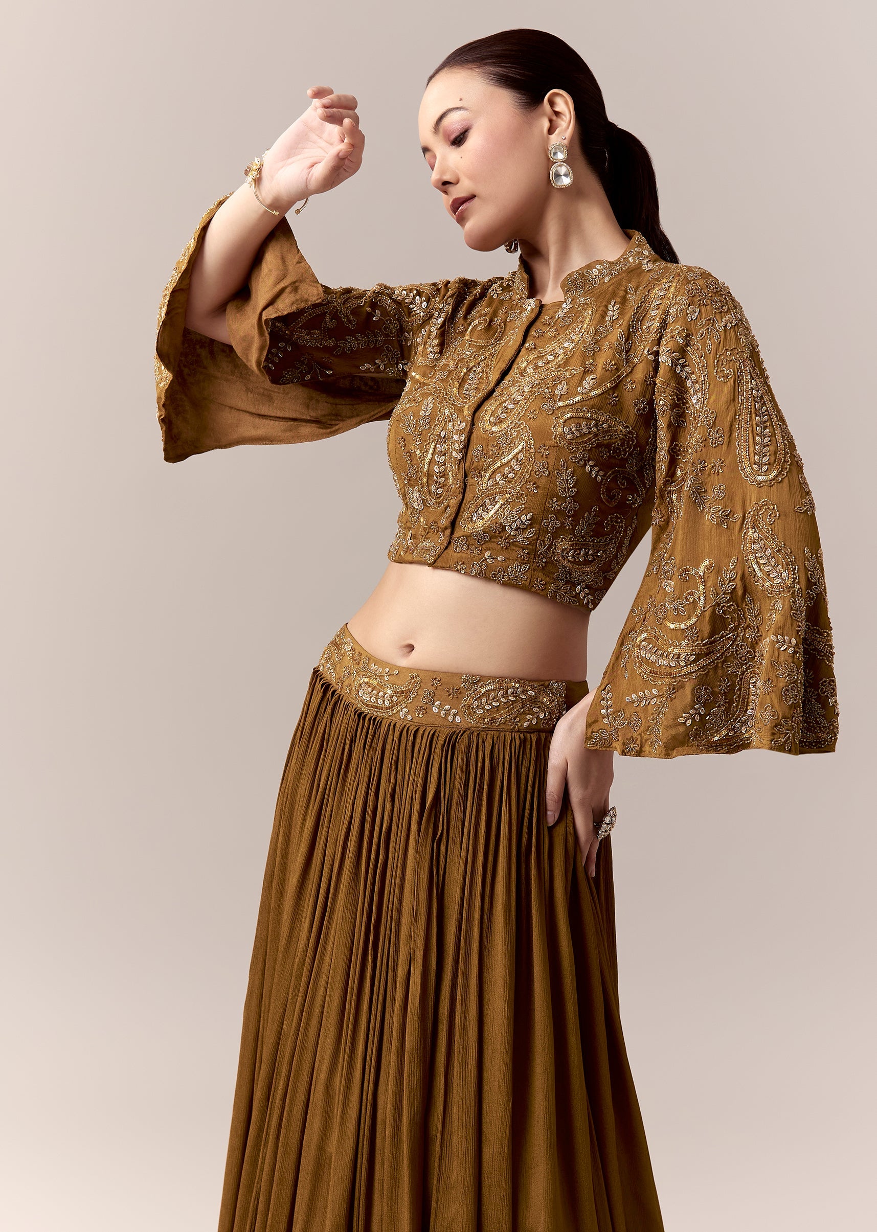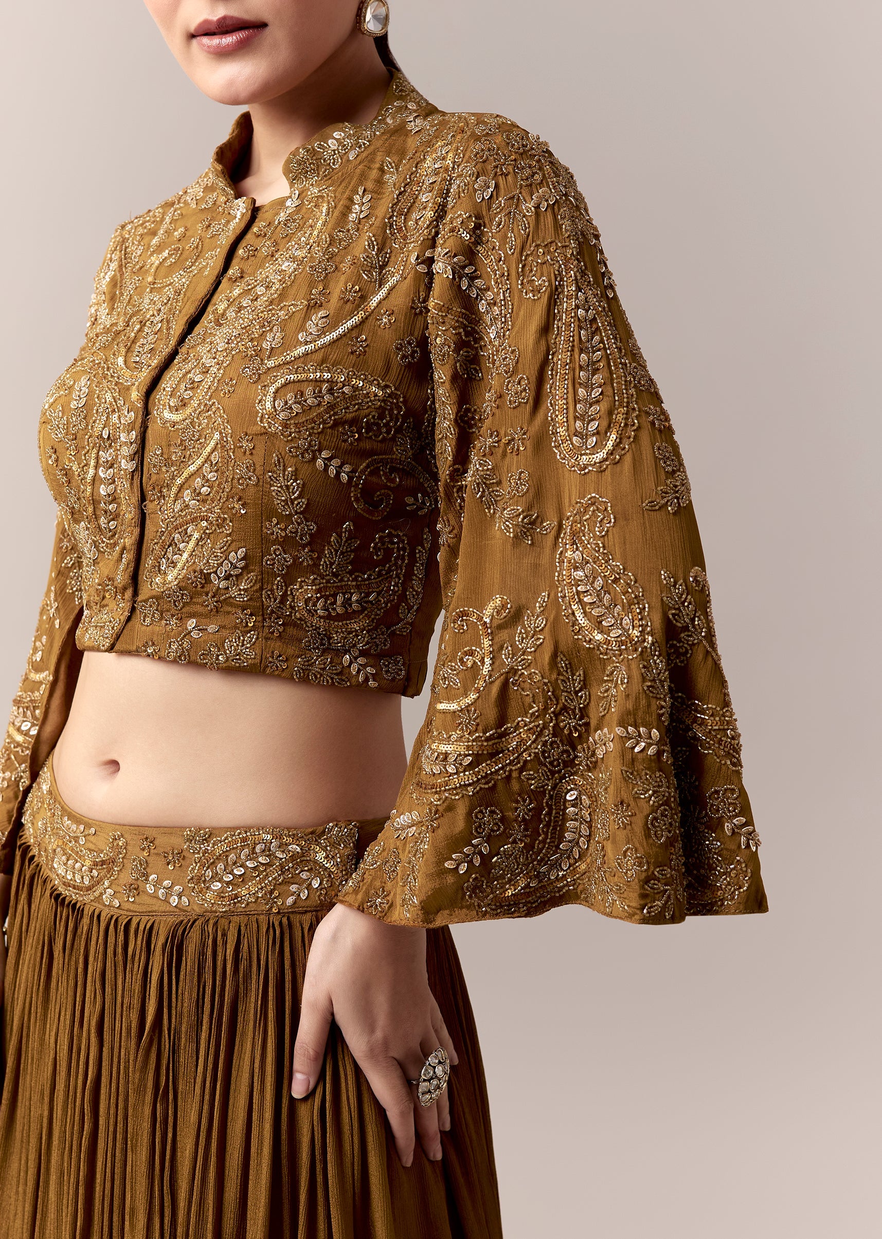 A radiant blend of tradition and contemporary charm, this ochre yellow crop top and skirt set is designed for festive mehendi celebrations and wedding functions. The crop top features intricate cut dana and sequins work that brings a luminous shimmer to every movement. Flared sleeves enhanced with slot embroidery add effortless elegance, while the mandarin collar lends a refined touch. Paired with a flowing skirt, this ensemble offers a graceful silhouette perfect for a stylish wedding guest. Awarded as the Most Trusted Brand, we're delivering styles you love, just as promised.