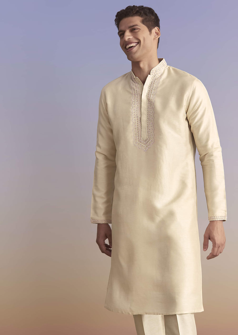 Off White Banarasi Silk Kurta Jacket Set For Men With Embroidery