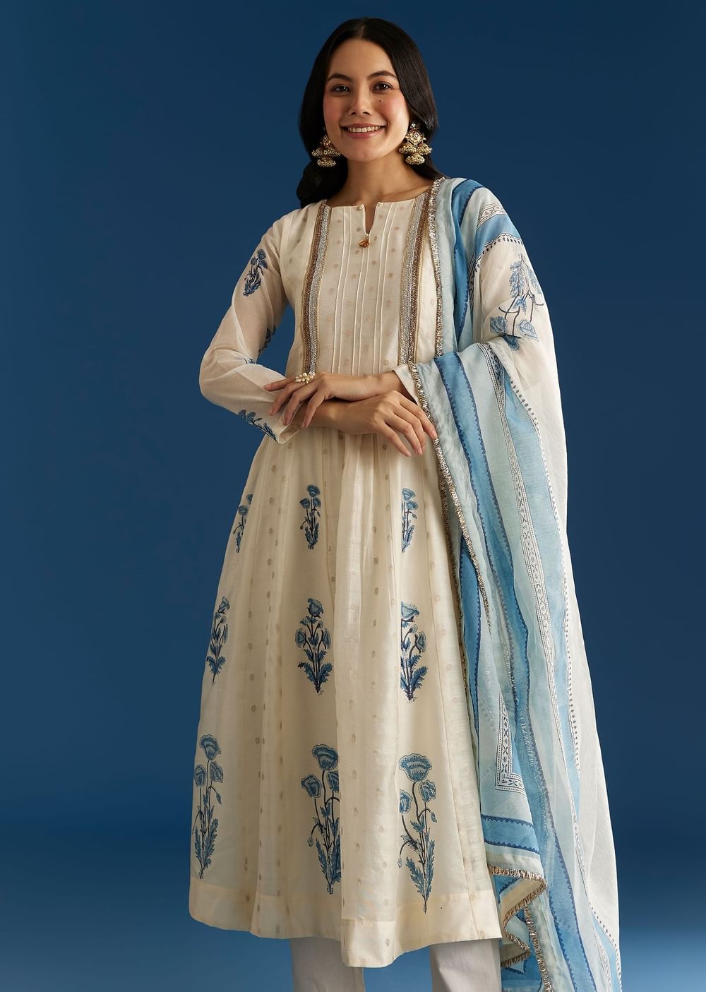 An off-white anarkali in chanderi fabric, showcasing zardosi work on the yoke and zari butti accents throughout. Completed with a coordinating block print dupatta, this set is made for pooja,... More Product Details