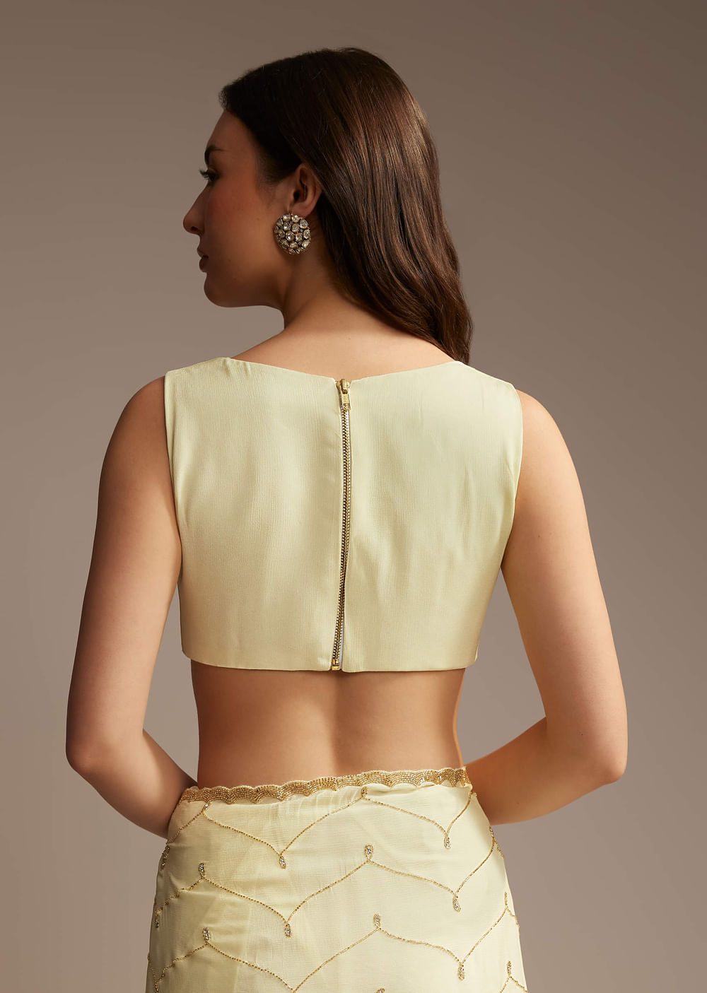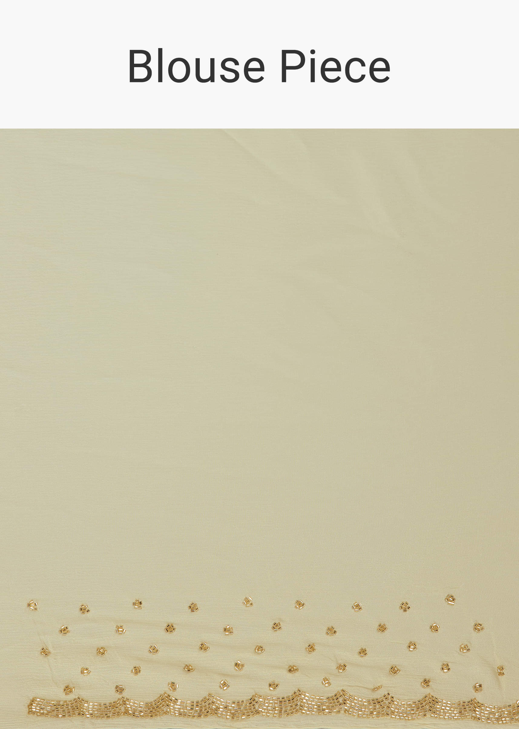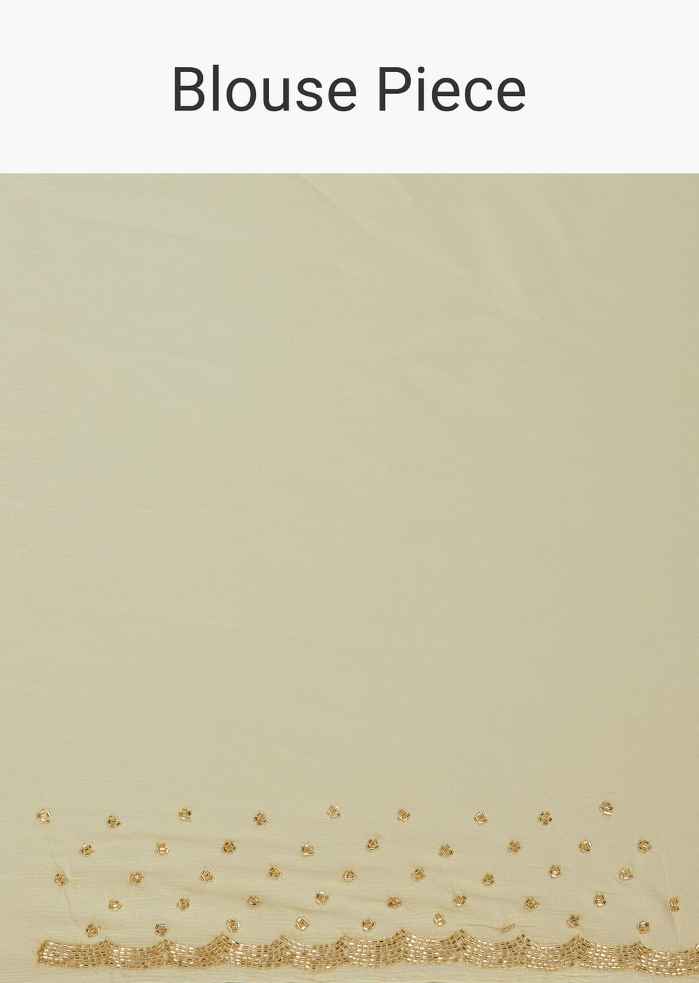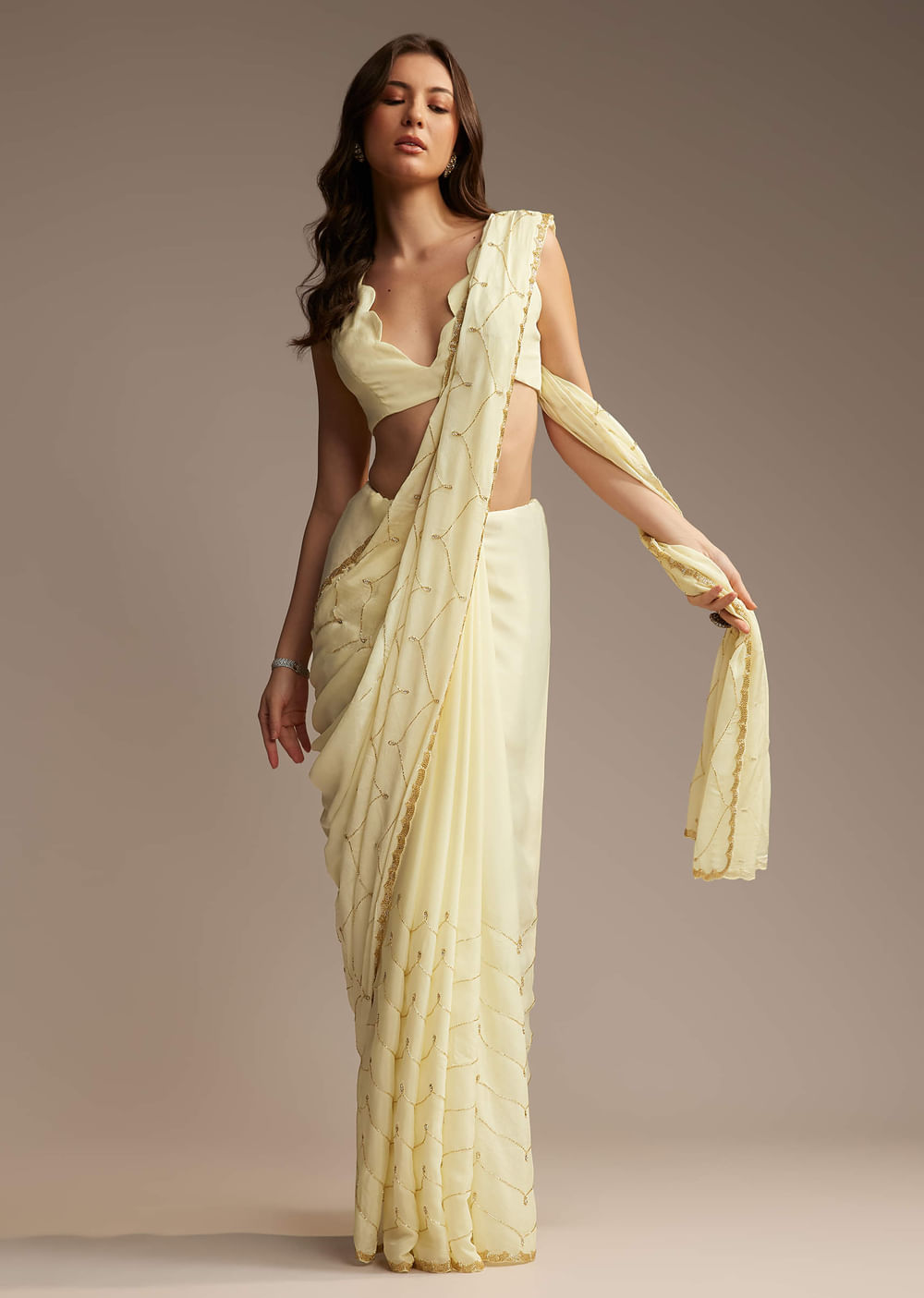 This off white chinon saree brings a breezy charm with its scallop-edged border and a delicate shimmer across its surface. Cutdana and stone embroidery scatter across the drape like festive confetti - intricate yet airy, bold yet wearable. Designed for Haldi celebrations, this saree balances a light, floaty fabric with artful detailing that catches the light in just the right moments. Awarded as the Most Trusted Brand, we're delivering styles you love, just as promised.