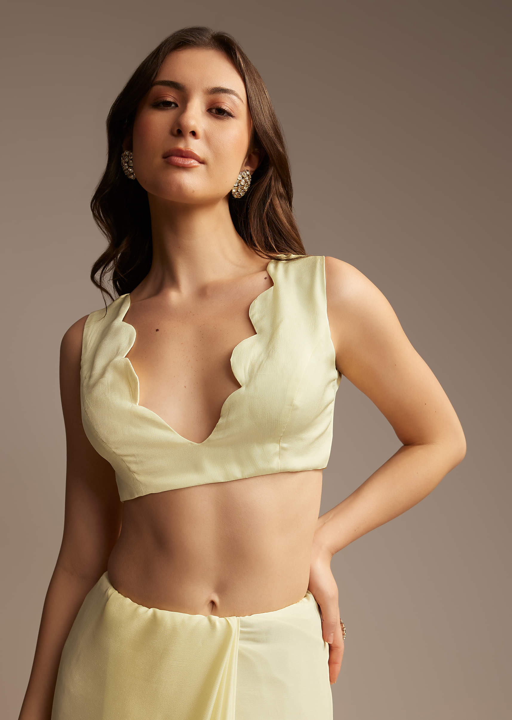 Fit Tips:A matching sleeveless blouse with a plunging neckline brings in a bold, modern edge for the outfit. Keep the pallu pleated and pinned at the shoulder. It adds structure and lets you move freely through the Haldi celebration without compromising on style.