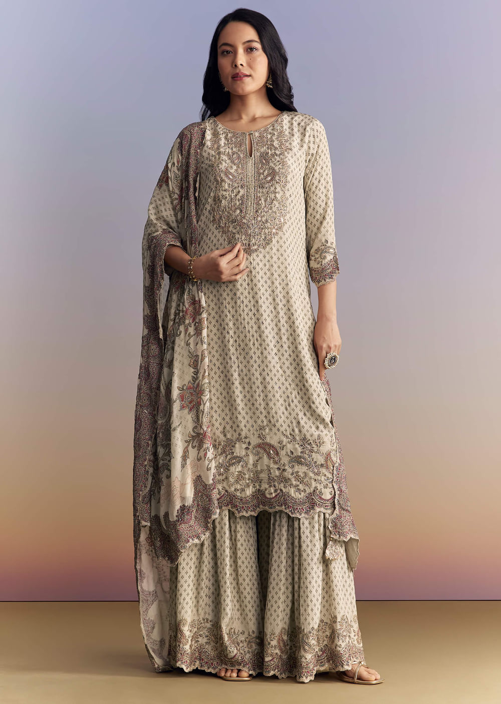 For festive plans that need easy movement, this off white crepe sharara suit keeps the palette fresh and the print in focus. Paisley motifs add a classic touch that photographs... More Product Details