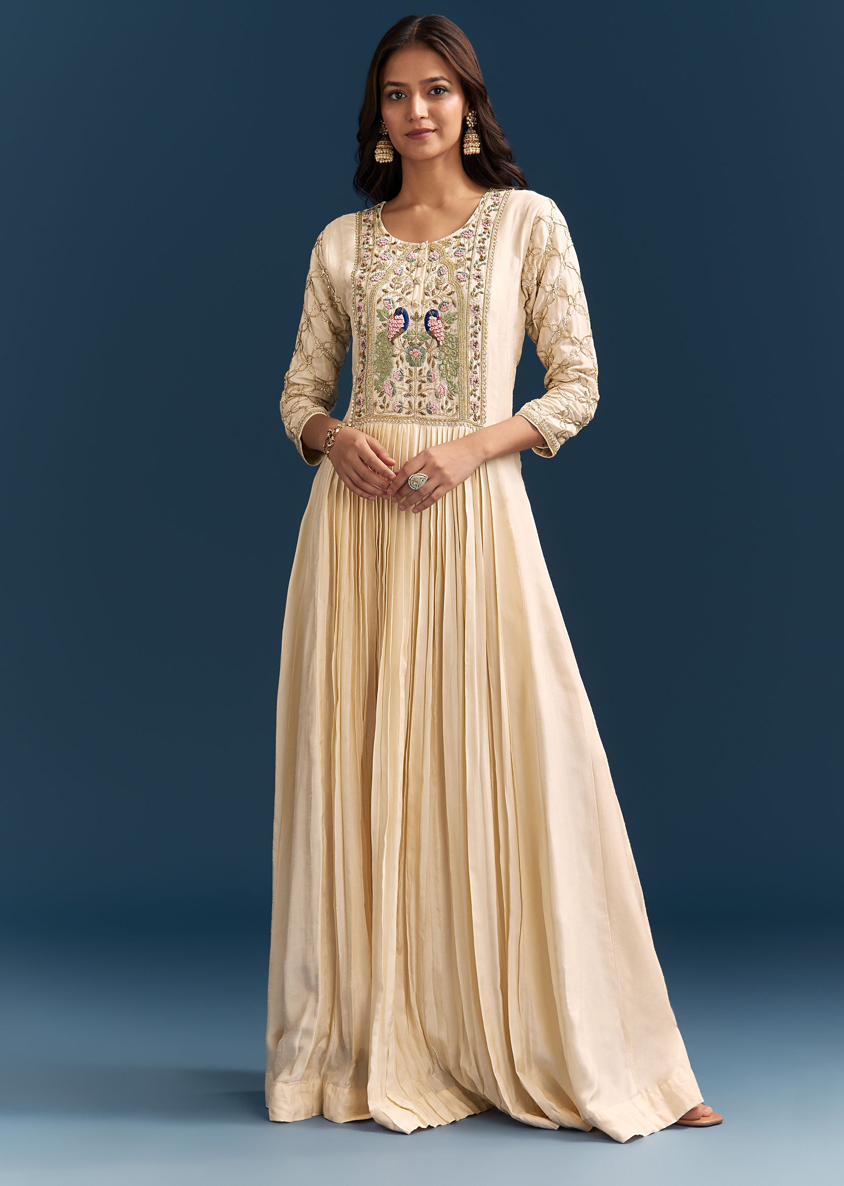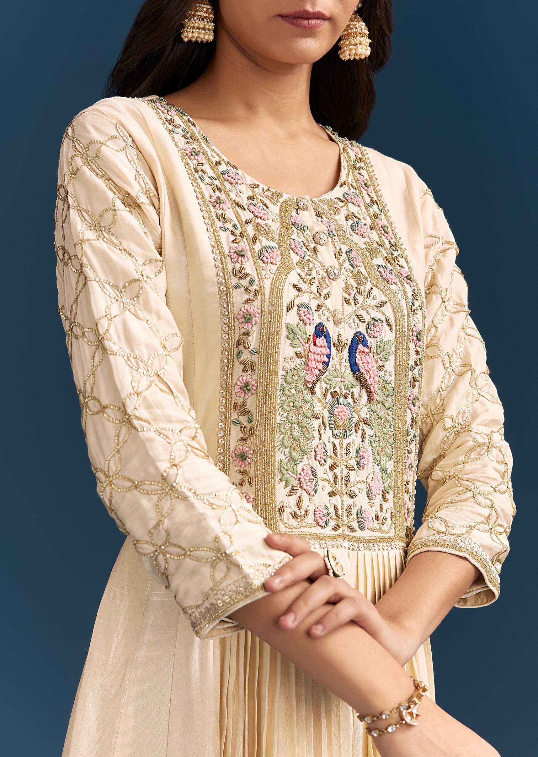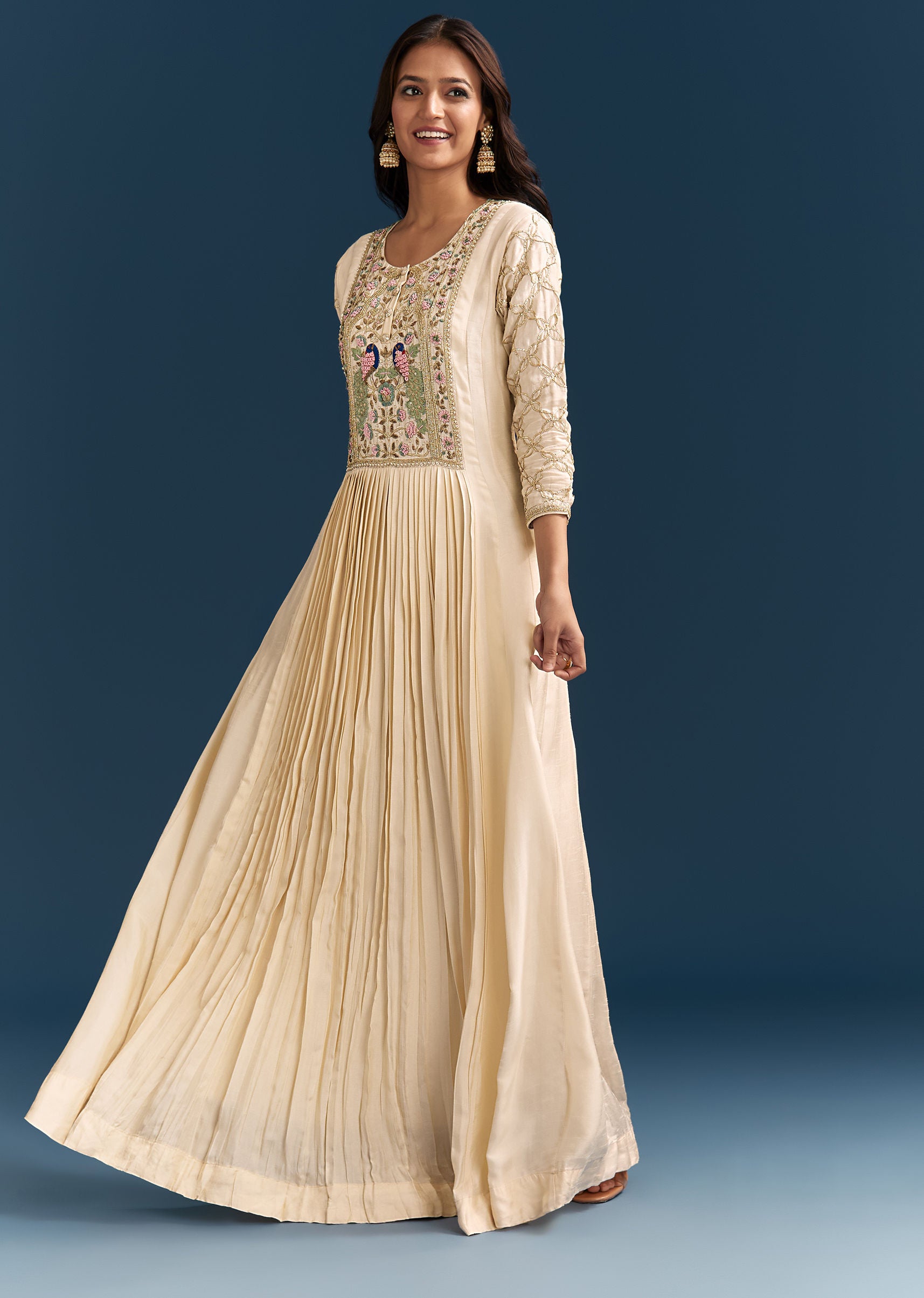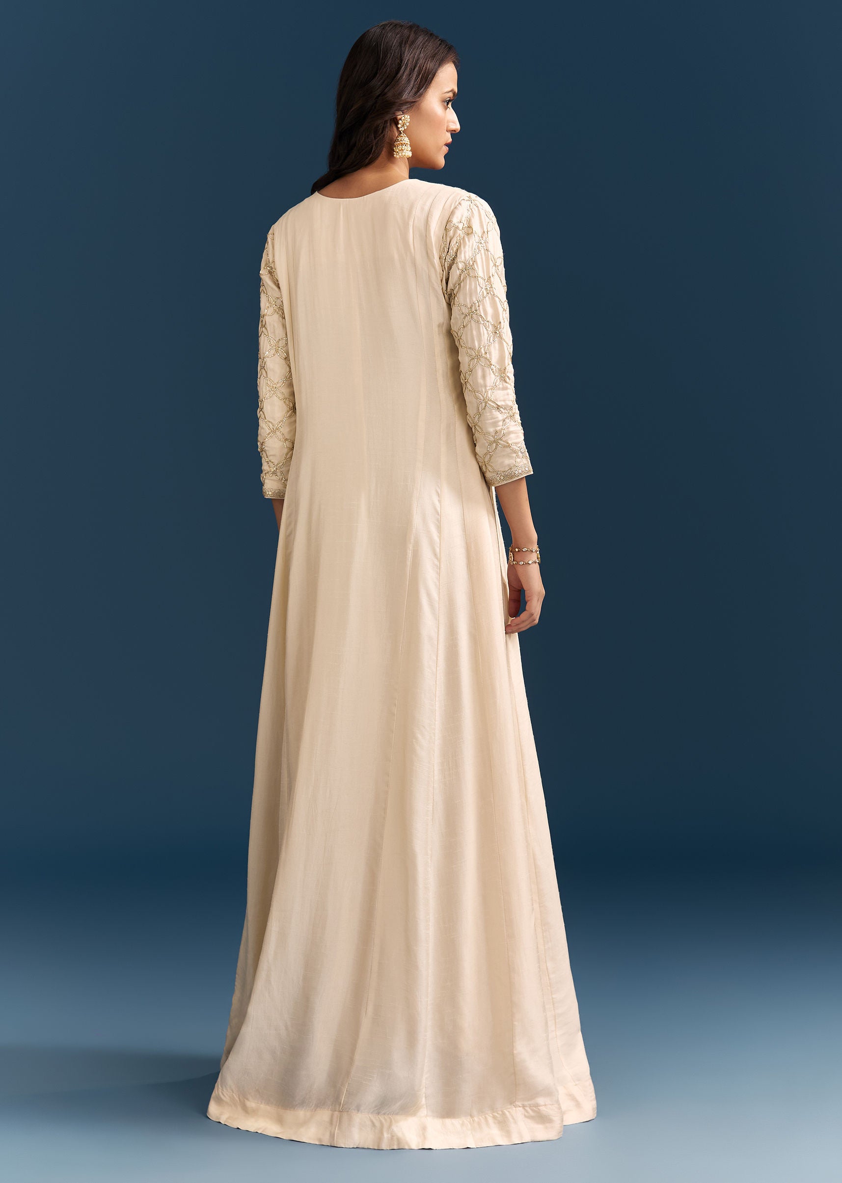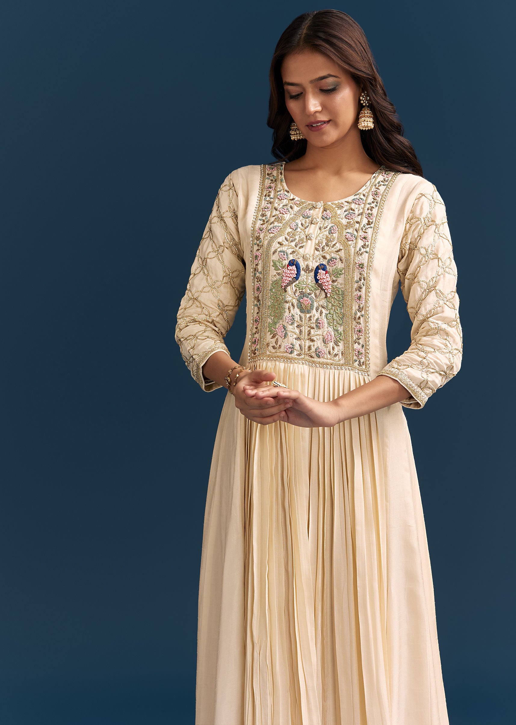 Crafted in luxurious off white dola silk, this Anarkali is adorned with beads, gotta, and cut dana work. A graceful silhouette for festive mornings or intimate family functions. Awarded as... More Product Details