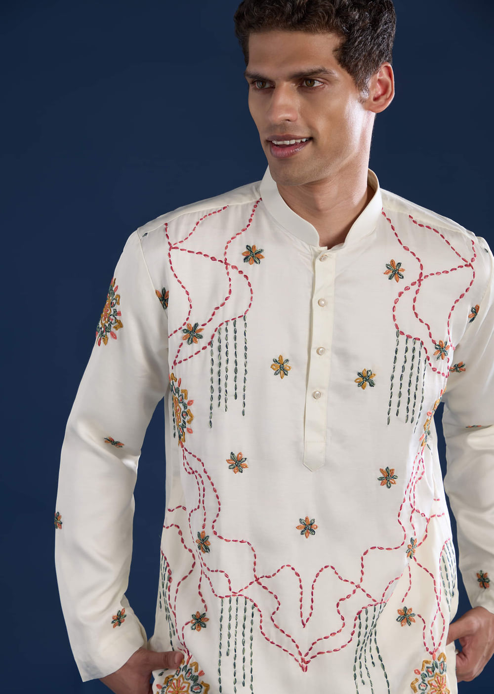 Off White Embroidered Mens Kurta Set with Bandhani Print Dupatta