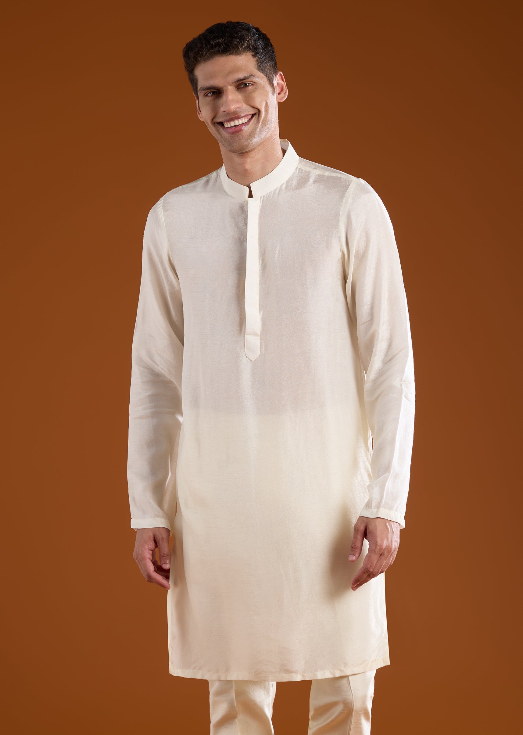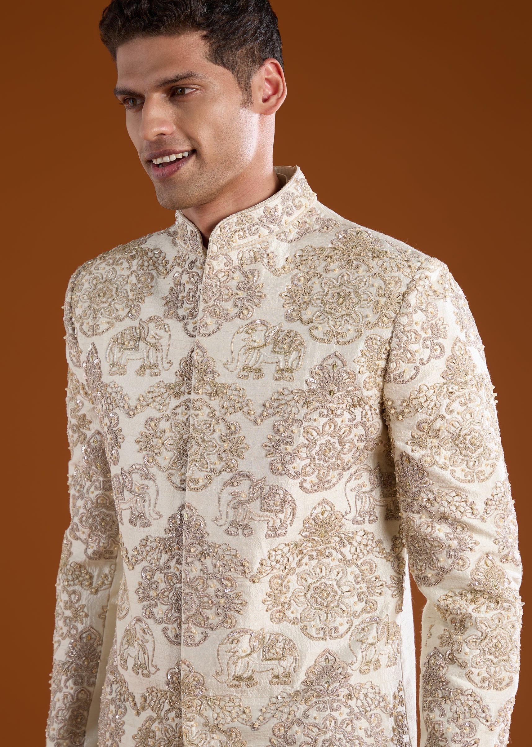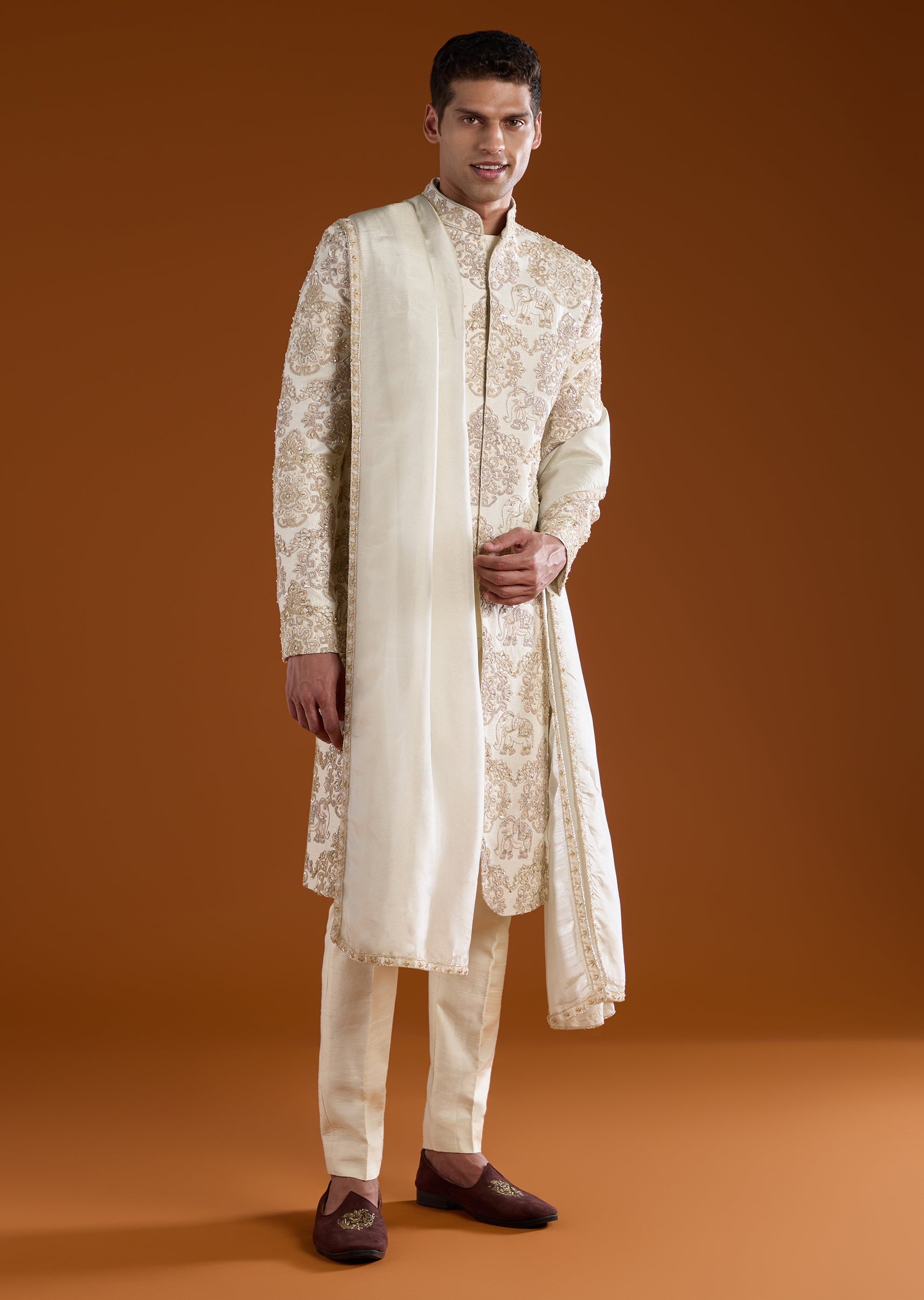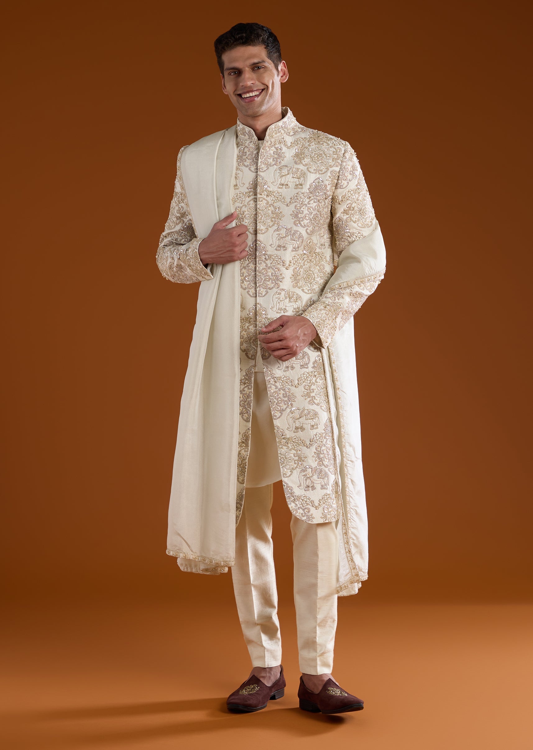 Off White Embroidered Silk Sherwani Kurta Set with Dupatta