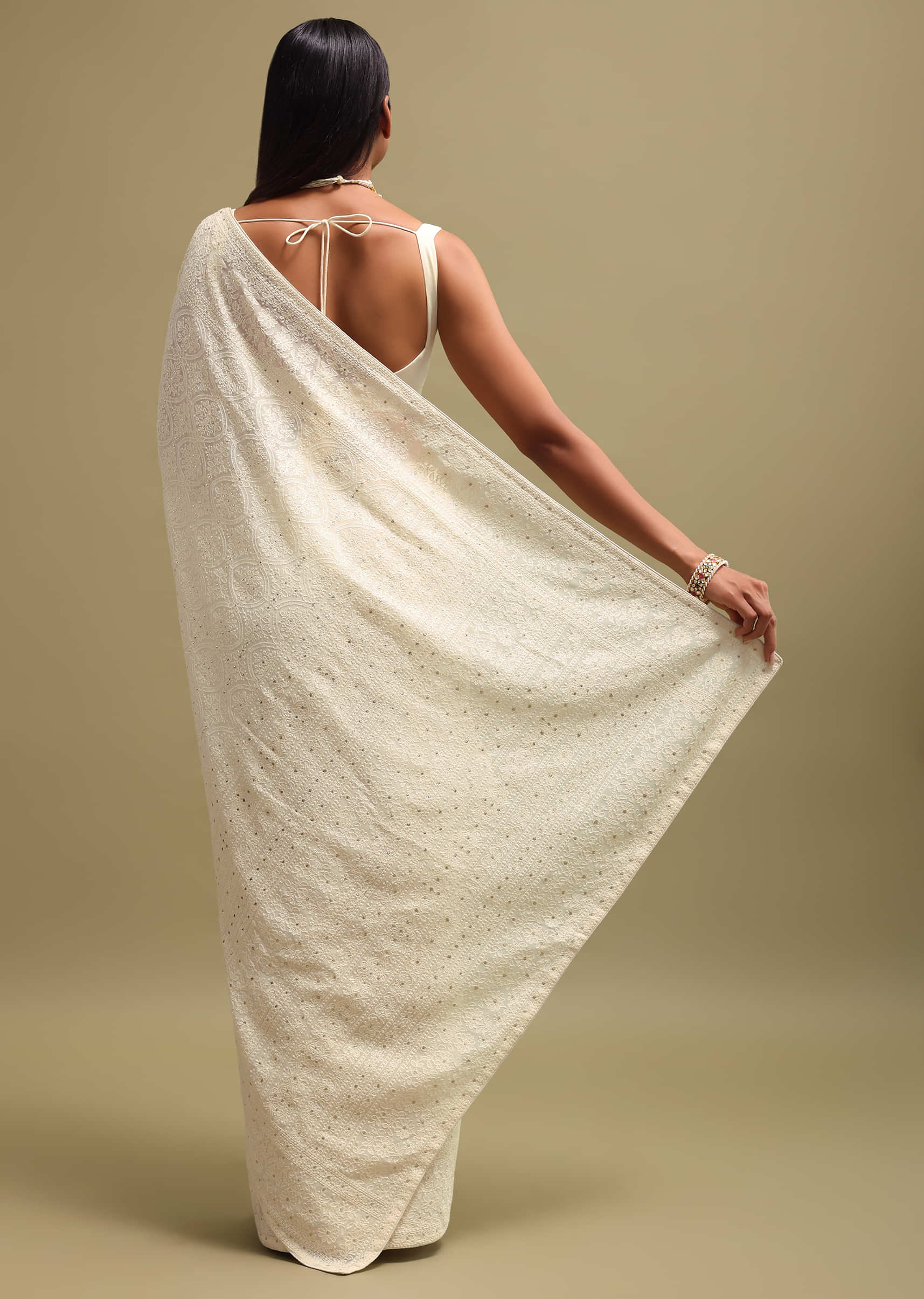 Off White Georgette Chikankari Saree With Unstitched Blouse