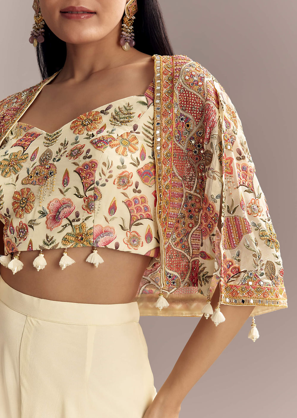 Off White Georgette Crop Top And Palazzo Set With Embroidered Cape