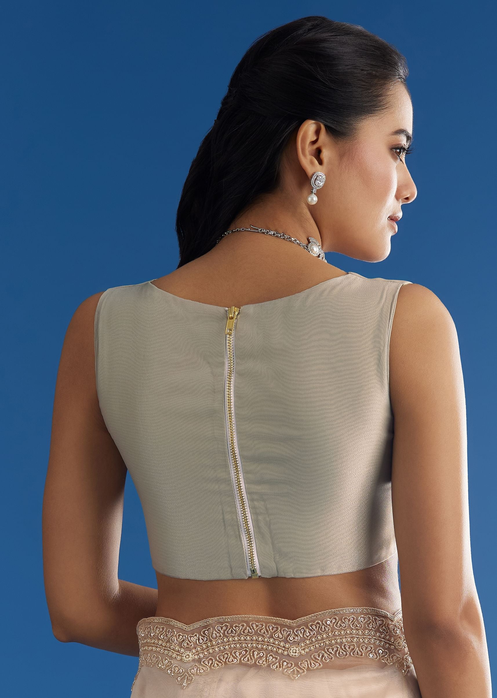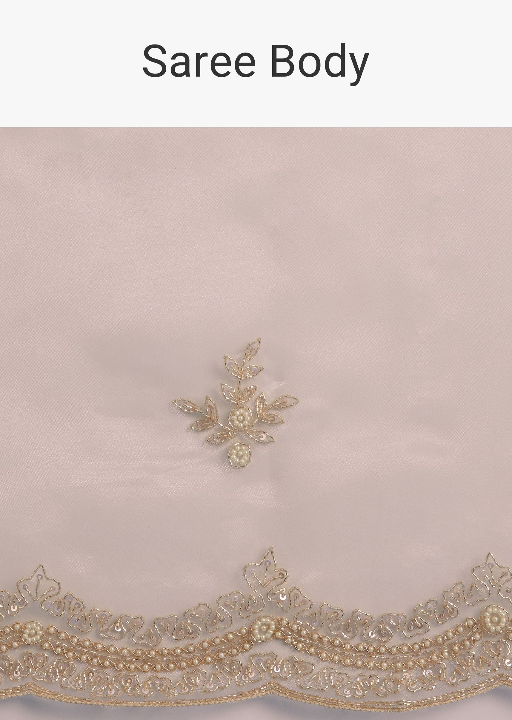 Off-white elegance meets sparkle in this glass tissue saree, embroidered with cutdana, sequins, and beads along a scalloped border—an ethereal ensemble. Awarded as the Most Trusted Brand, we're delivering styles you love, just as promised.
