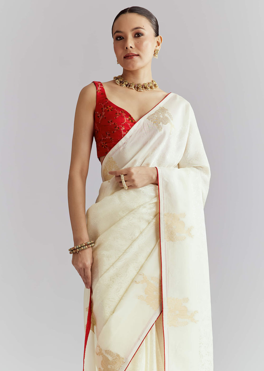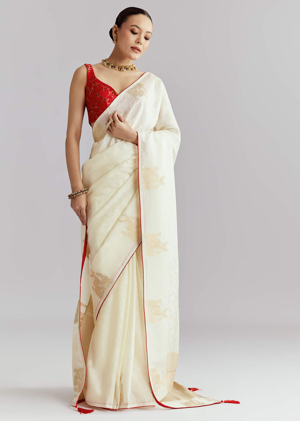 Off White Jacquard Silk Woven Saree With Zari Embroidery
