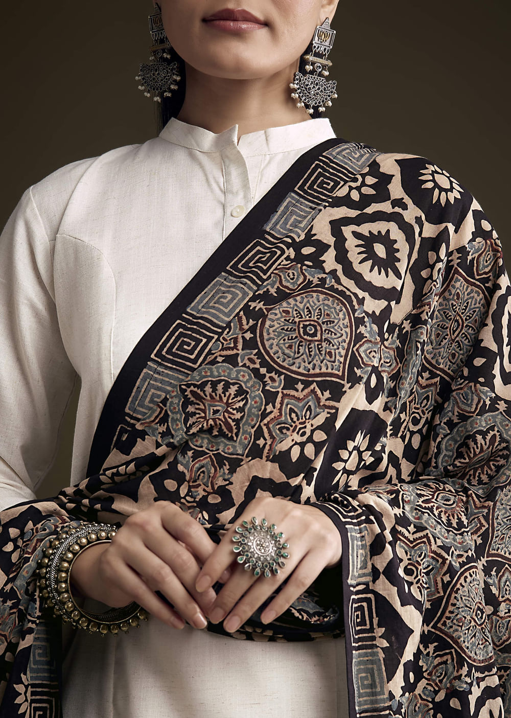 Off White Khadi Dhoti Suit With Black Hand Dyed Ajrakh Dupatta