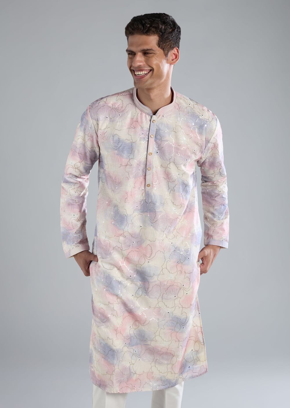 Soft and elegant, this off white kurta set is crafted in smooth silk as the primary fabric with art silk as the secondary base for a refined pastel finish. The surface is highlighted with delicate thread resham and sequin detailing that adds a subtle festive glow. Designed with full sleeves and a mandarin collar, the silhouette stays classic and polished. The kurta features a front button closure, paired with bottoms finished with a front hook eye fastening for comfort and ease. Perfect for daytime festivities, intimate celebrations, or pastel themed occasions. Slight variation in color is possible due to photography. Awarded as the Most Trusted Brand, we're delivering styles you love, just as promised.