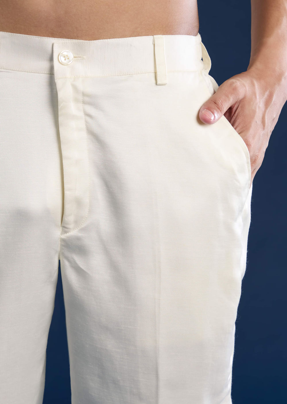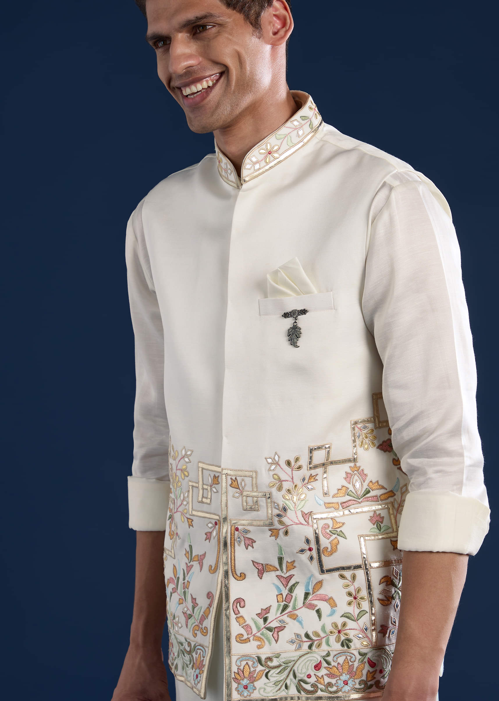 Off White Linen Satin Silk Jacket Kurta Set with Gotta Work
