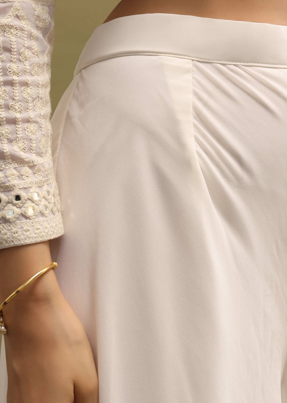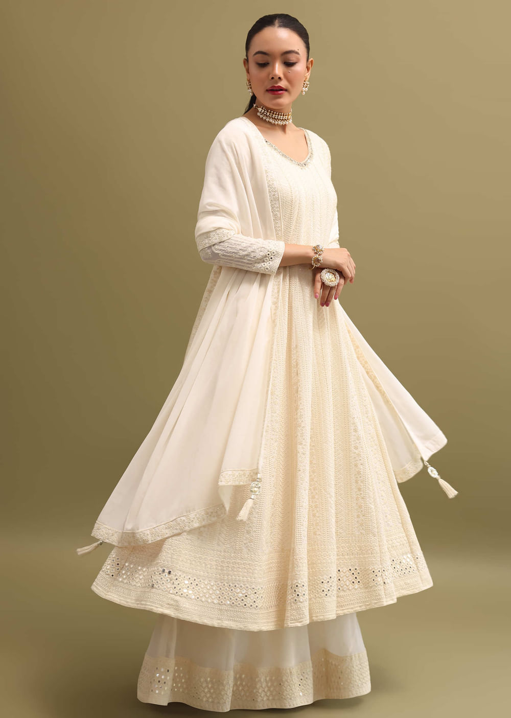 Enhance your elegance with our off-white Anarkali suit, specially designed for mehendi and sangeet events. Crafted from a georgette base, this suit is adorned with mirror, moti, and Lucknowi work.... More Product Details
