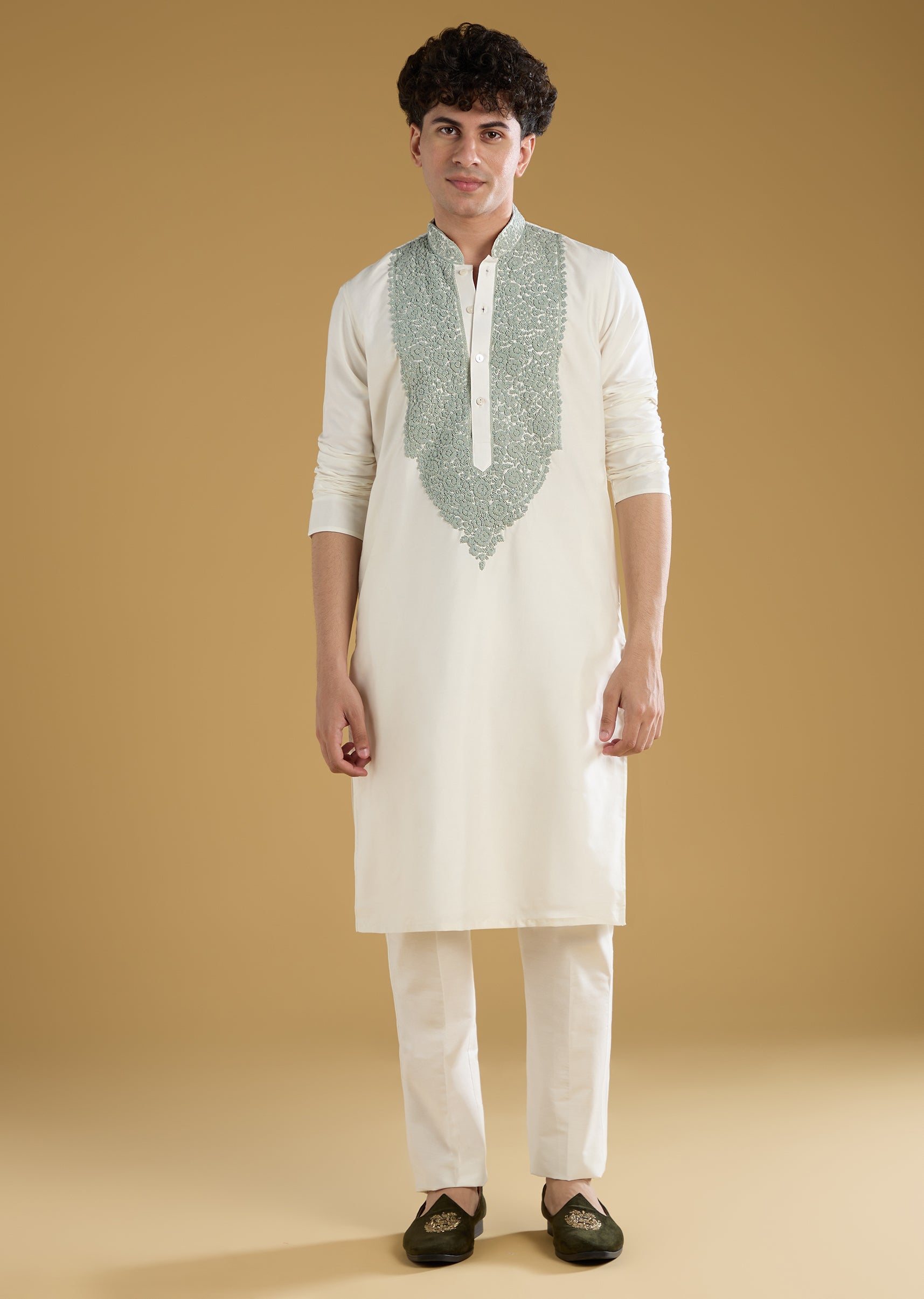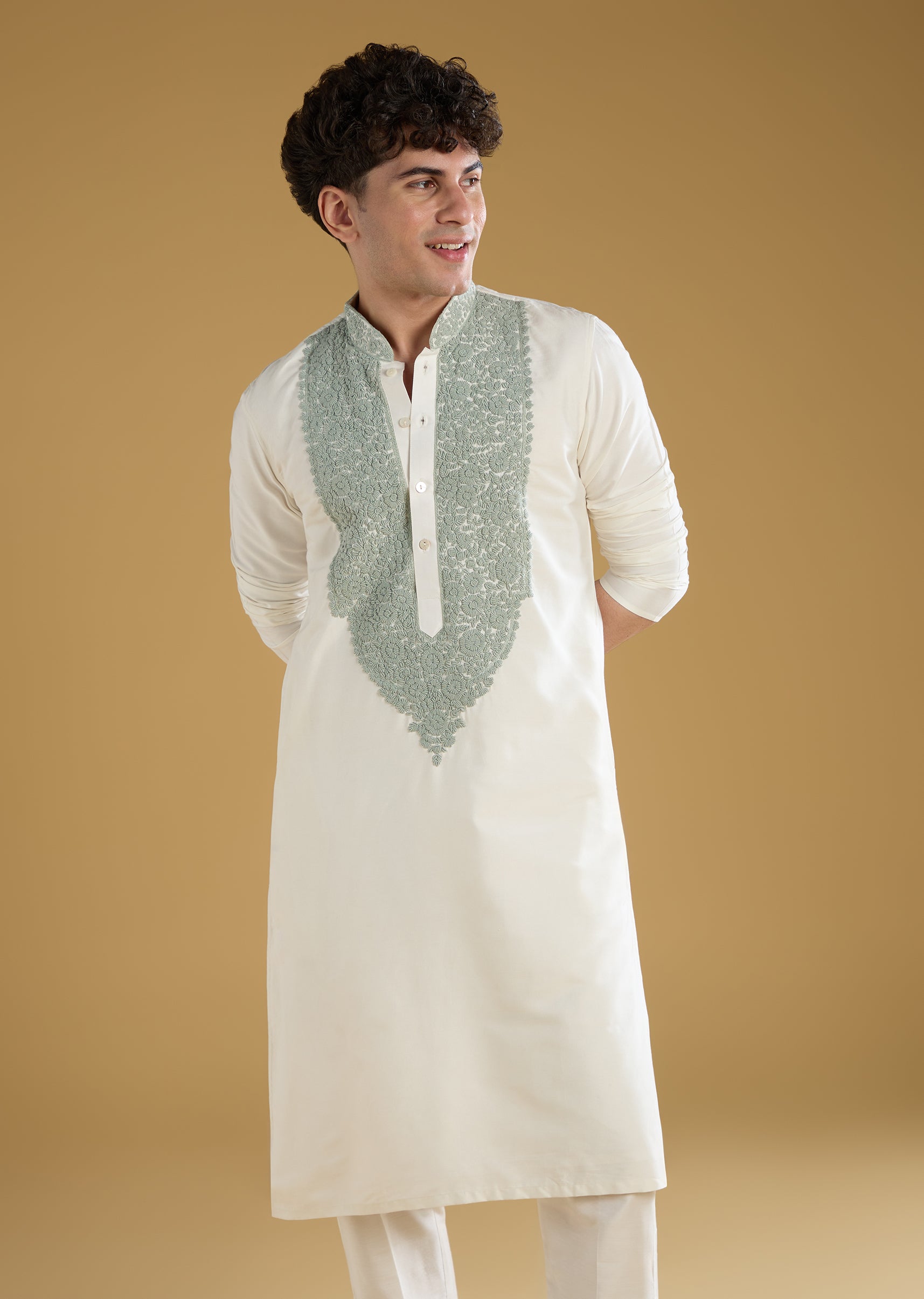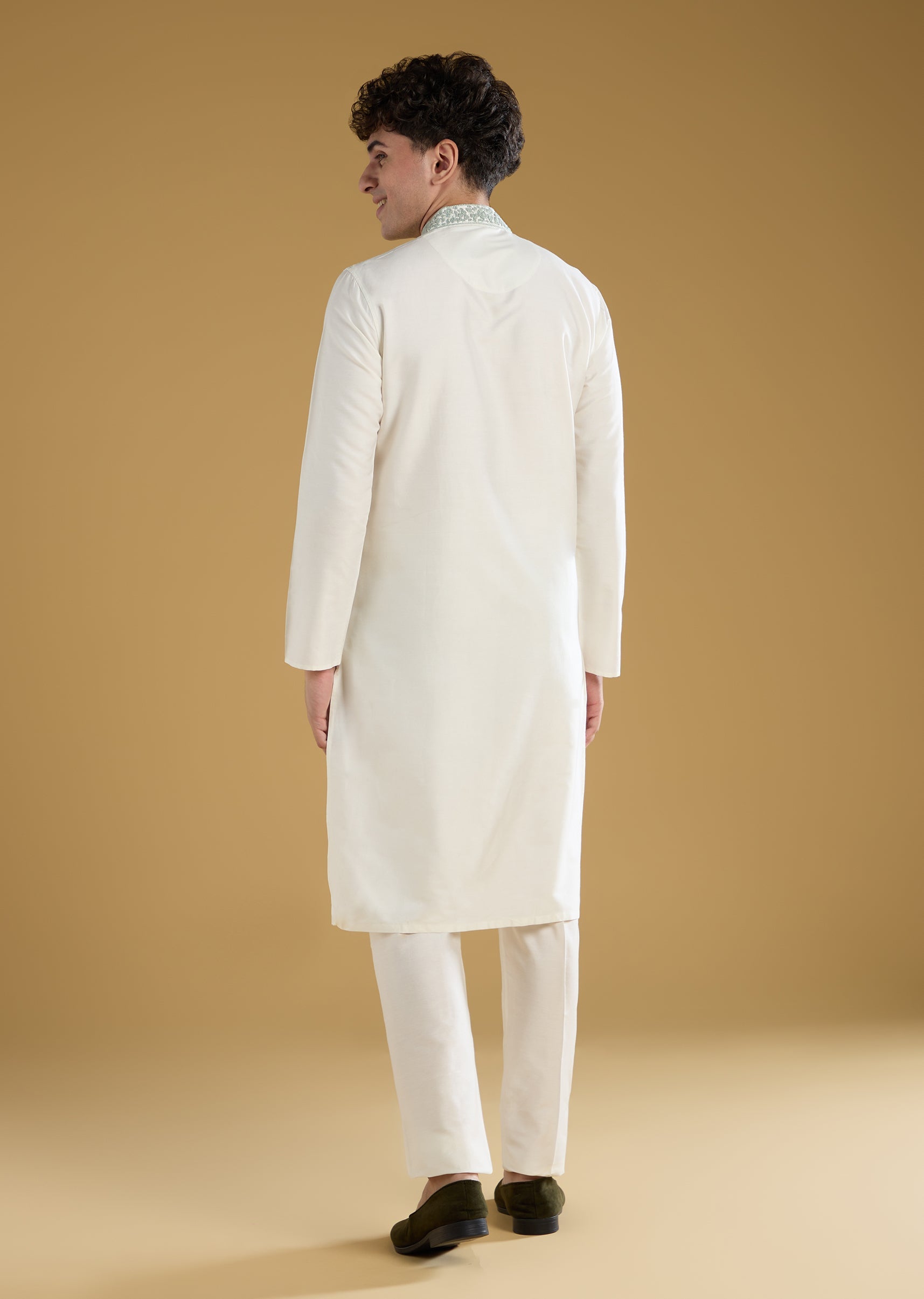This off white mens kurta set is crafted in luxurious banarasi fabric featuring delicate thread work for an elegant and festive appeal. Designed with full sleeves and a mandarin collar... More Product Details