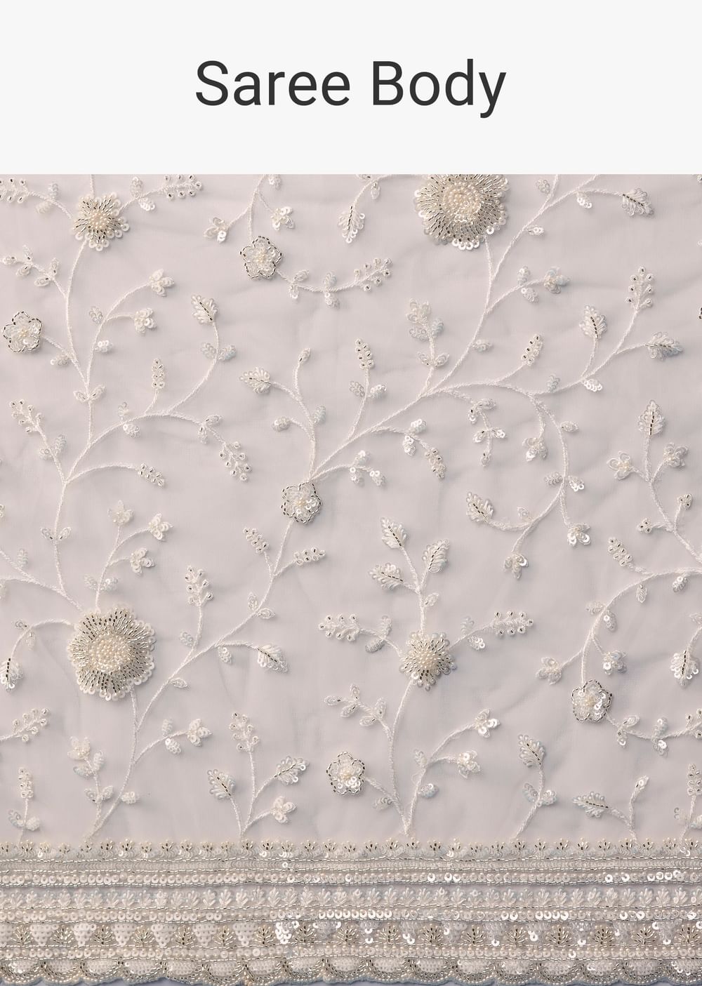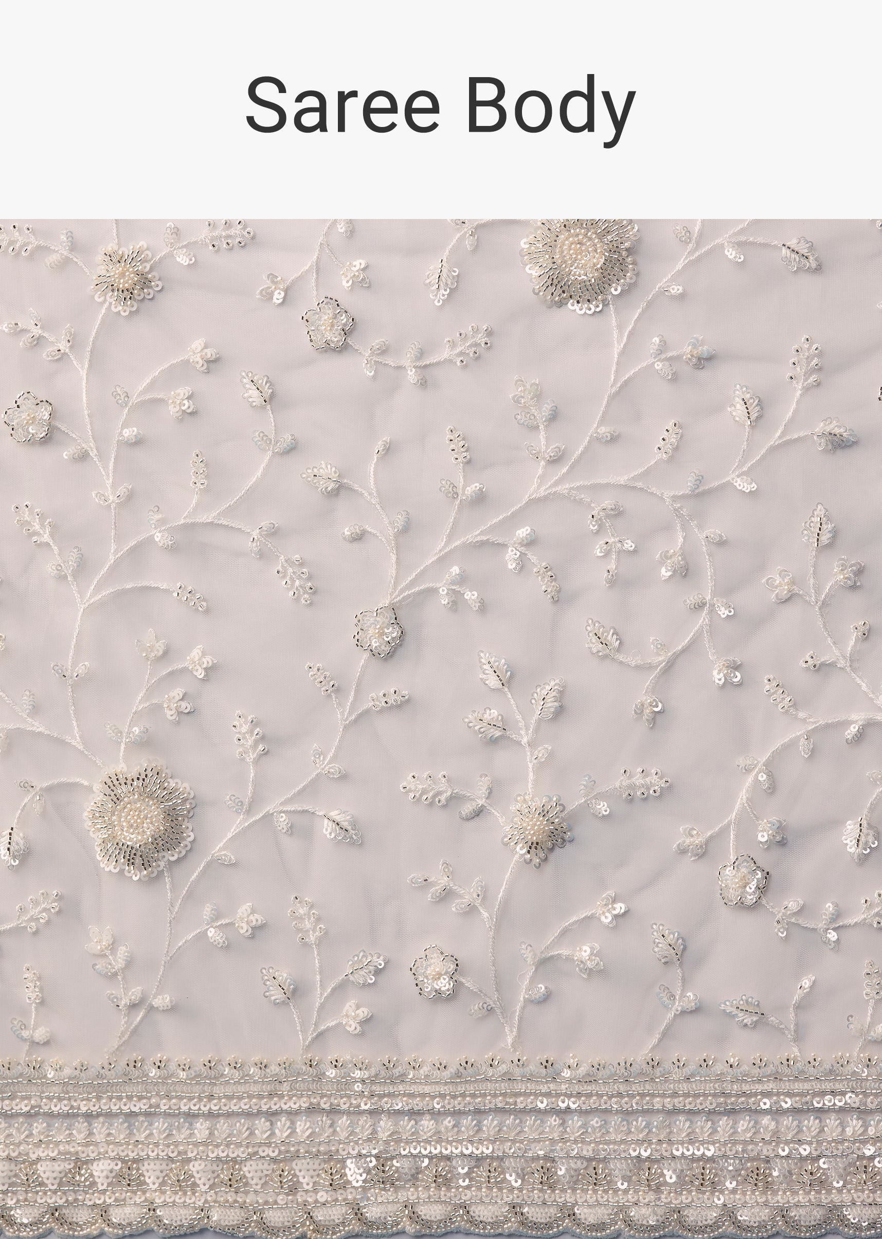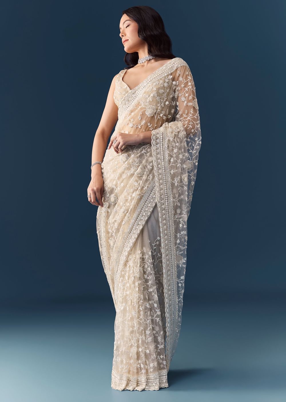 Off White Net Jaal Embellished Saree with Unstitched Blouse