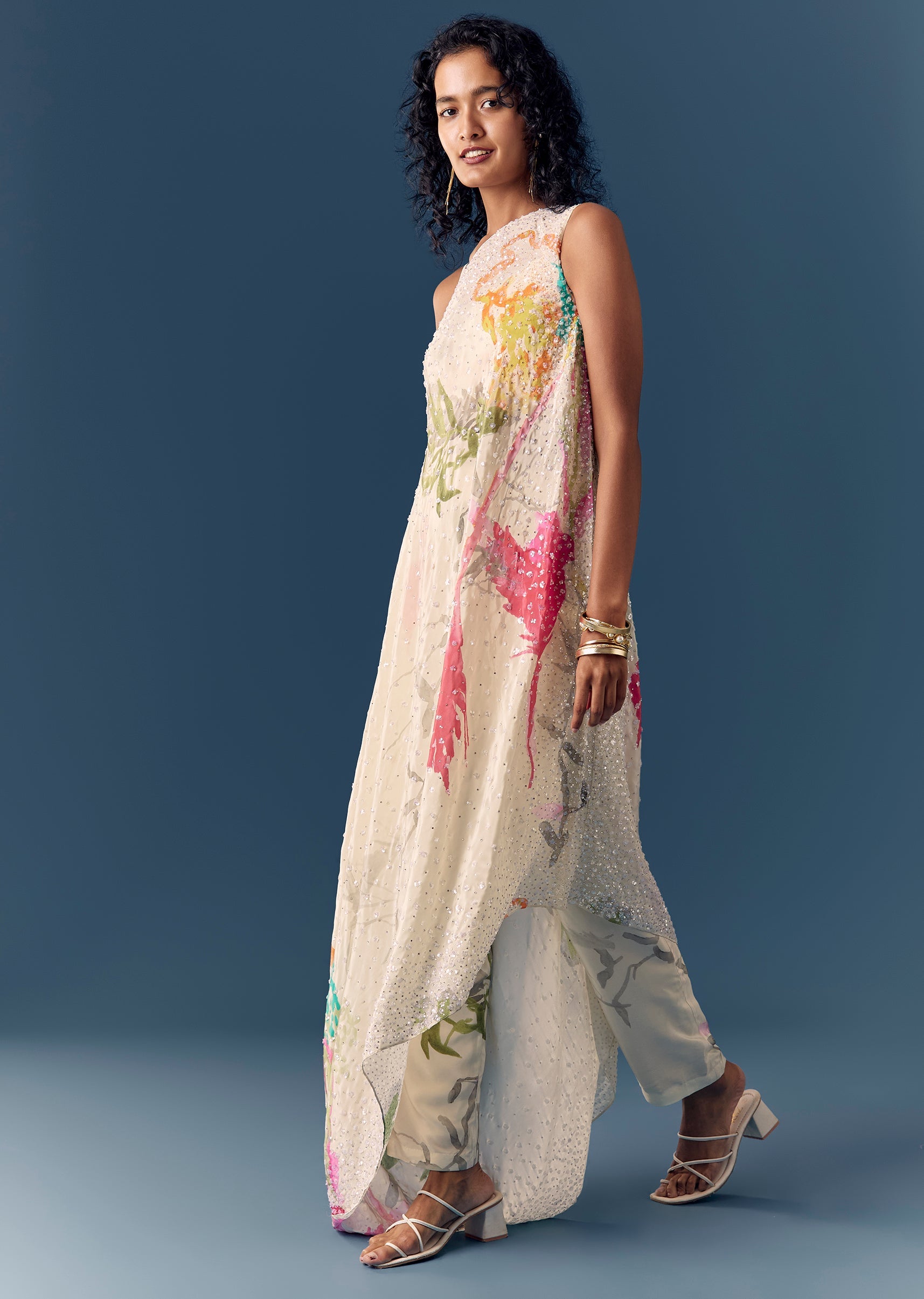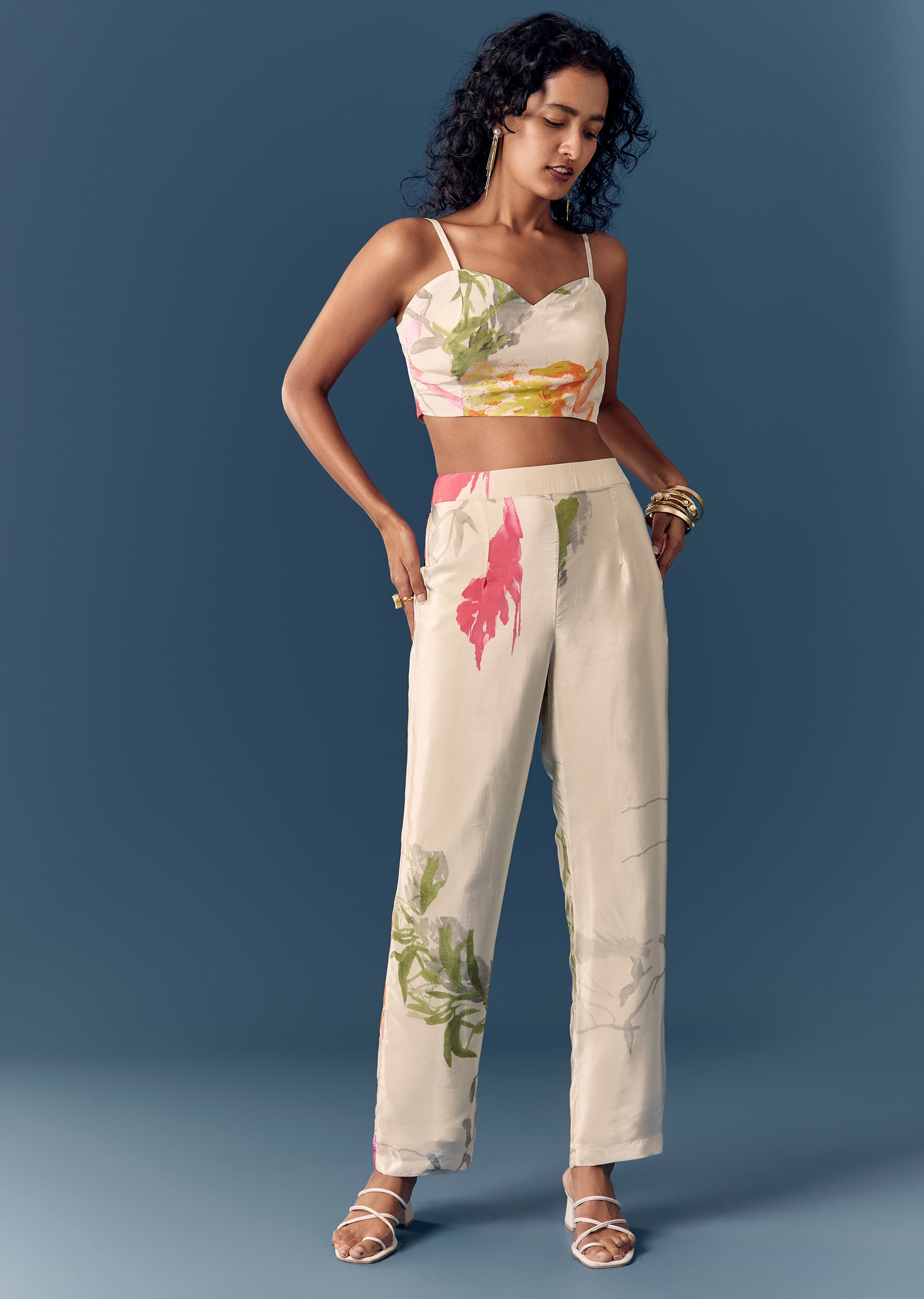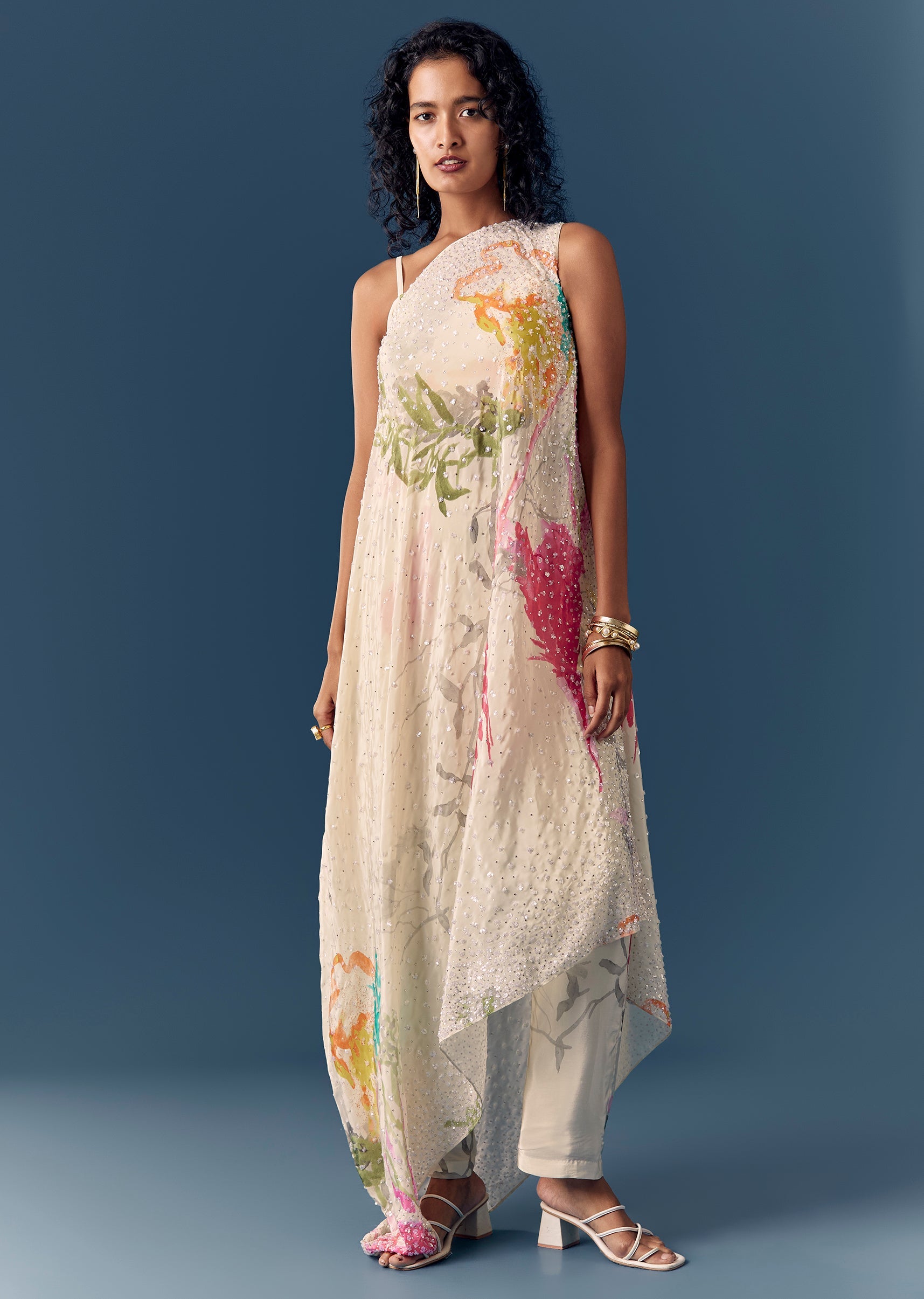 A statement festive co-ord set with floral print and sequin work featuring a one-shoulder top and straight pants. Side zip closure; designed for haldi/mehendi and festive events with a modern... More Product Details