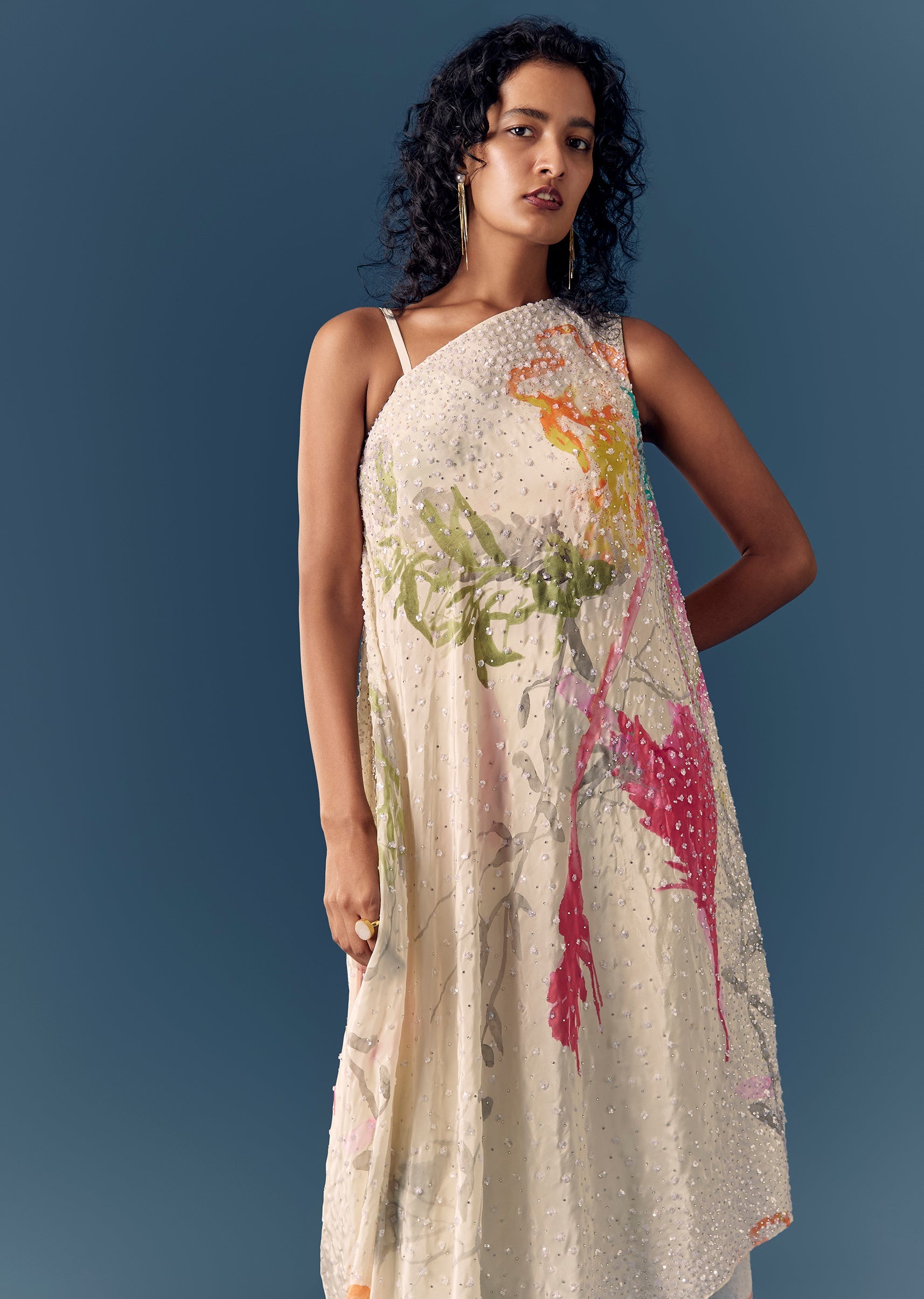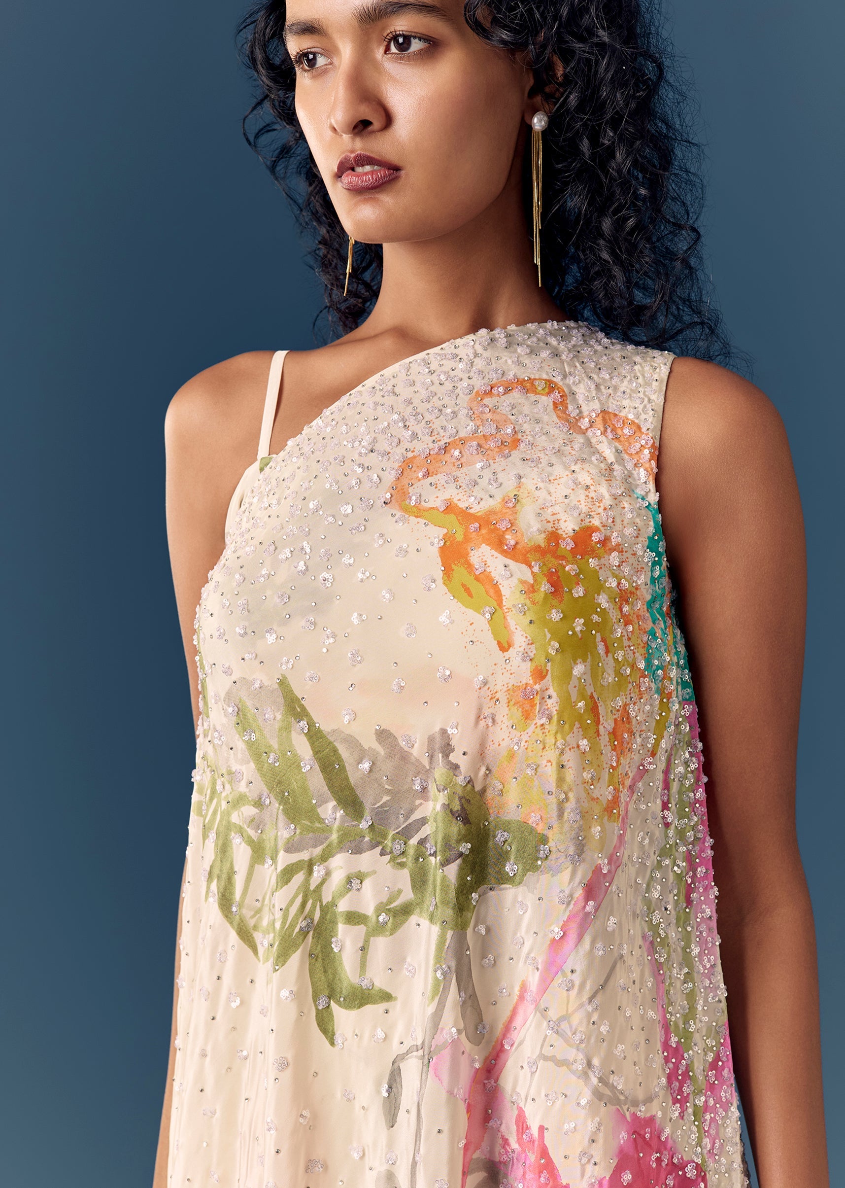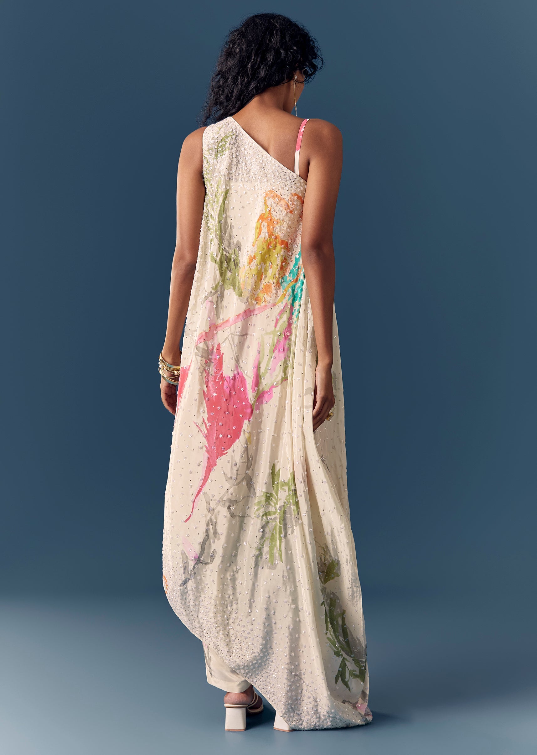 A statement festive co-ord set with floral print and sequin work featuring a one-shoulder top and straight pants. Side zip closure; designed for haldi/mehendi and festive events with a modern... More Product Details