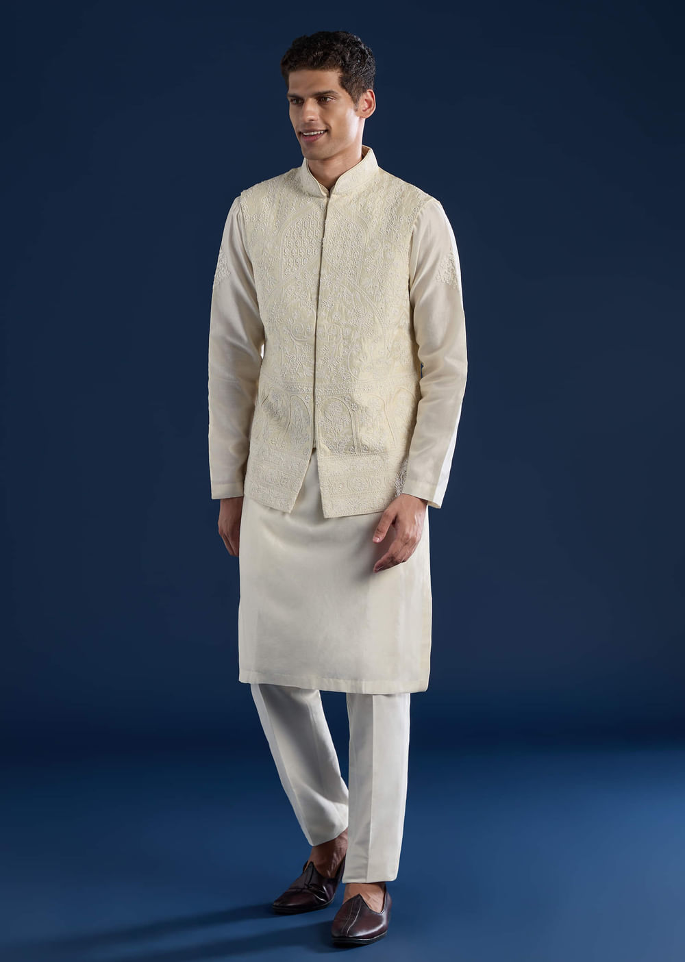 Exude timeless charm in this off white jacket and kurta set. Expertly tailored for a refined fit, the jacket features exquisite dori embroidery that adds depth and sophistication. The soft hue enhances its understated elegance. Paired with a kurta and classic pants, making it ideal for weddings, receptions, or refined evening celebrations. Awarded as the Most Trusted Brand, we're delivering styles you love, just as promised.