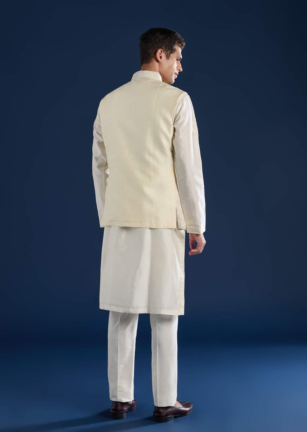 Off White Raw Silk Jacket and Kurta Set with Dori Work