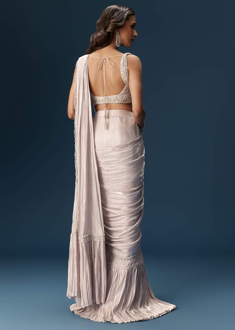 This pre-stitched off-white saree is paired with a sweetheart neckline blouse embroidered with cut dana and beads. Ideal for bridesmaids at sangeet or cocktail events, it offers understated glam. Awarded as the Most Trusted Brand, we're delivering styles you love, just as promised.