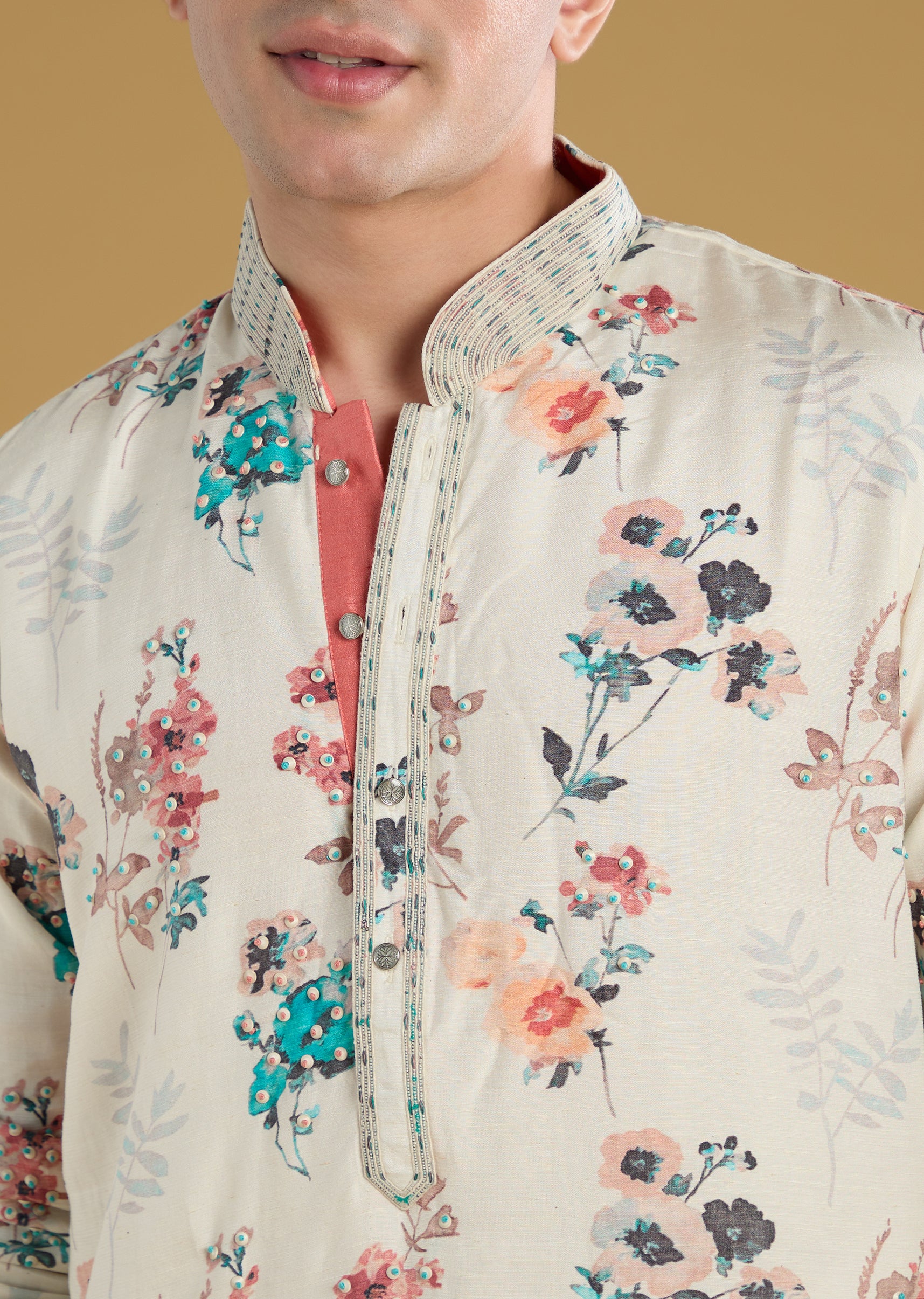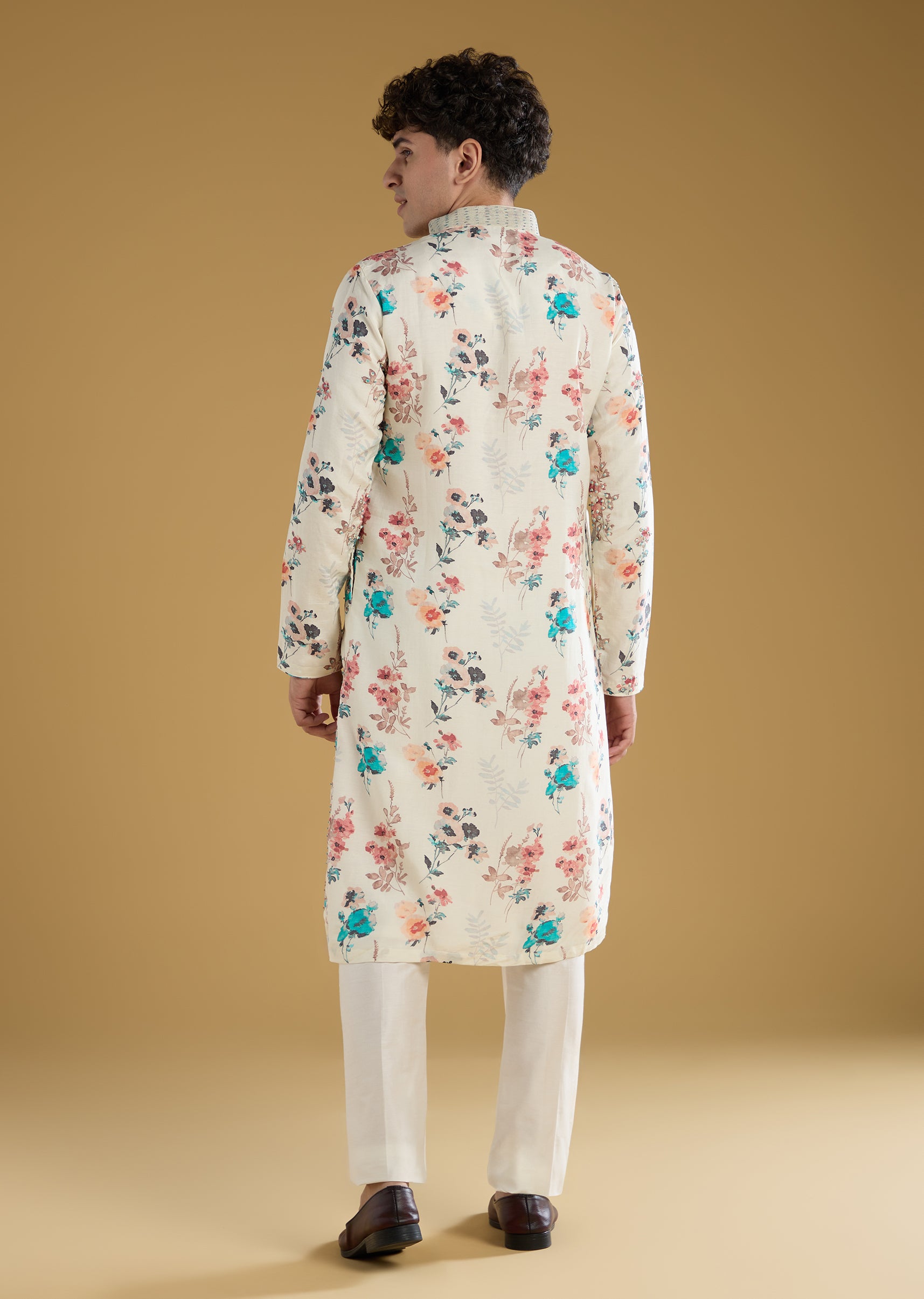 Off White Silk Linen Printed Kurta Set With Threadwork