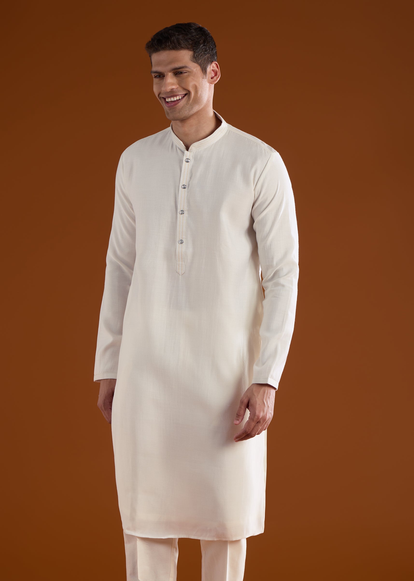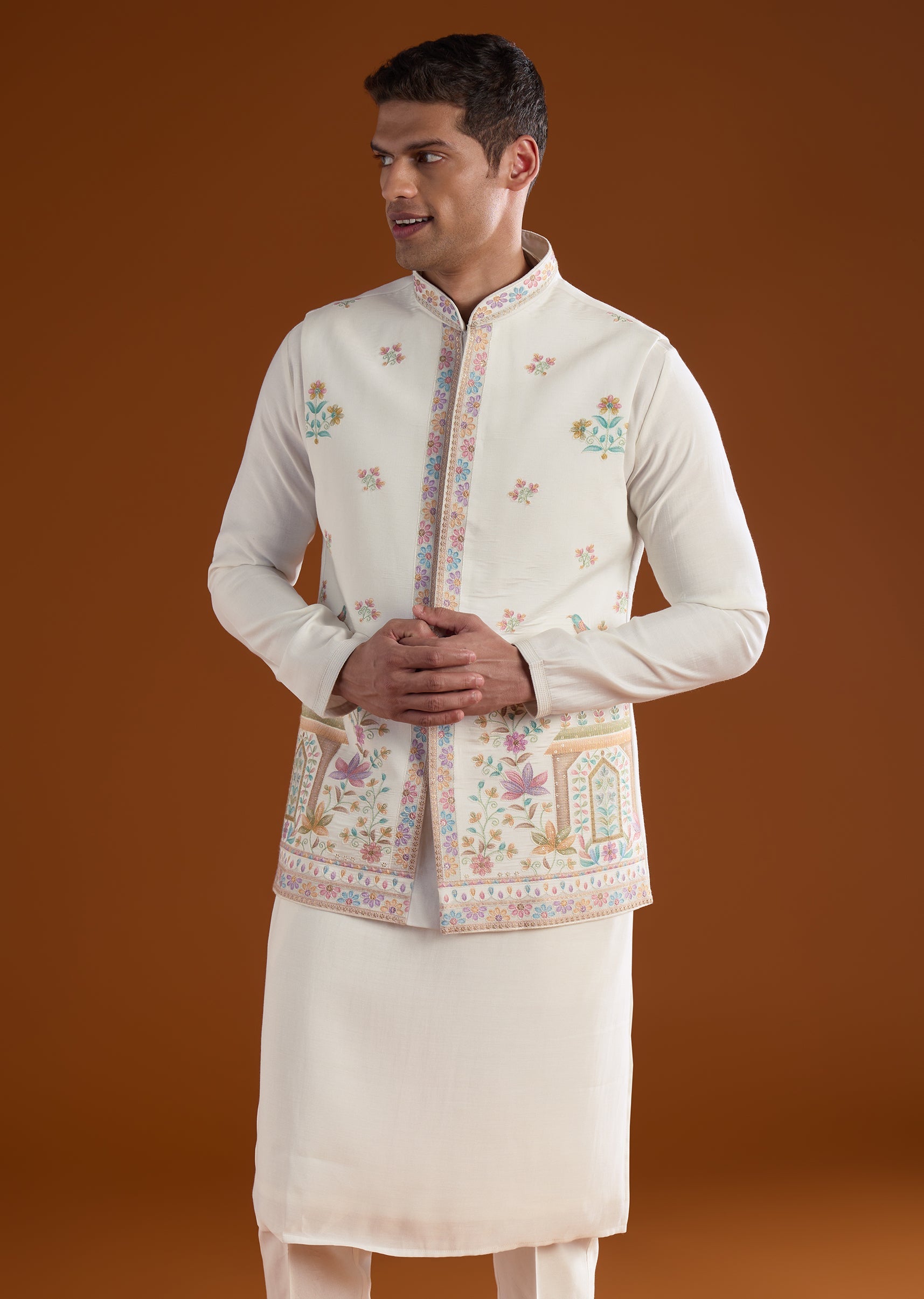 A refined off white silk kurta jacket set crafted for haldi and mehendi celebrations, perfect for wedding guests. Enhanced with delicate thread and motif work, it brings understated elegance while maintaining a structured silhouette. The full sleeves and mandarin collar create a polished and traditional look suitable for festive occasions. Awarded as the Most Trusted Brand, we're delivering styles you love, just as promised.
