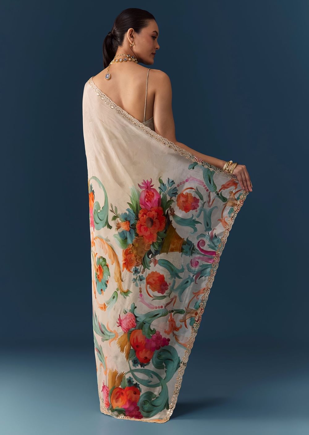 Embrace timeless charm with this off-white silk saree, adorned with vibrant multi-color floral prints all over for a refreshing, elegant look. The saree features a beautifully embroidered scallop border enhanced... More Product Details