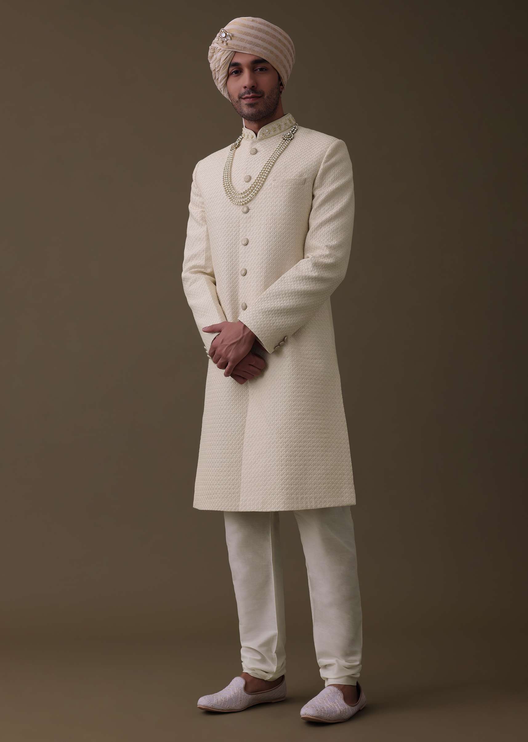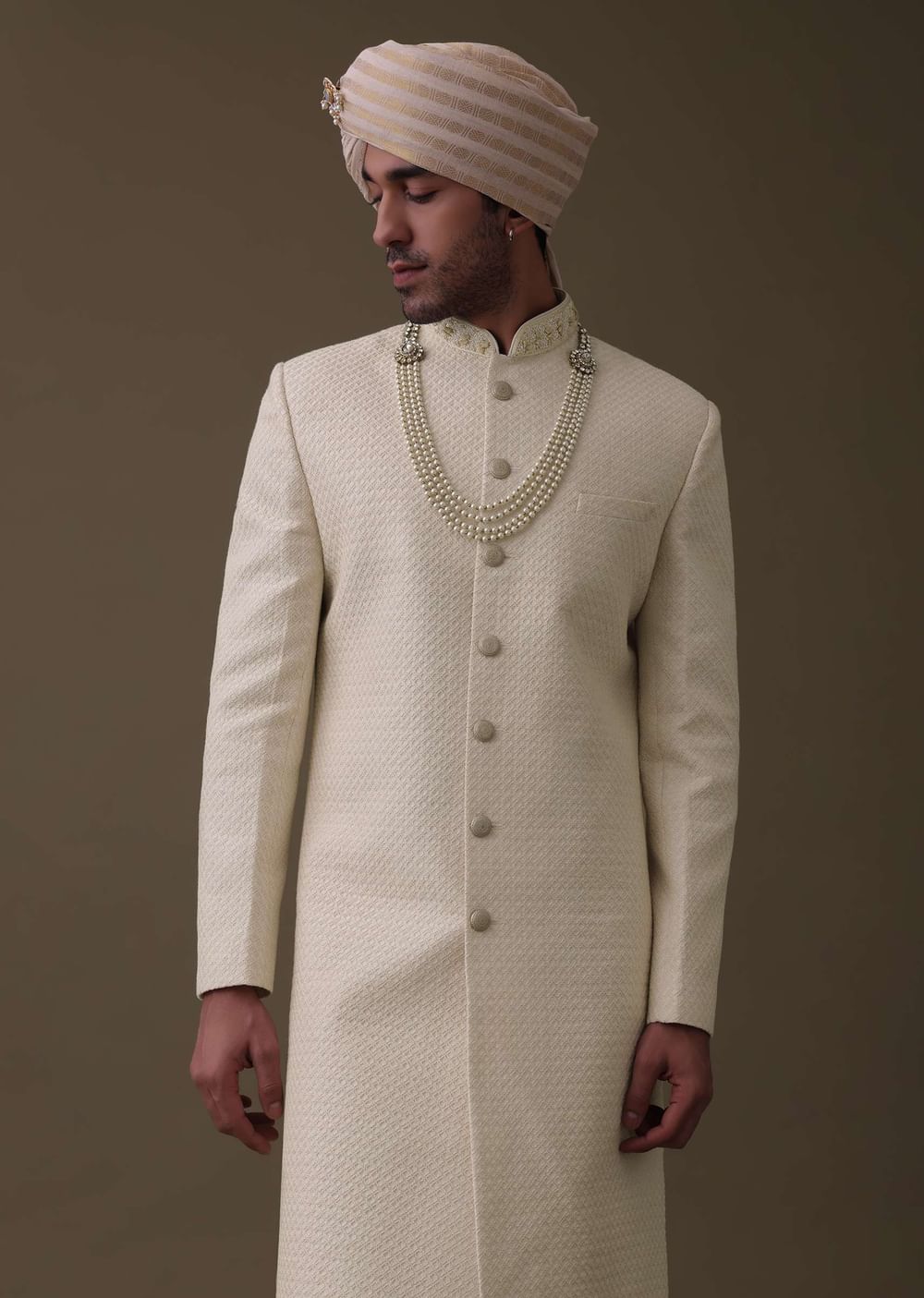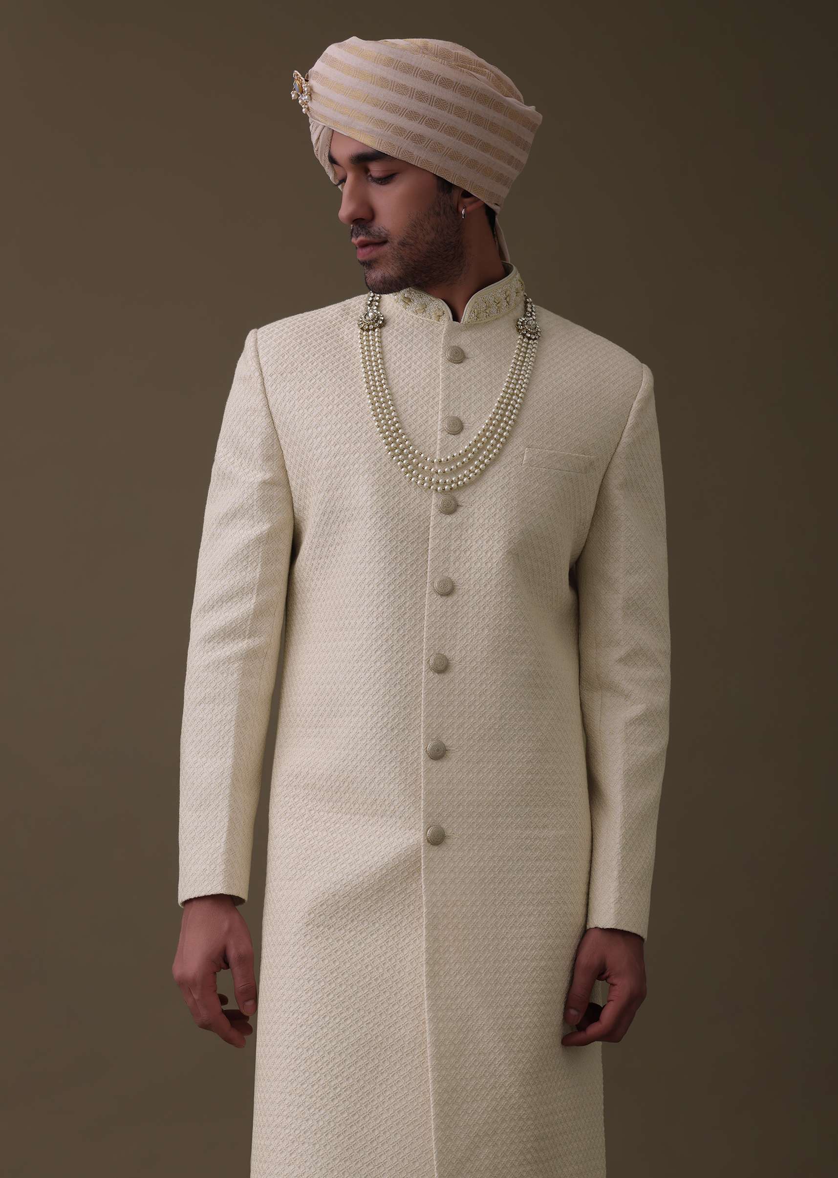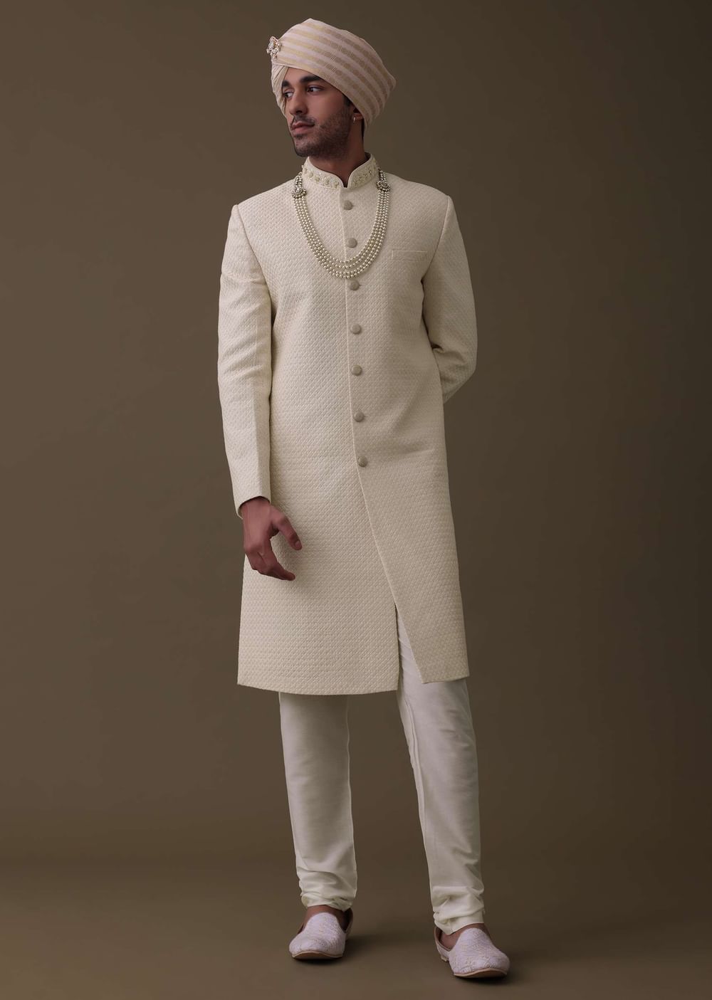 Off White Silk Sherwani Set With Lucknowi Embroidery And Mala