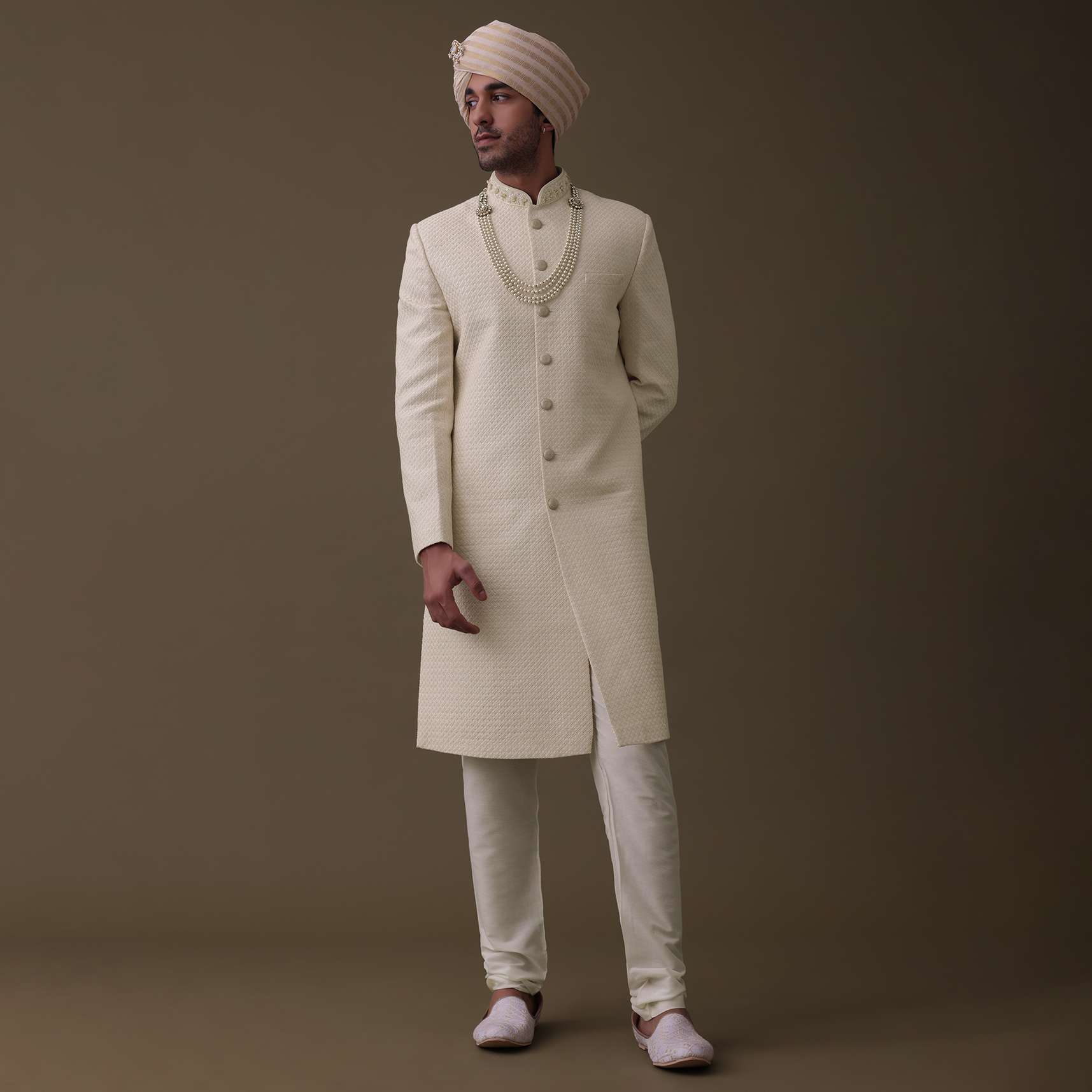 Introducing our luxurious sherwani set, crafted with premium silk fabric. The exquisite Lucknowi embroidery adds a touch of grandeur and luxury to the overall design. The sherwani comes in a mandarin collar neckline with full sleeves. The set includes a matching mala and a comfortable churidar, ensuring a coordinated and complete look. EVENT - Perfect for weddings and receptions. NOTE - Buttons and accessories may vary in color, shape, and size.Change folds regularly. Awarded as the Most Trusted Brand, we're delivering styles you love, just as promised.