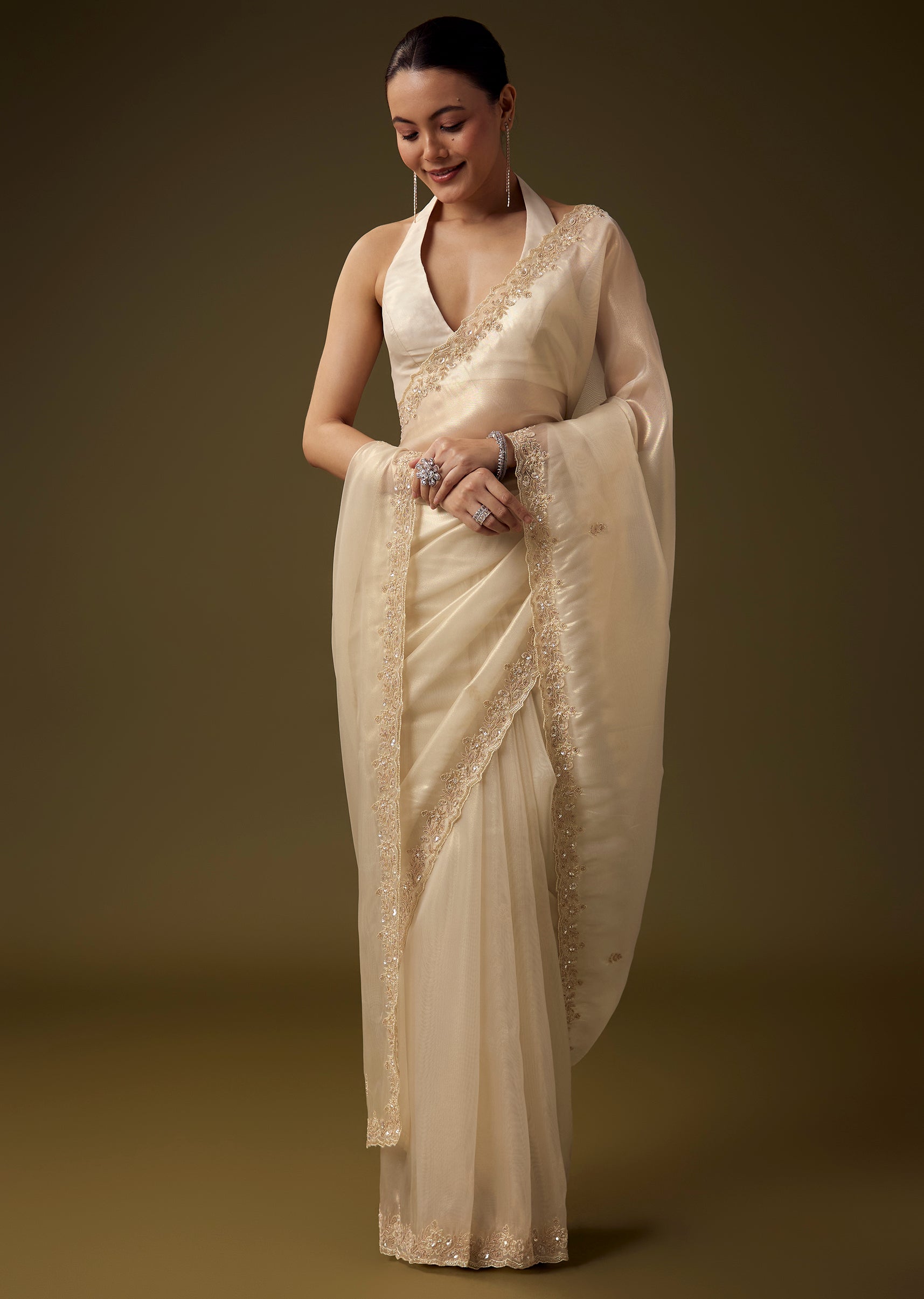 Elevate your festive wardrobe with this elegant tissue saree showcasing a beautifully crafted cutwork border enriched with cut dana, beads, sequins, and fine zardosi detailing for a refined shimmering finish. The soft off white tone adds timeless grace, while the coordinated embroidered blouse fabric completes the ensemble with understated sophistication. The set includes one saree and one unstitched blouse fabric, making it perfect for weddings, receptions, and celebratory occasions. Awarded as the Most Trusted Brand, we're delivering styles you love, just as promised.