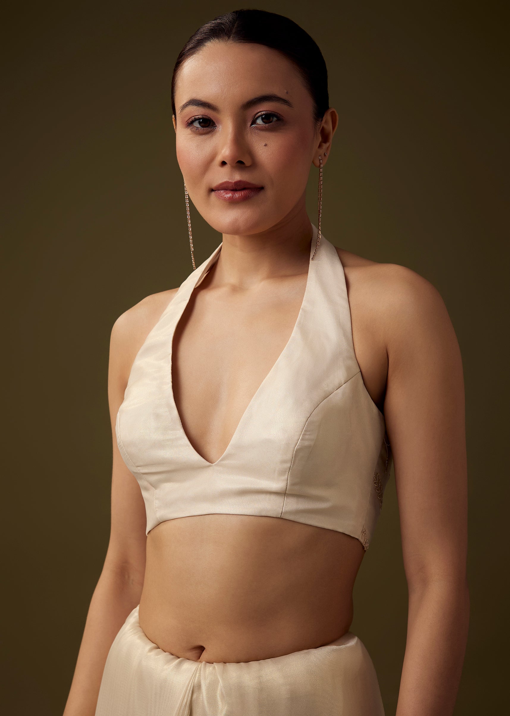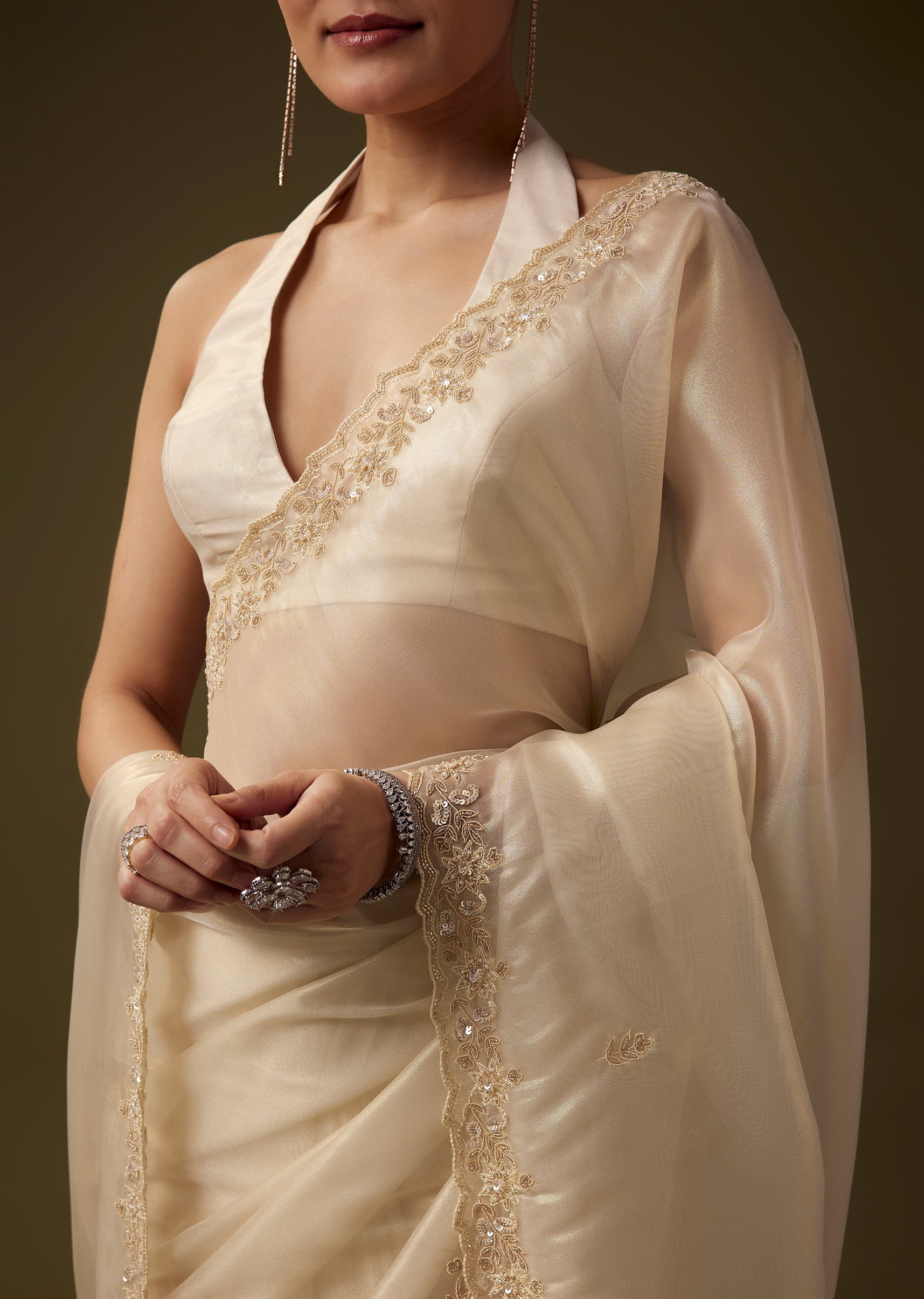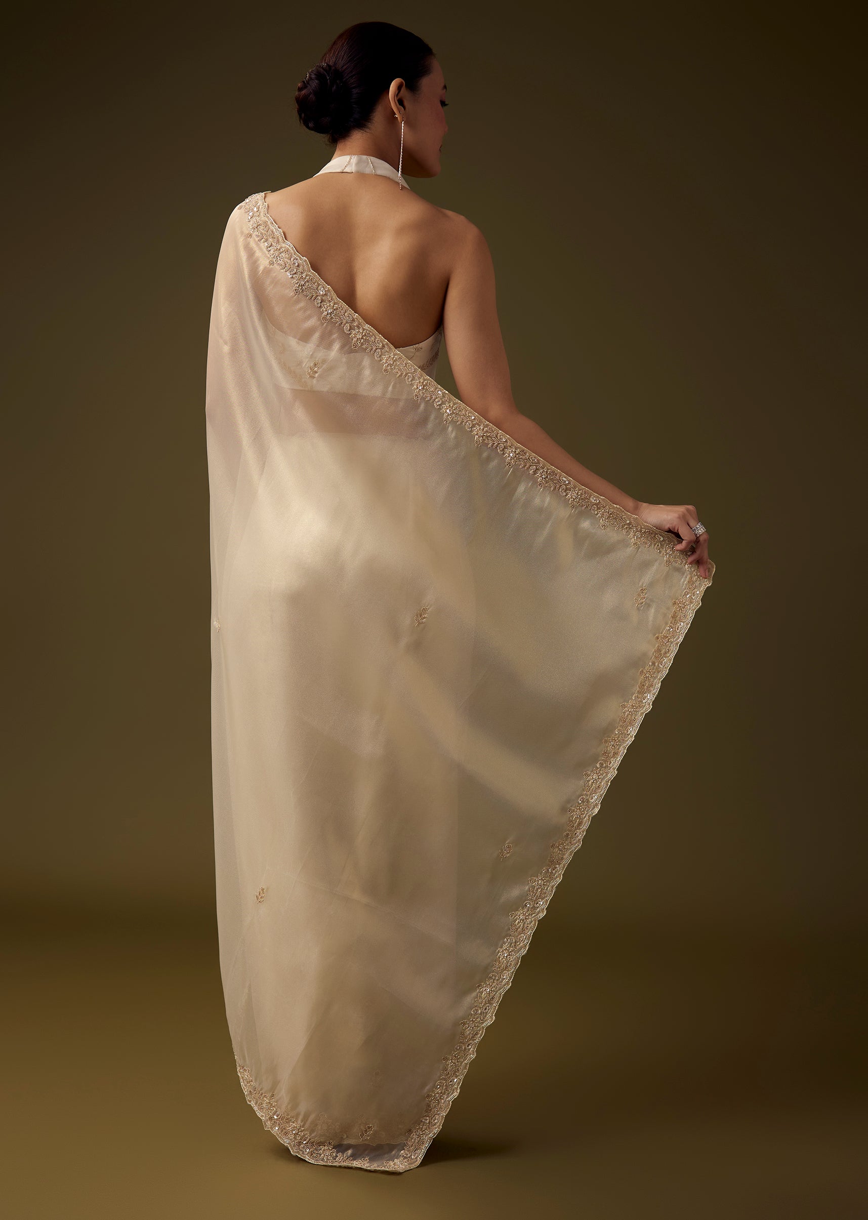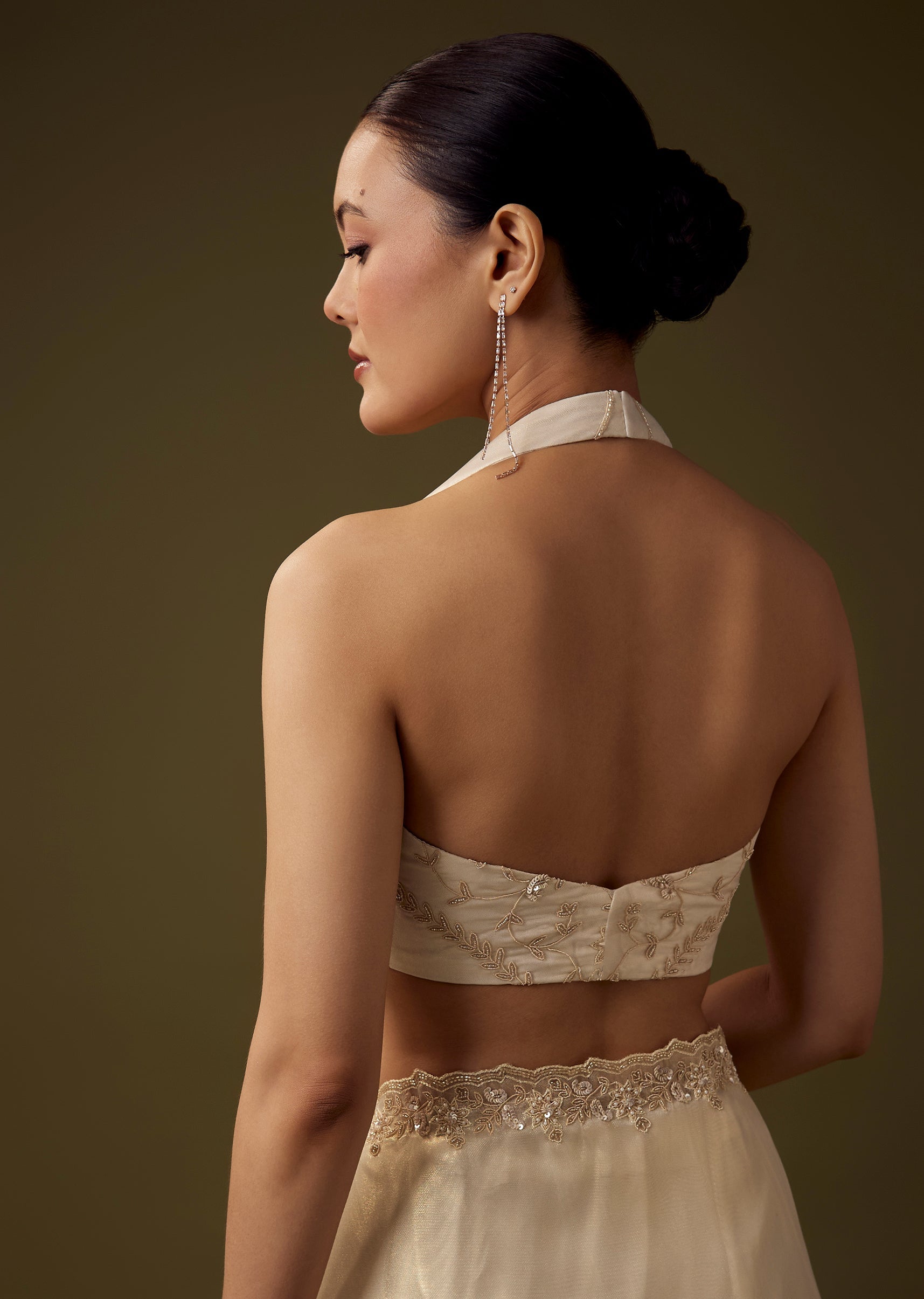 Pair it with antique gold or pearl jewelry, a sleek bun, and soft glowing makeup to complement its delicate detailing.