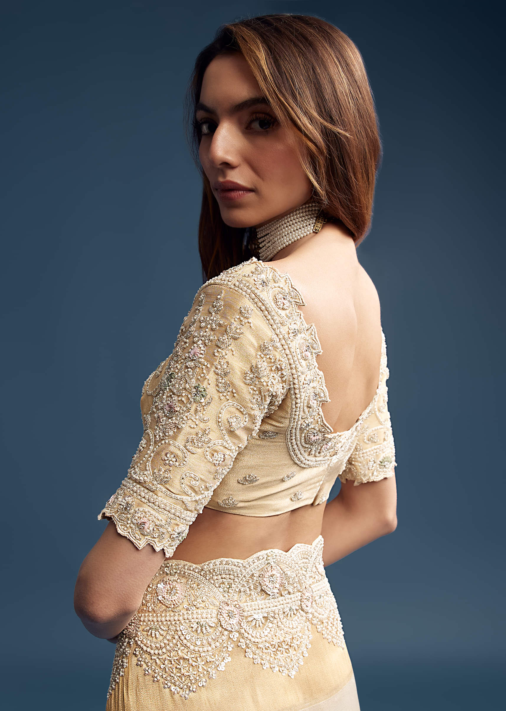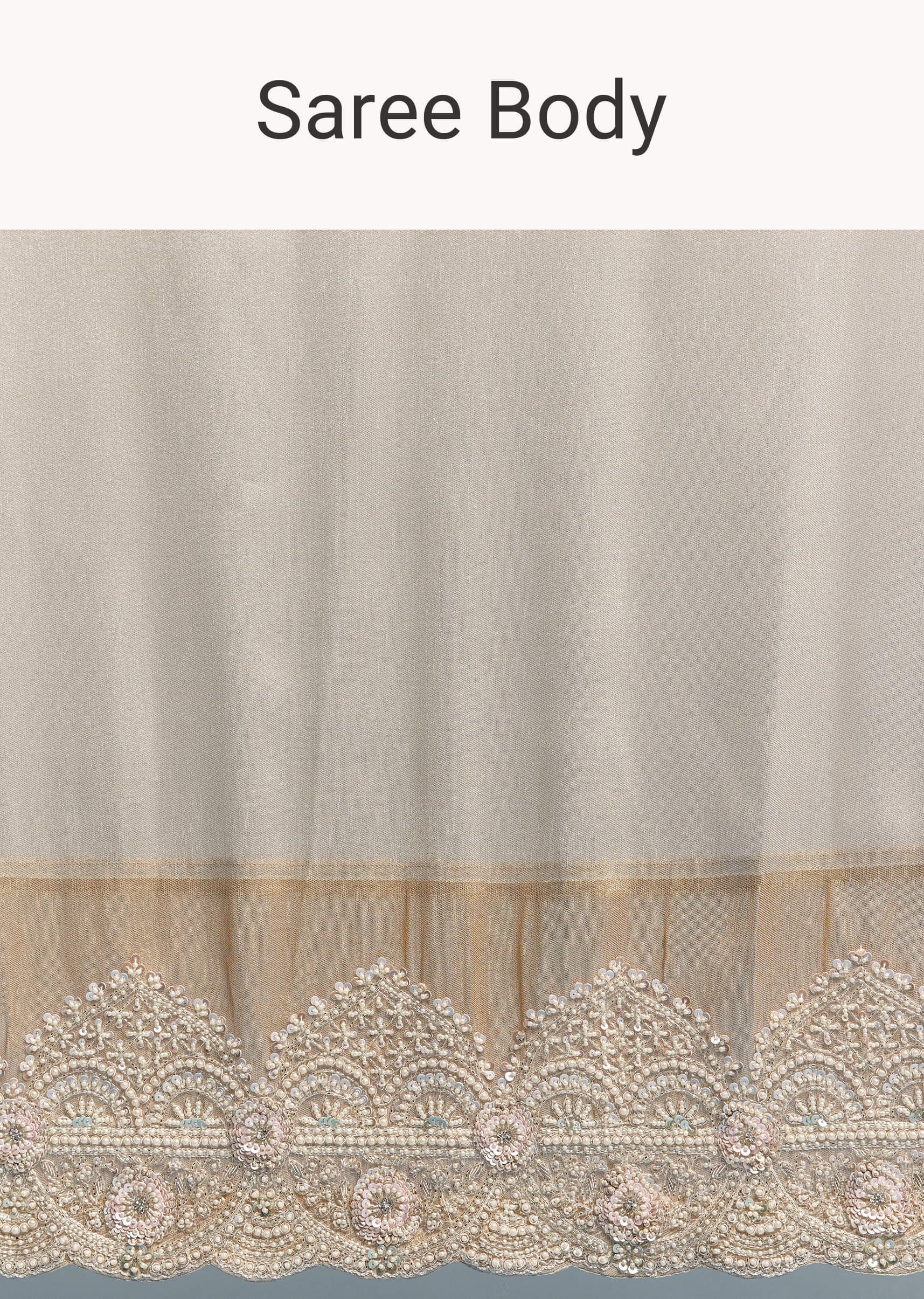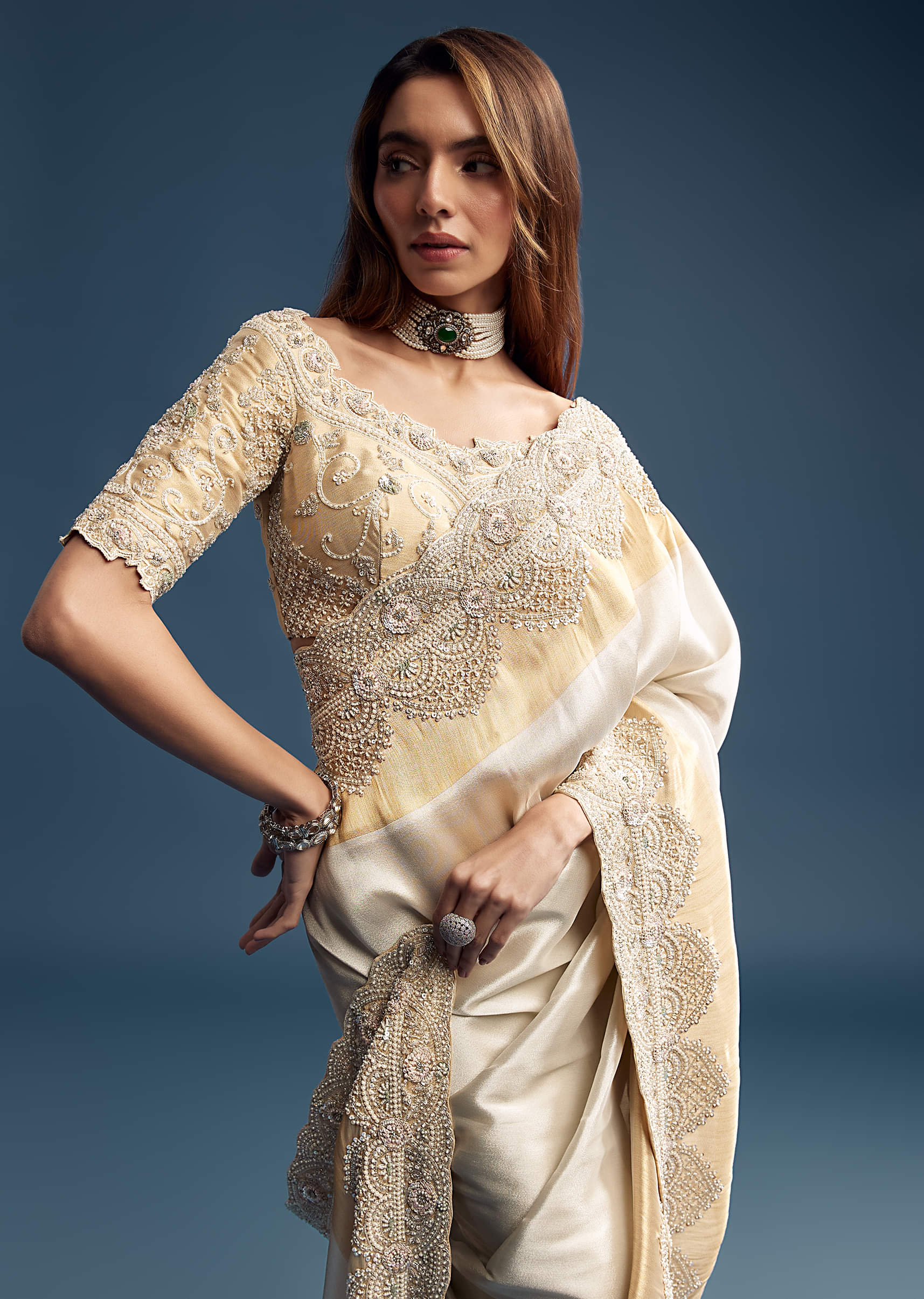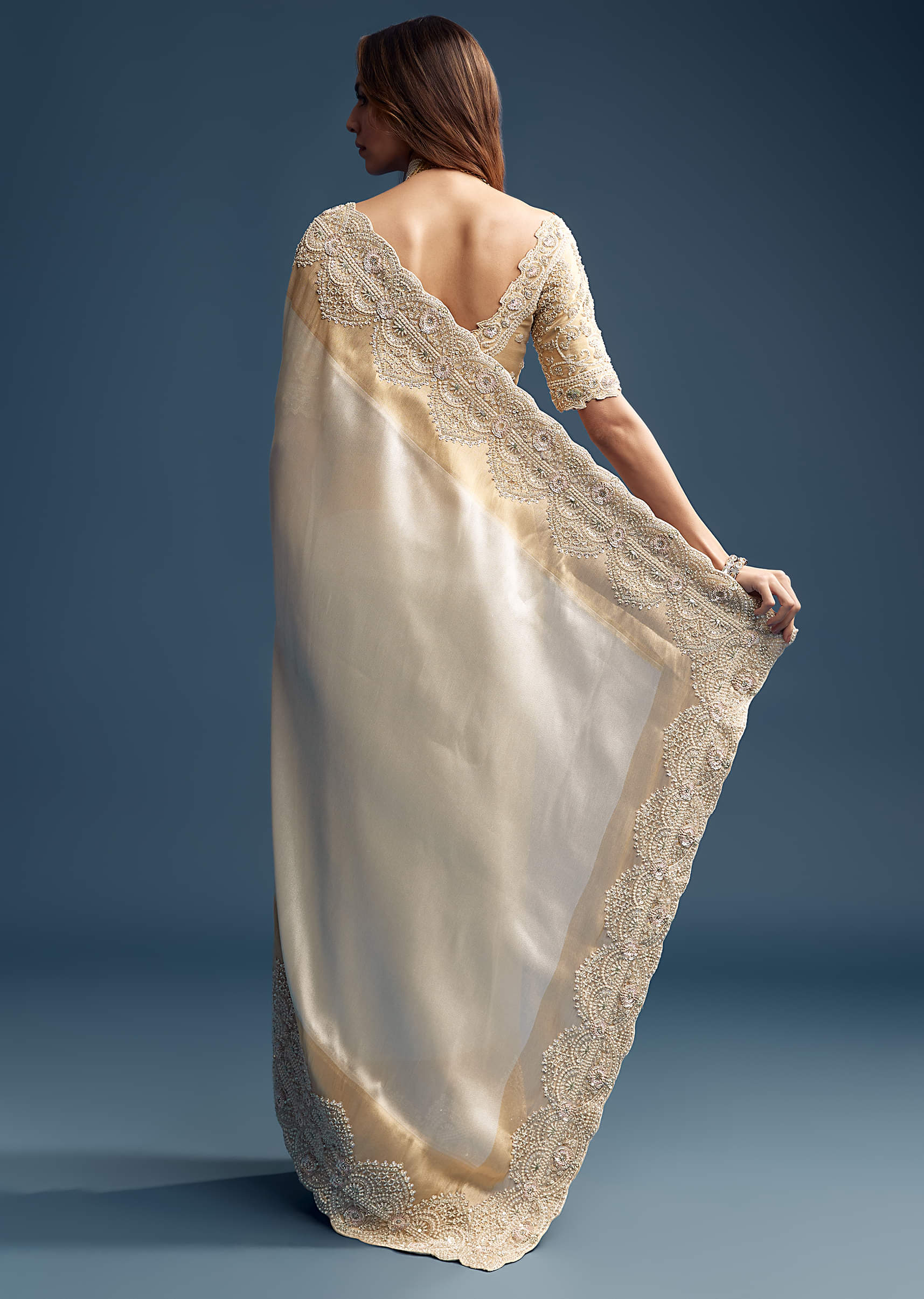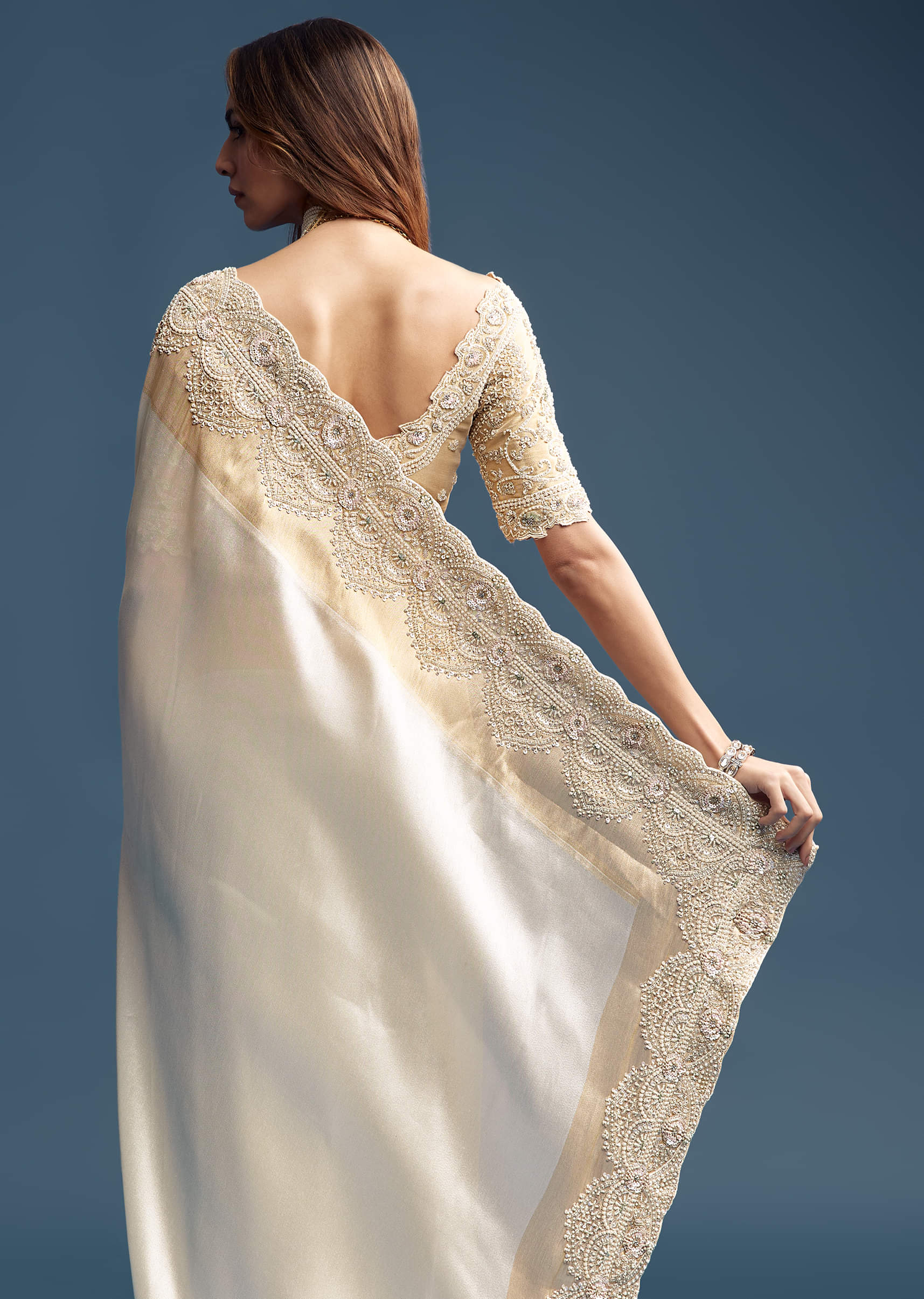 A soft off-white tissue silk saree edged with golden zari gets a dramatic twist through a richly embroidered border and blouse, studded with cutdana, sequins, beads, and moti. It’s quiet... More Product Details